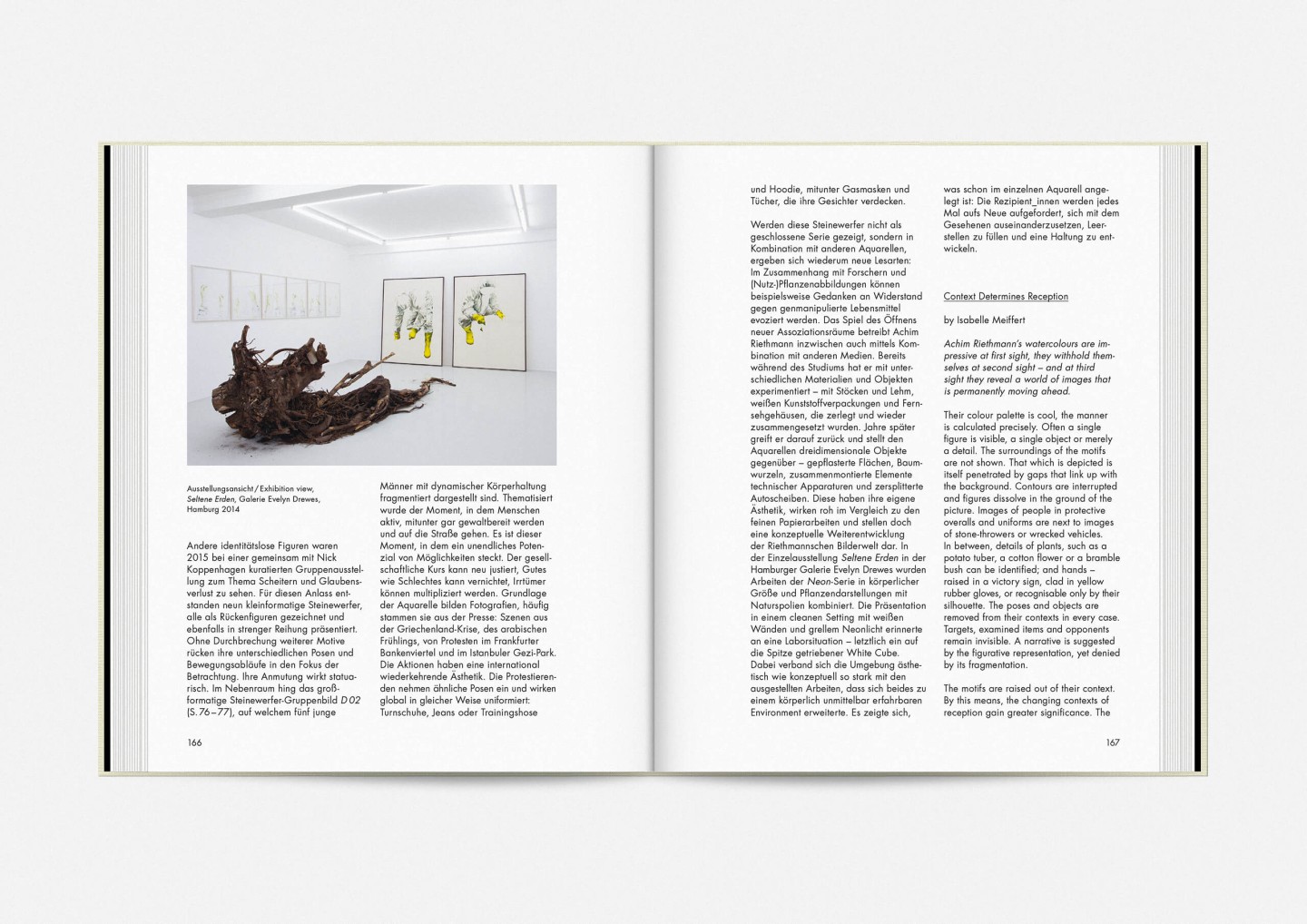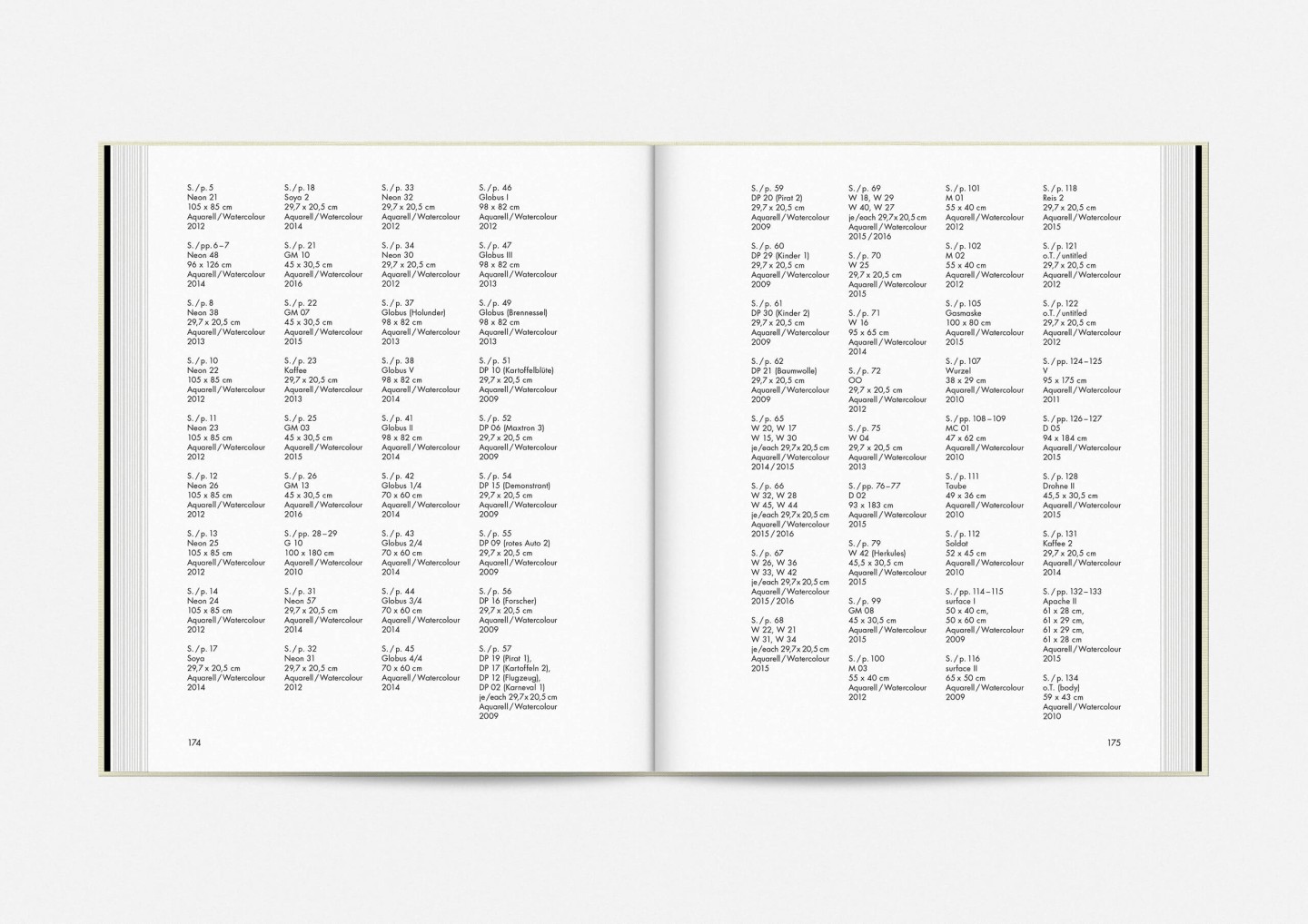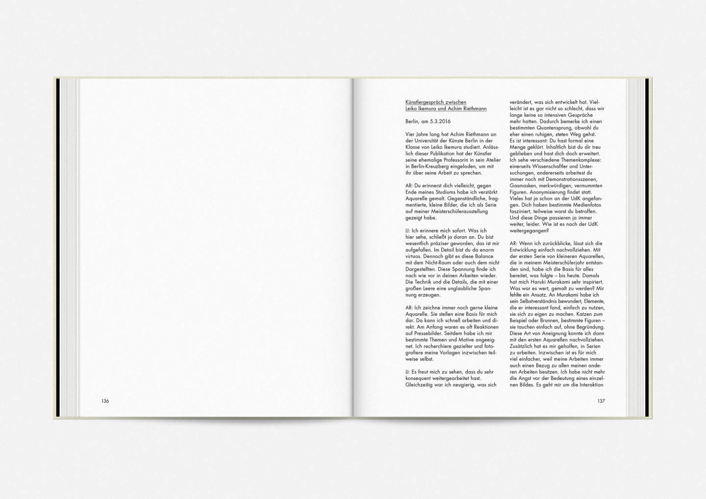 The book »ASR 09/16«, published by DISTANZ Verlag, is a compilation of watercolors and installations by Berlin artist Achim Riethmann from the past years. Consistent with the principle of omission and reduction characteristic of his oeuvre, Riethmann's works appear both framed by and levitating above the book's clean white pages. The book itself as an object disappears behind the artwork it presents. It also concentrates all additional information – work titles and accompanying essays, all set in classic, unobtrusive Futura – on its last pages.