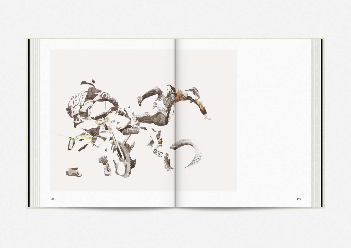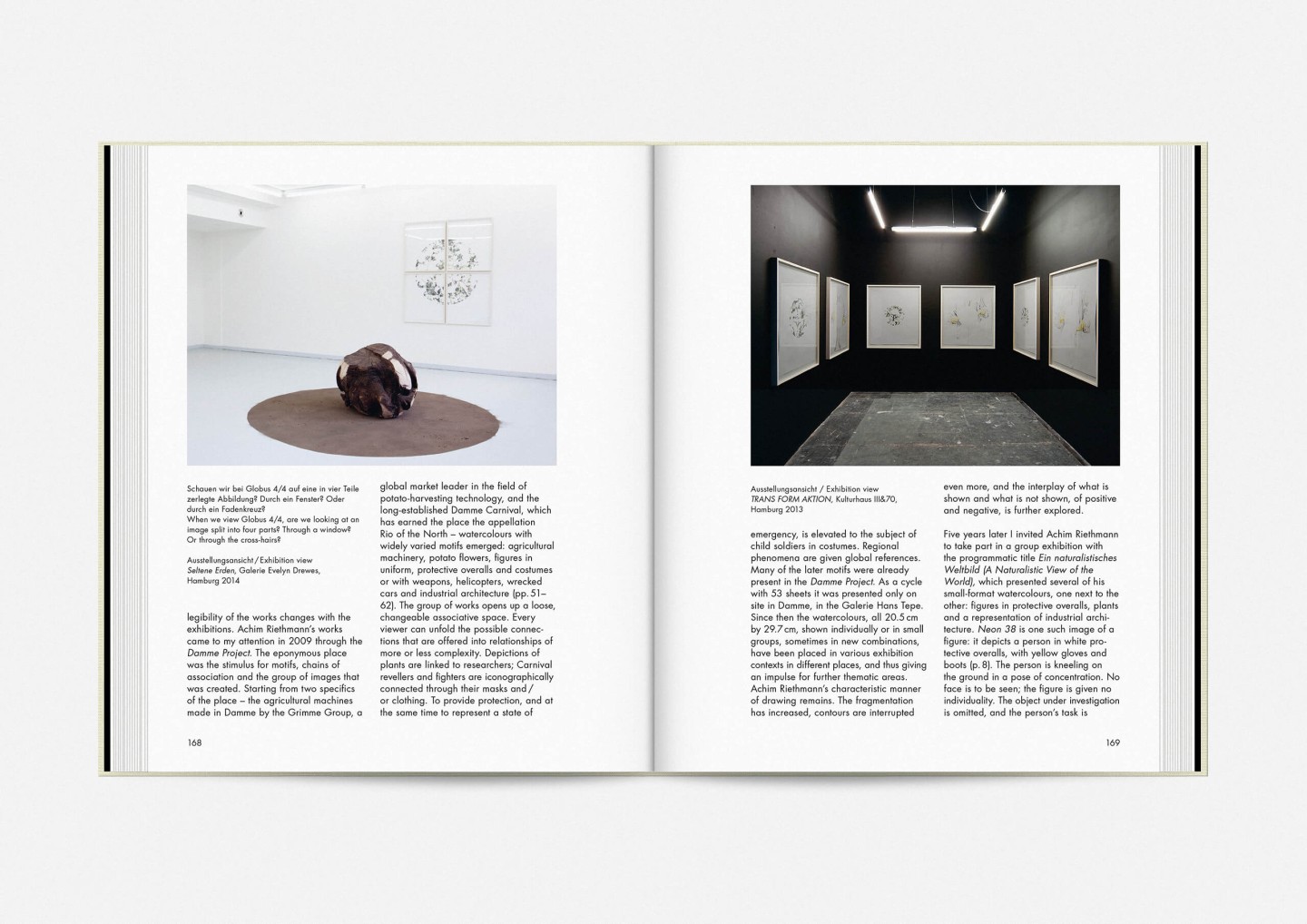 The reproductions of the artist’s series of fine works on paper are interspersed with black-and-white photos of his three-dimensional objects, with the somewhat more experimental, »workshop« character of the latter being mirrored by the use of uncoated paper in the book. The result is a printed retrospective that, thanks to its clean, laboratory-like setting, allows readers to directly enter artist Achim Riethmann's visual world.