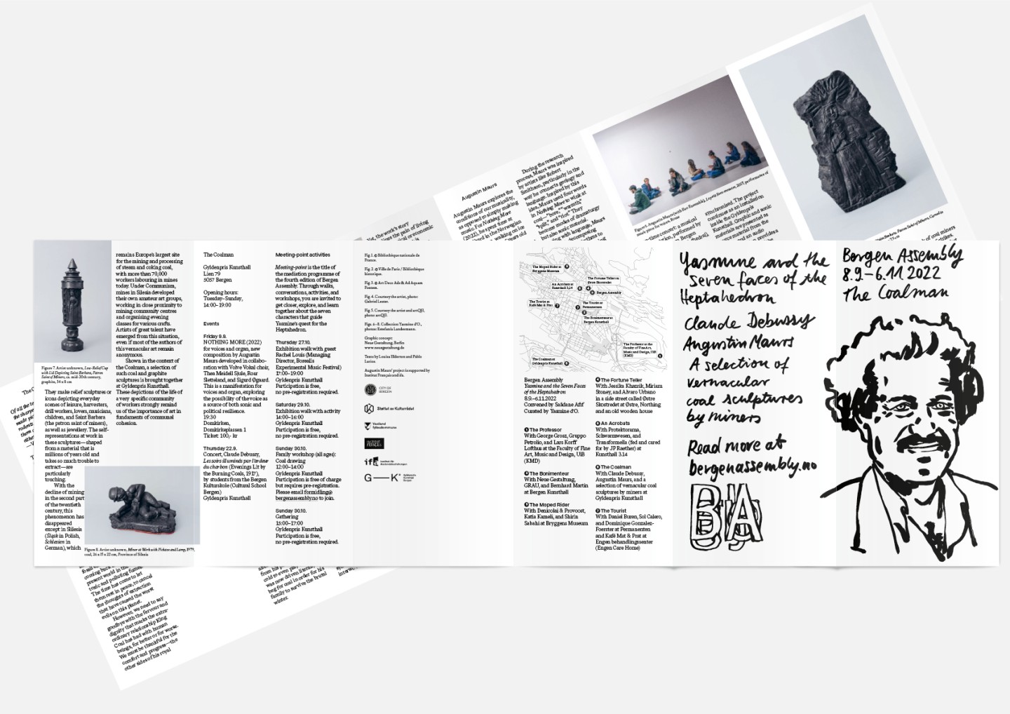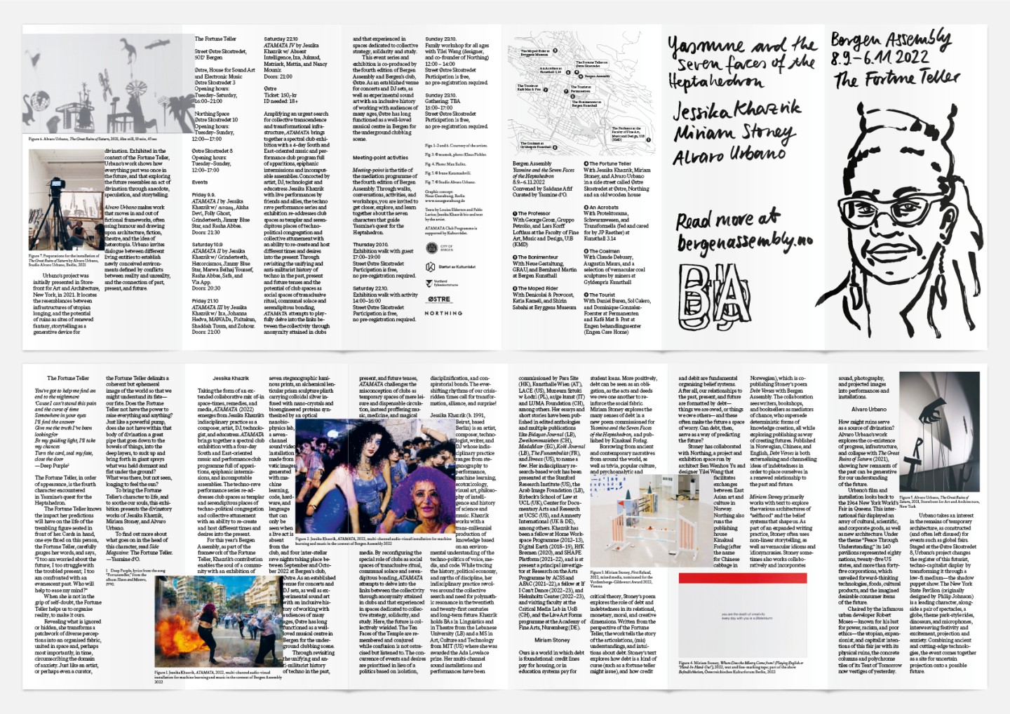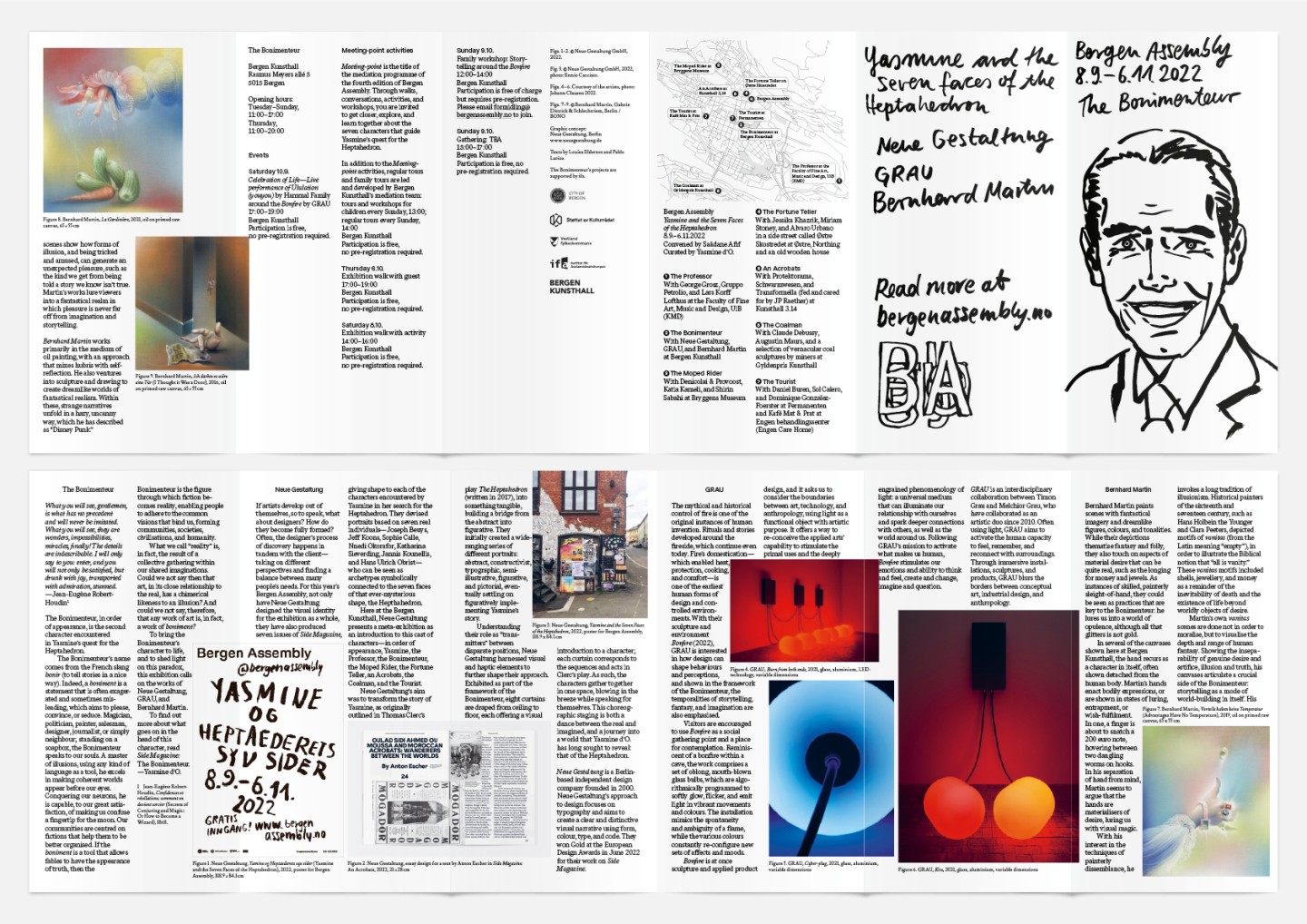 From September 8 to November 6, 2022, Bergen Assembly showcased these character-inspired exhibitions, each offering three artistic perspectives. "The Heptahedron" publication includes eight issues of Side Magazine: seven document each character's research, and an eighth serves as an exhibition catalog. This cohesive approach provided an immersive experience unified by the Heptahedron's concept.