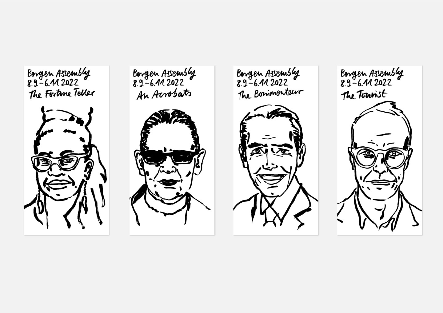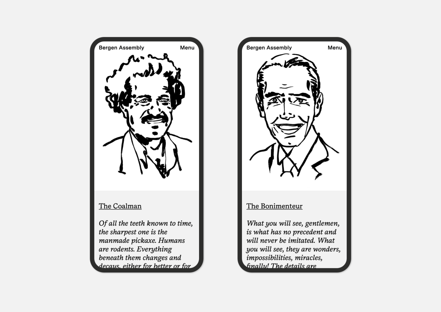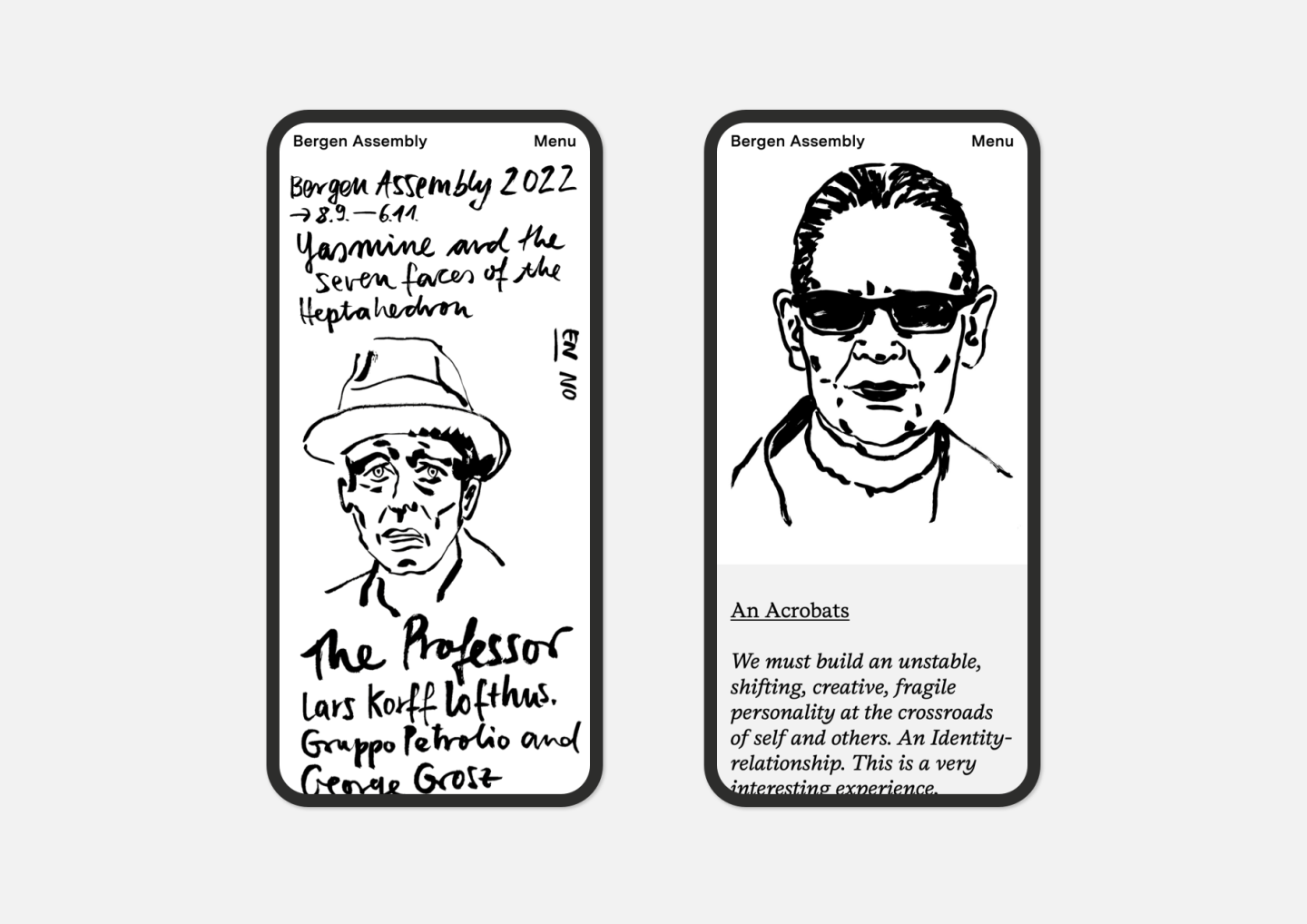 Seven characters, each symbolizing a face of the Heptahedron, guide Yasmine's journey and form the basis of seven exhibitions in Bergen. Our design features black-and-white illustrations and a mix of handwriting and typography, creating a unique visual identity that simplifies the narrative.