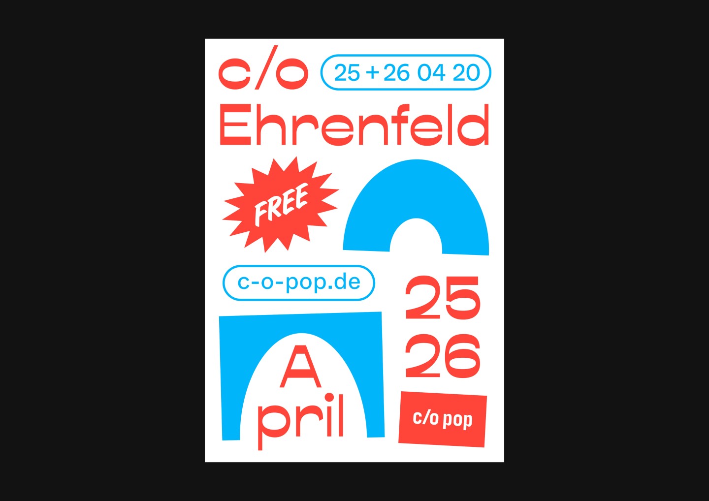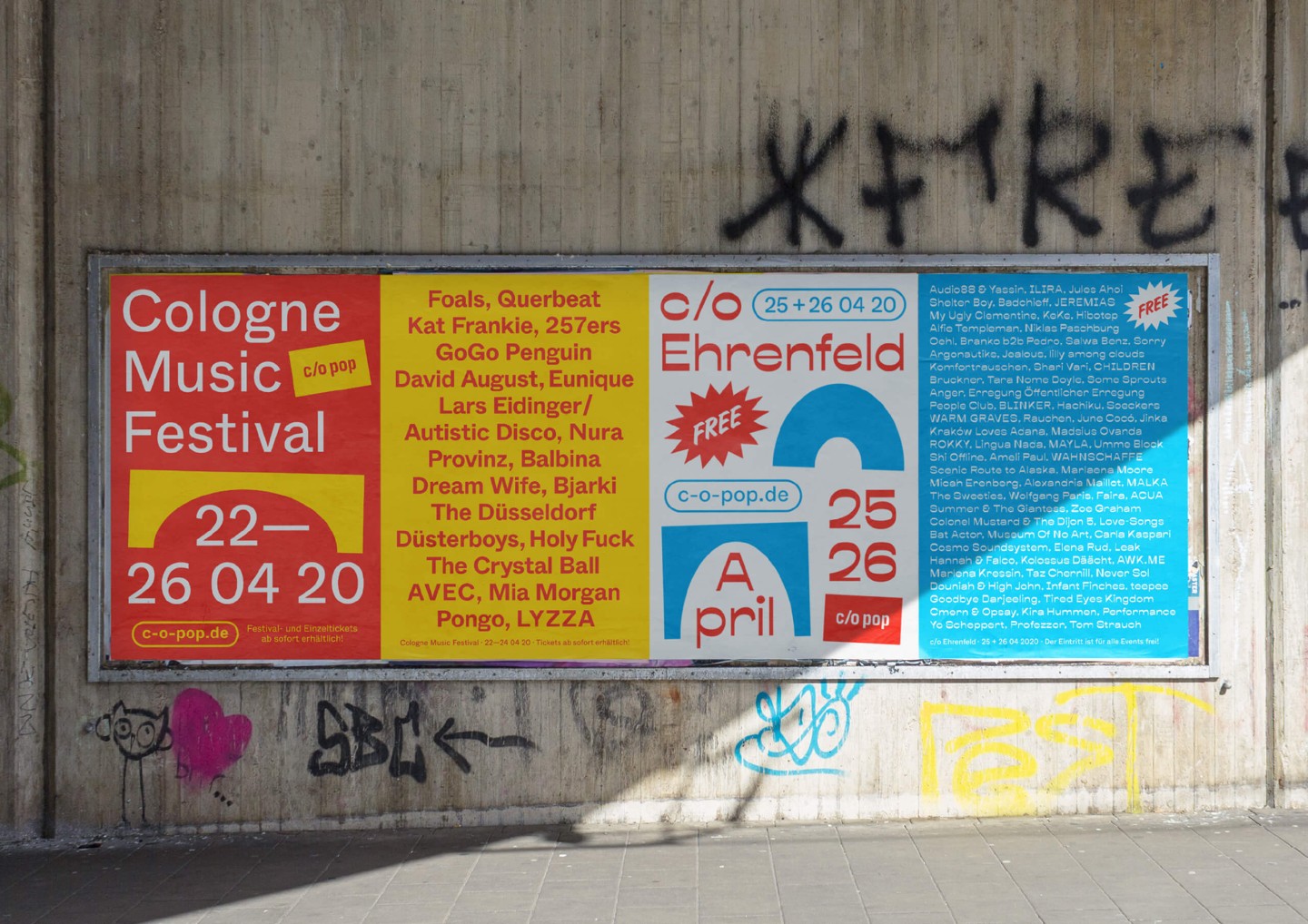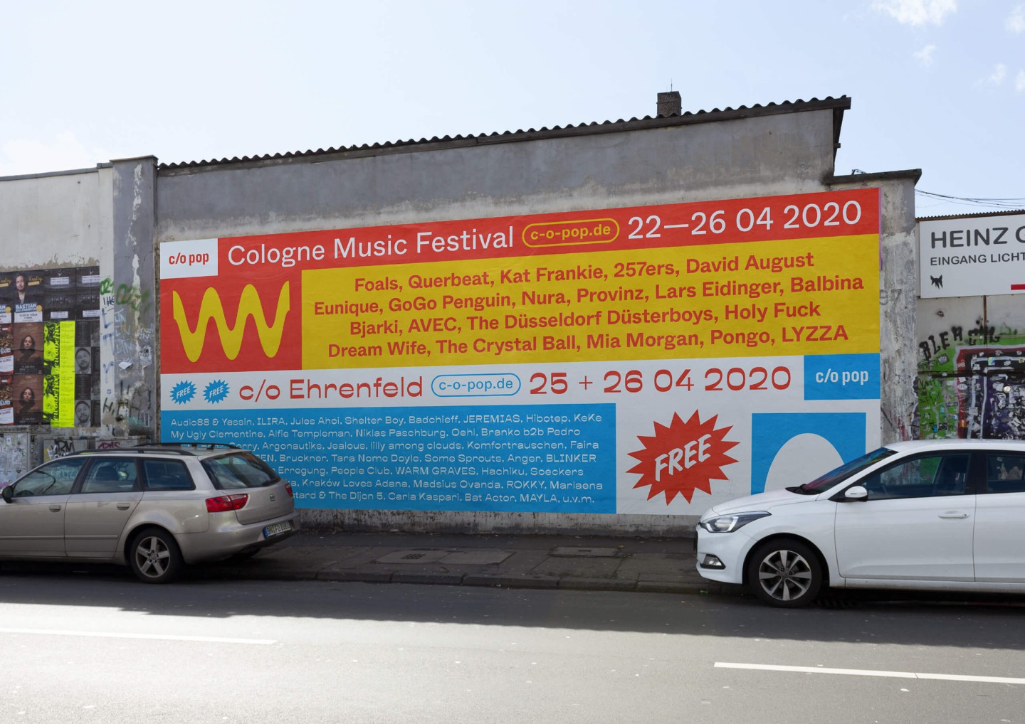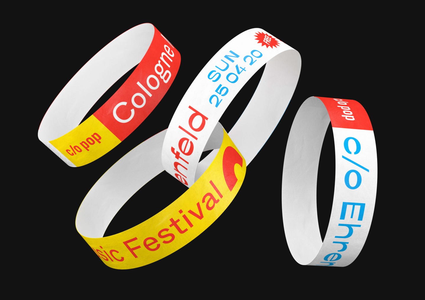 In addition to the main festival, the appearance for its little sibling and festival-in-a-festival c/o Ehrenfeld was further elaborated. Besides free concerts and shows, c/o Ehrenfeld includes various activities from yoga to workshops, dance, talks, and much more. Its identity follows the visual appearance of c/o pop — the differentiation of color and typeface makes its unique character clear.