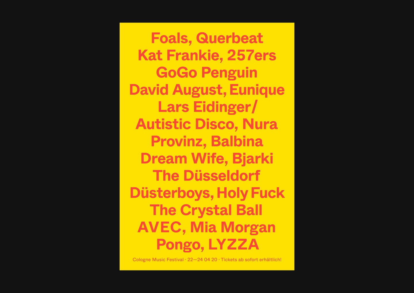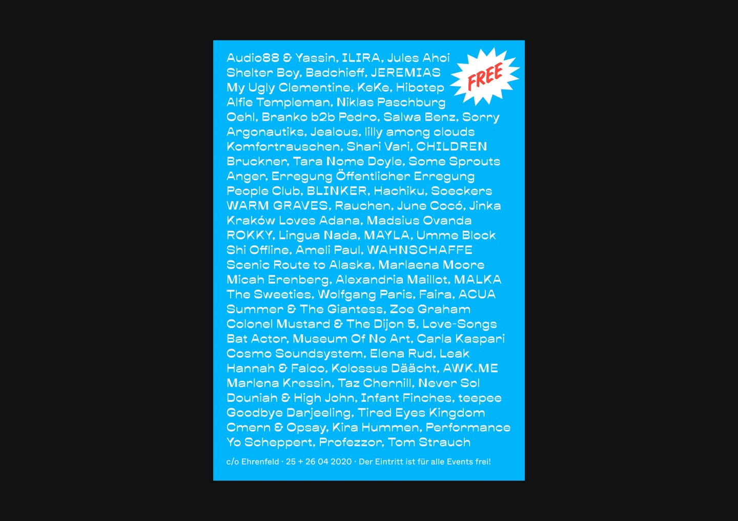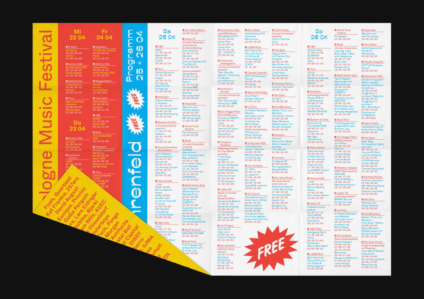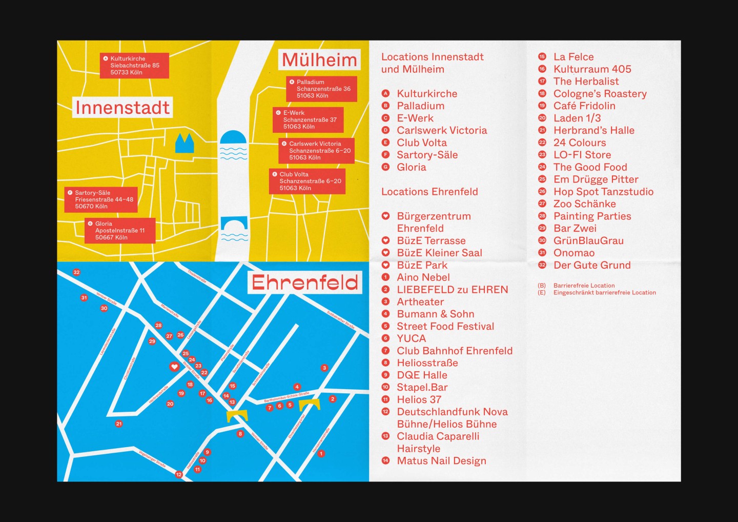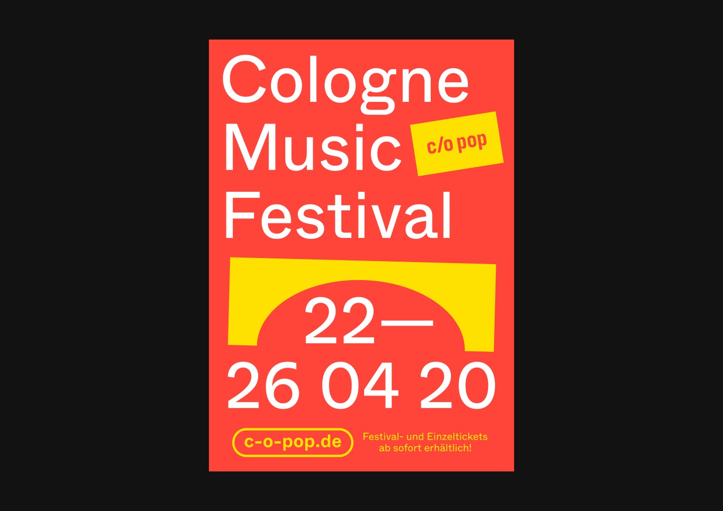 In addition to the main festival, the appearance for its little sibling and festival-in-a-festival c/o Ehrenfeld was further elaborated. Besides free concerts and shows, c/o Ehrenfeld includes various activities from yoga to workshops, dance, talks, and much more. Its identity follows the visual appearance of c/o pop — the differentiation of color and typeface makes its unique character clear.