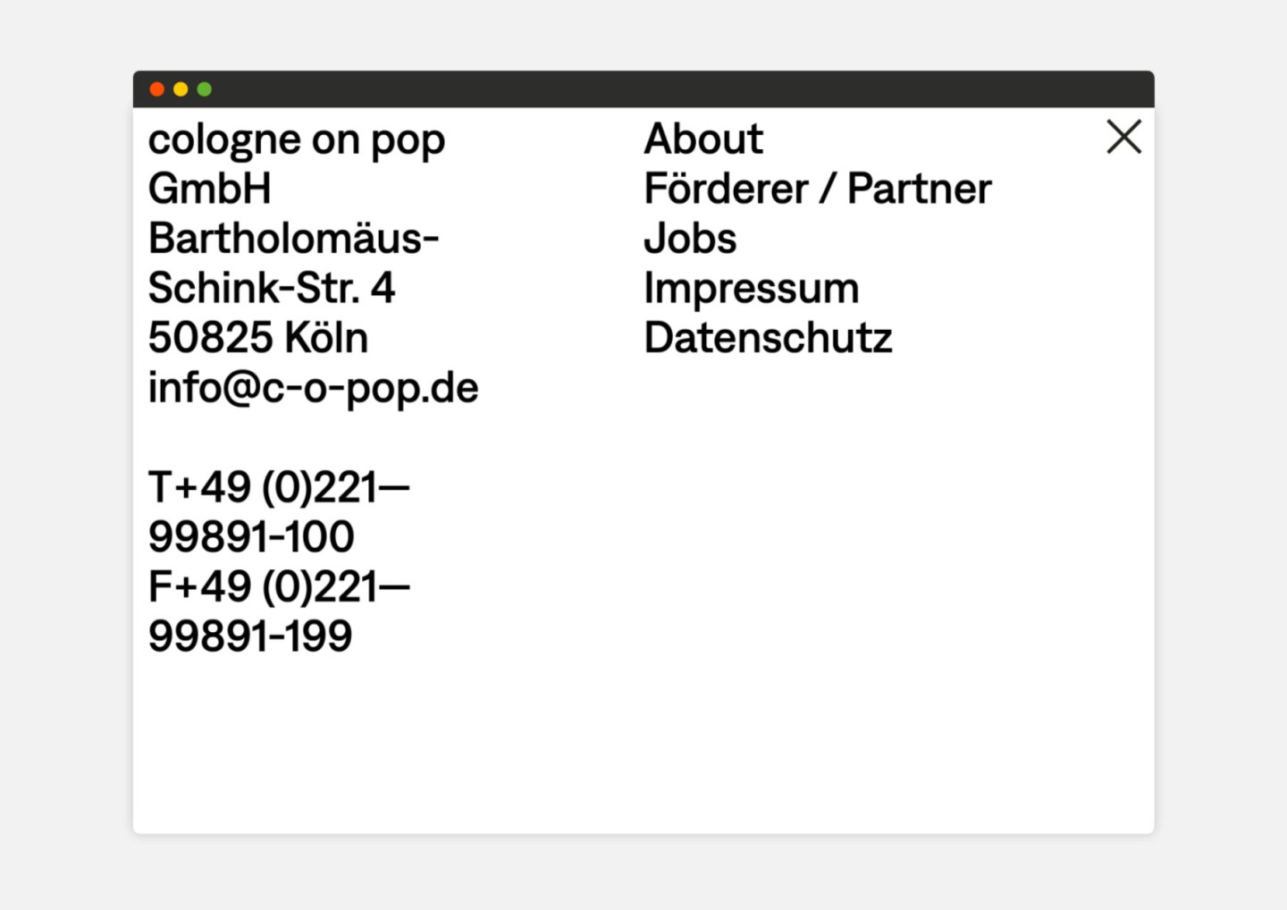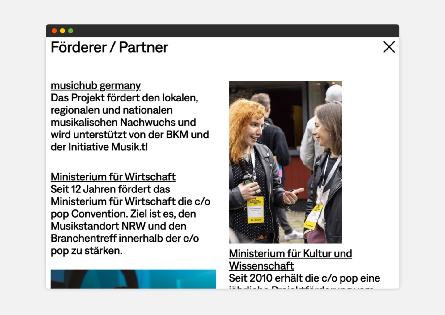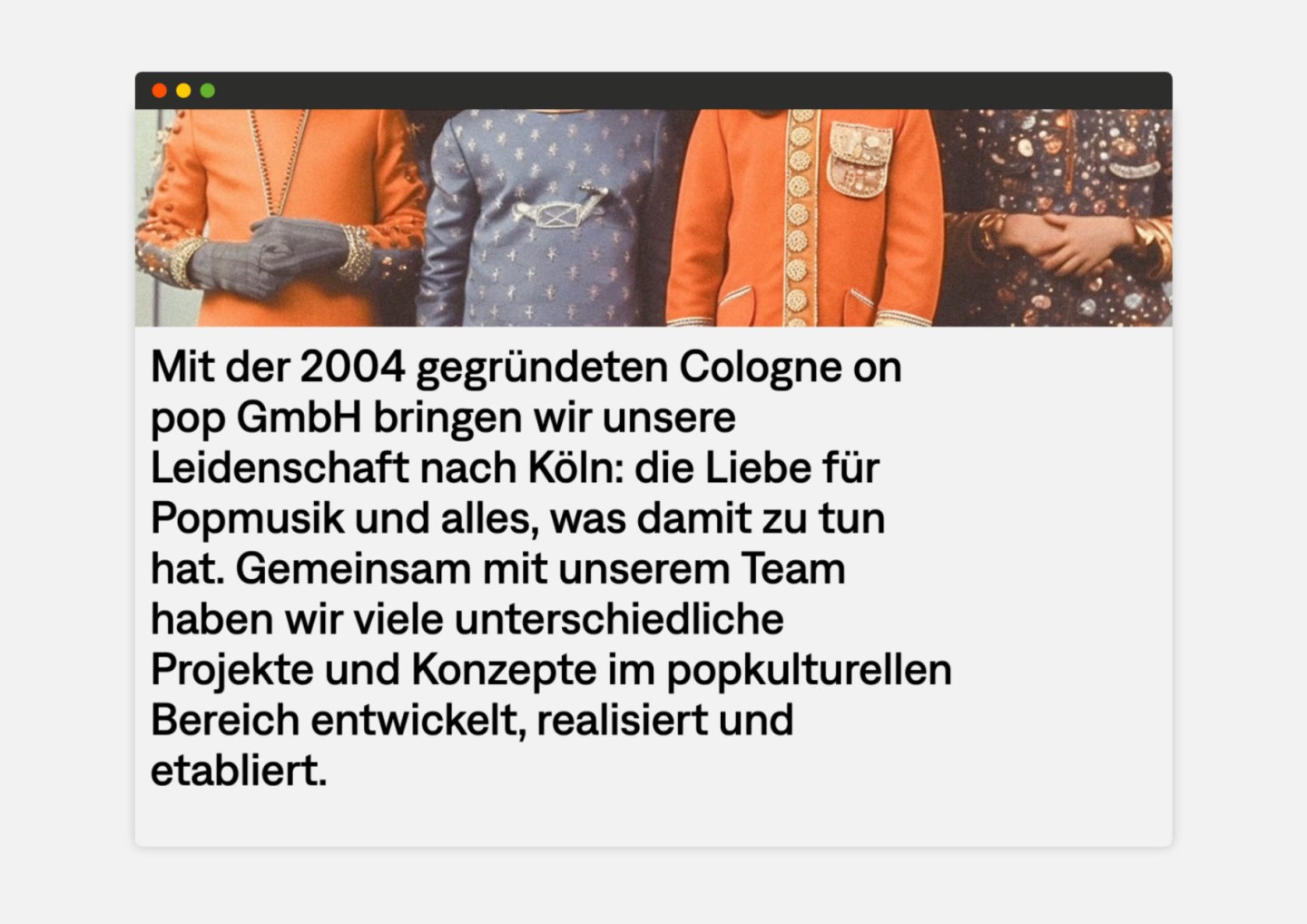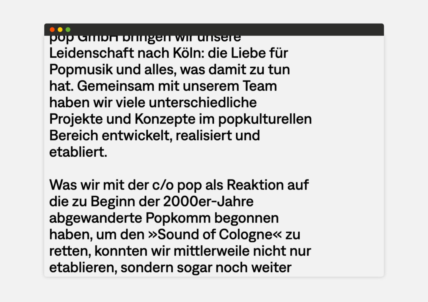 Starting with the c/o Pop festival, Cologne on pop GmbH has built up a comprehensive pop culture network over the past two decades. This network brings together a wide range of stakeholders through festivals, conferences and workshops. The mission of Cologne on pop GmbH is to preserve the radiant pop culture brilliance of Cologne and to keep the general crisis in the music industry at bay.