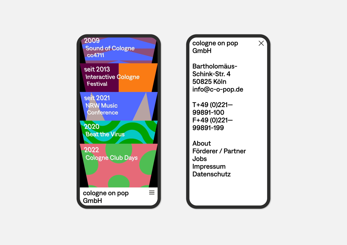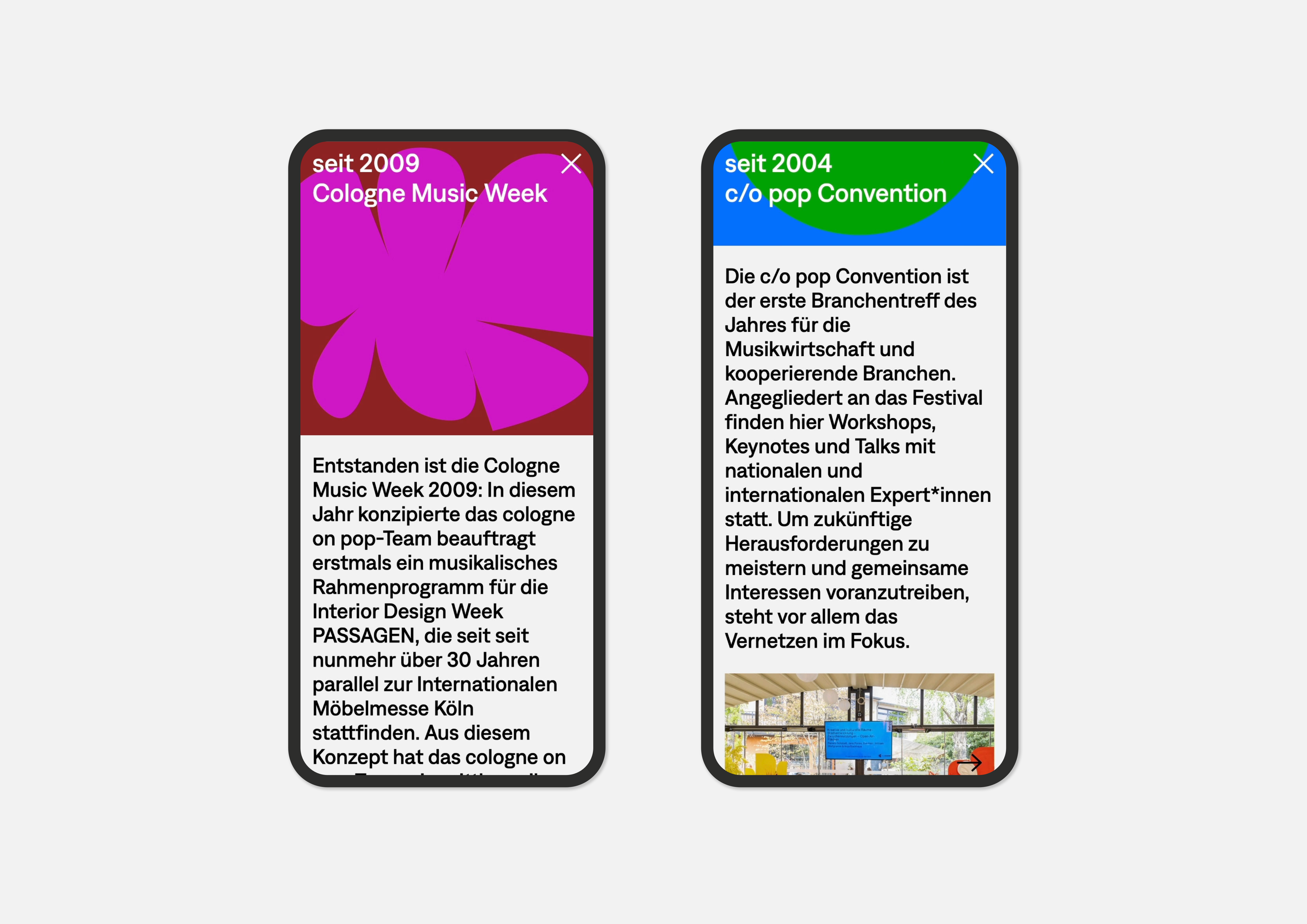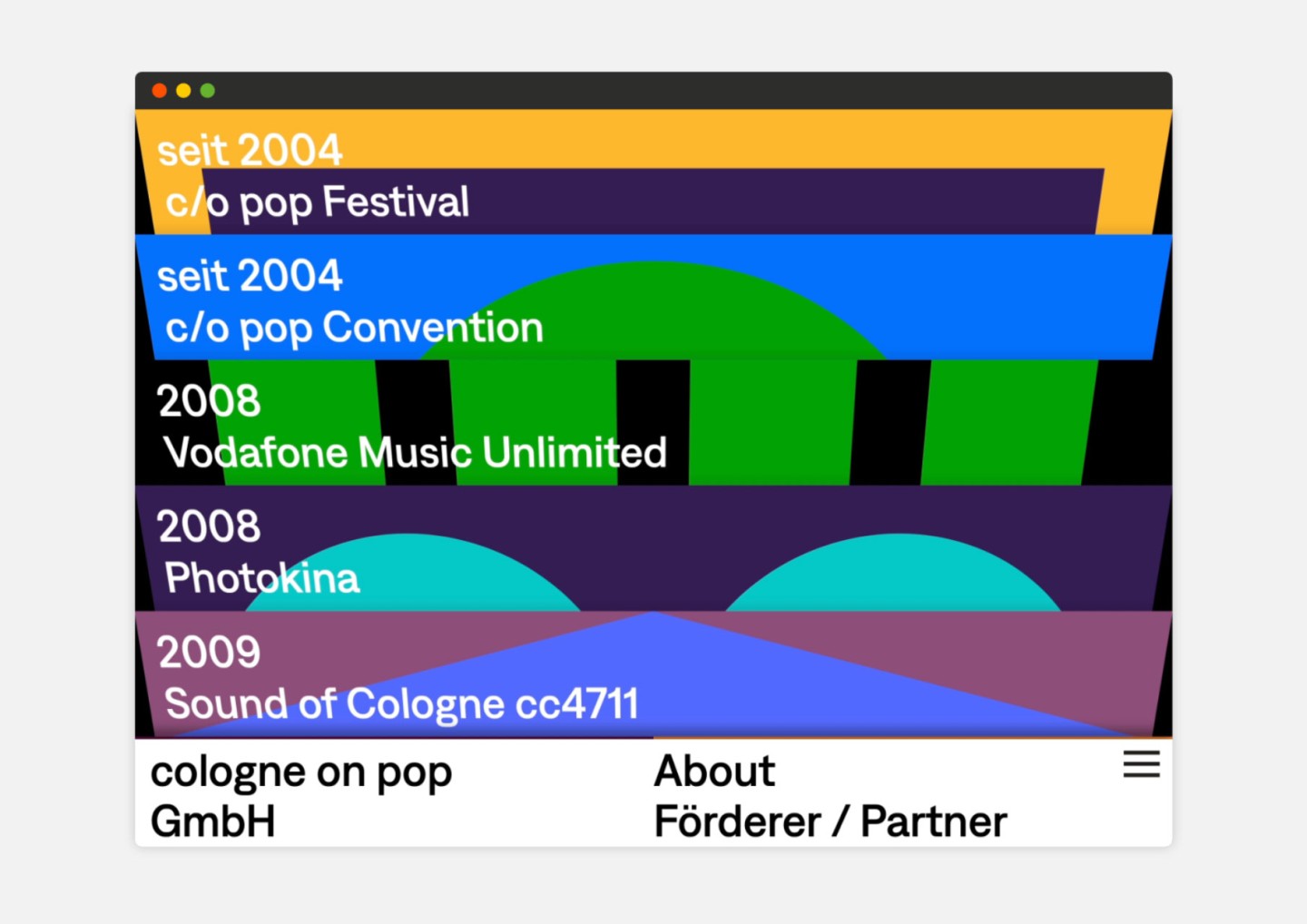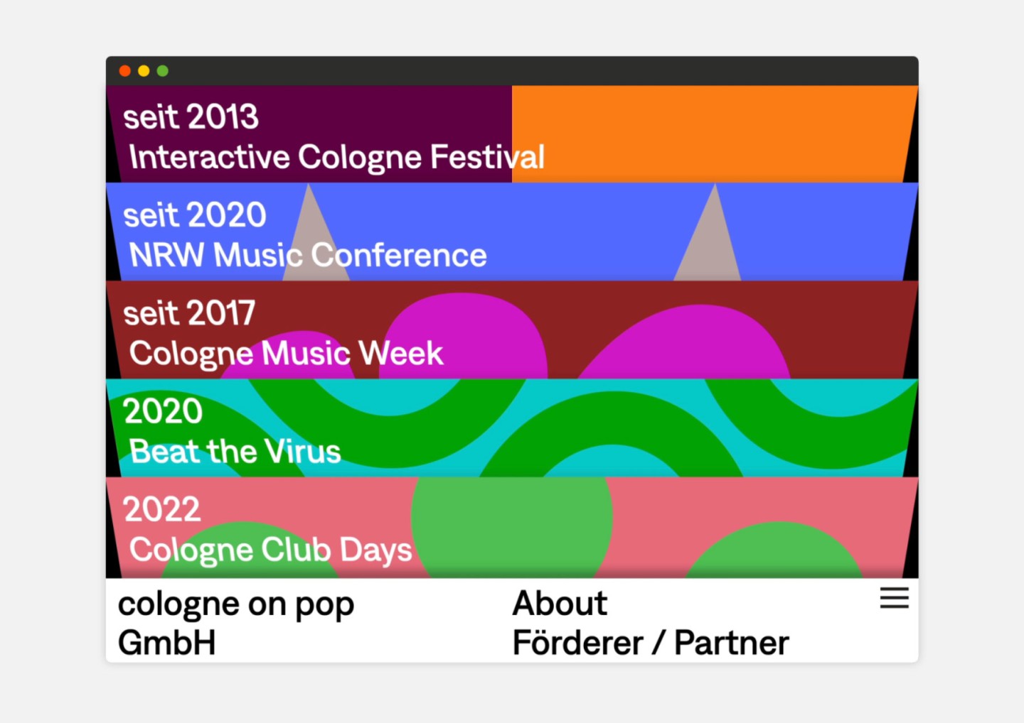 The passion for music is celebrated here in an impressive way: Just like browsing in a record shop, you can flip through the various covers, each representing one of the many activities of Cologne on pop GmbH.