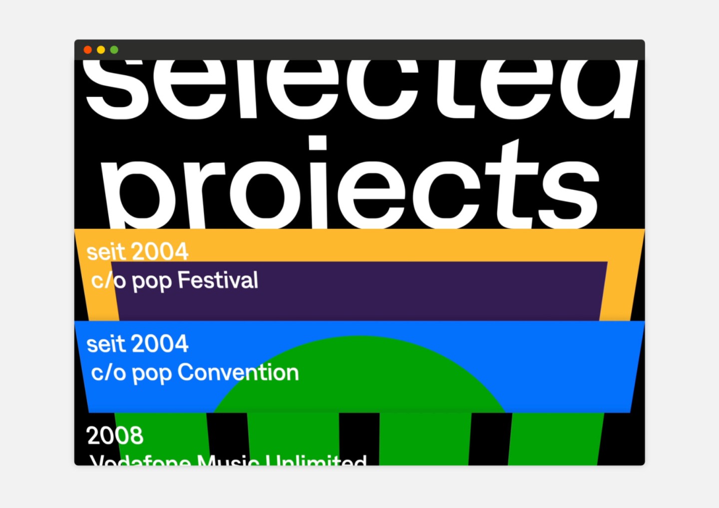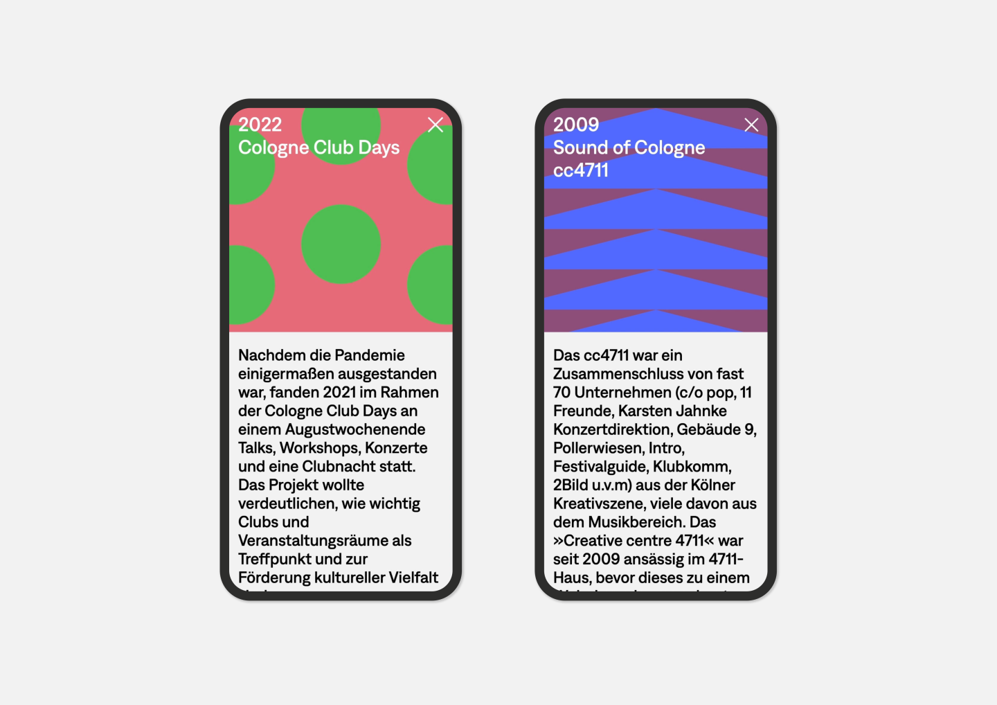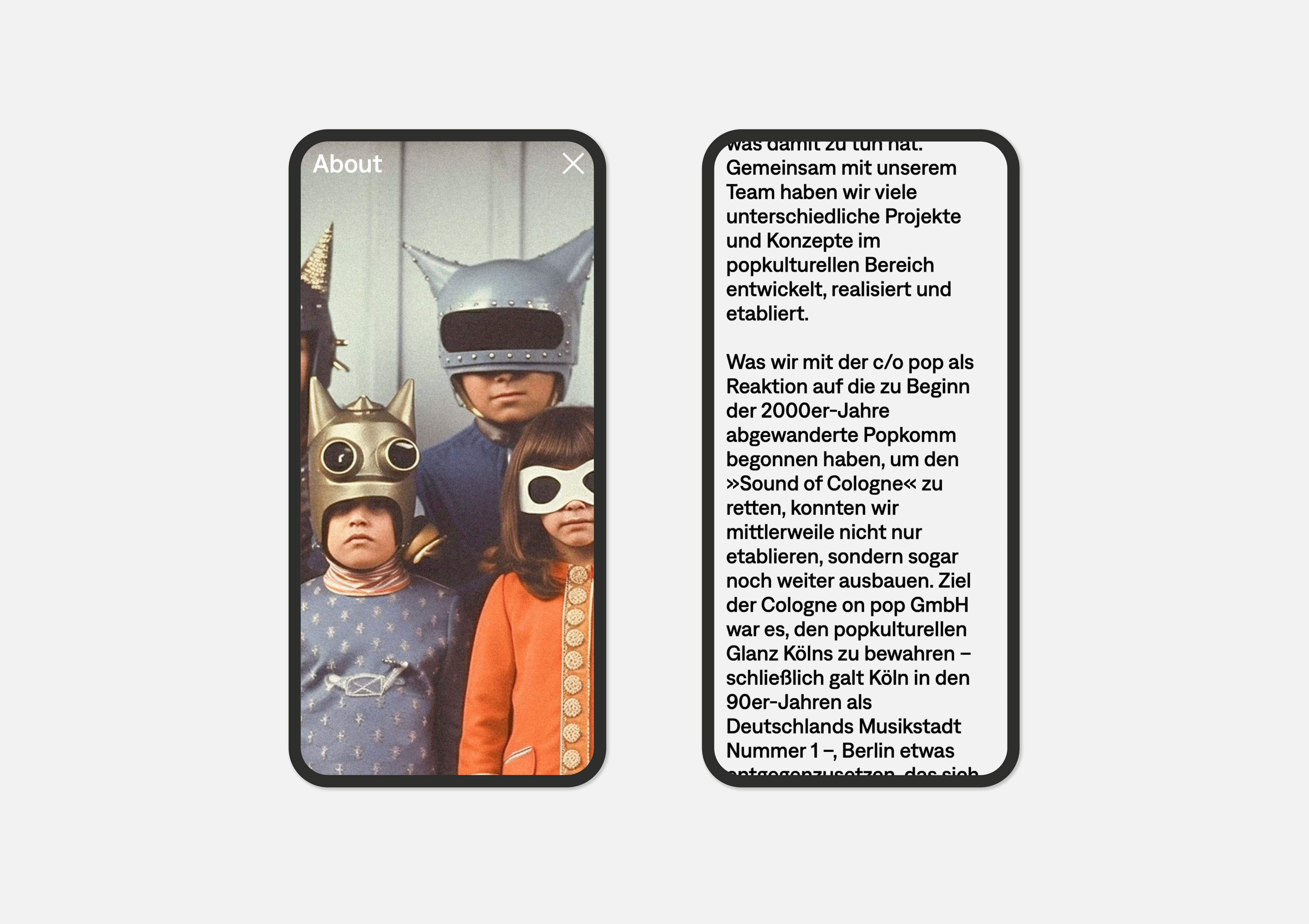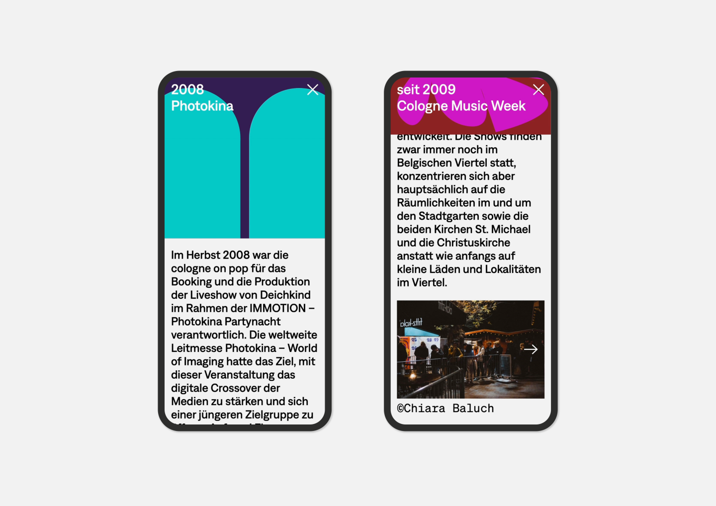 The passion for music is celebrated here in an impressive way: Just like browsing in a record shop, you can flip through the various covers, each representing one of the many activities of Cologne on pop GmbH.