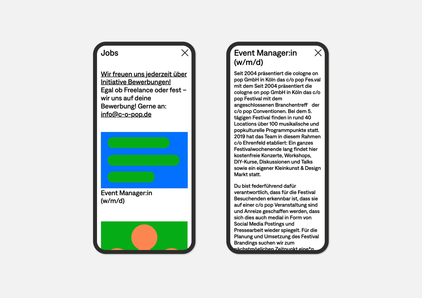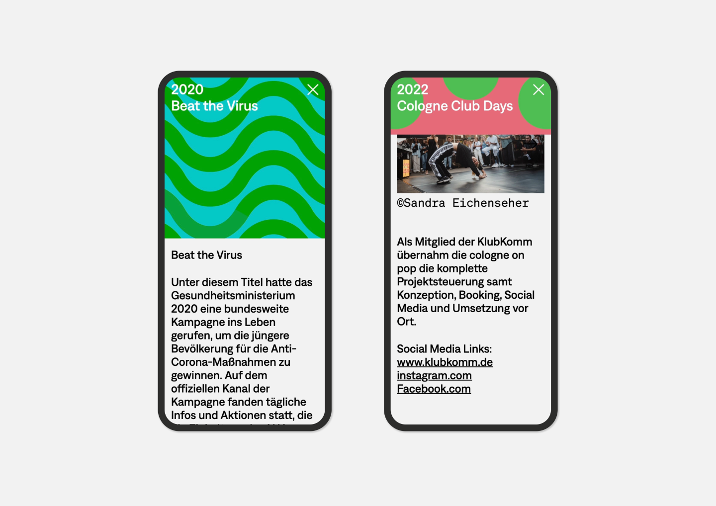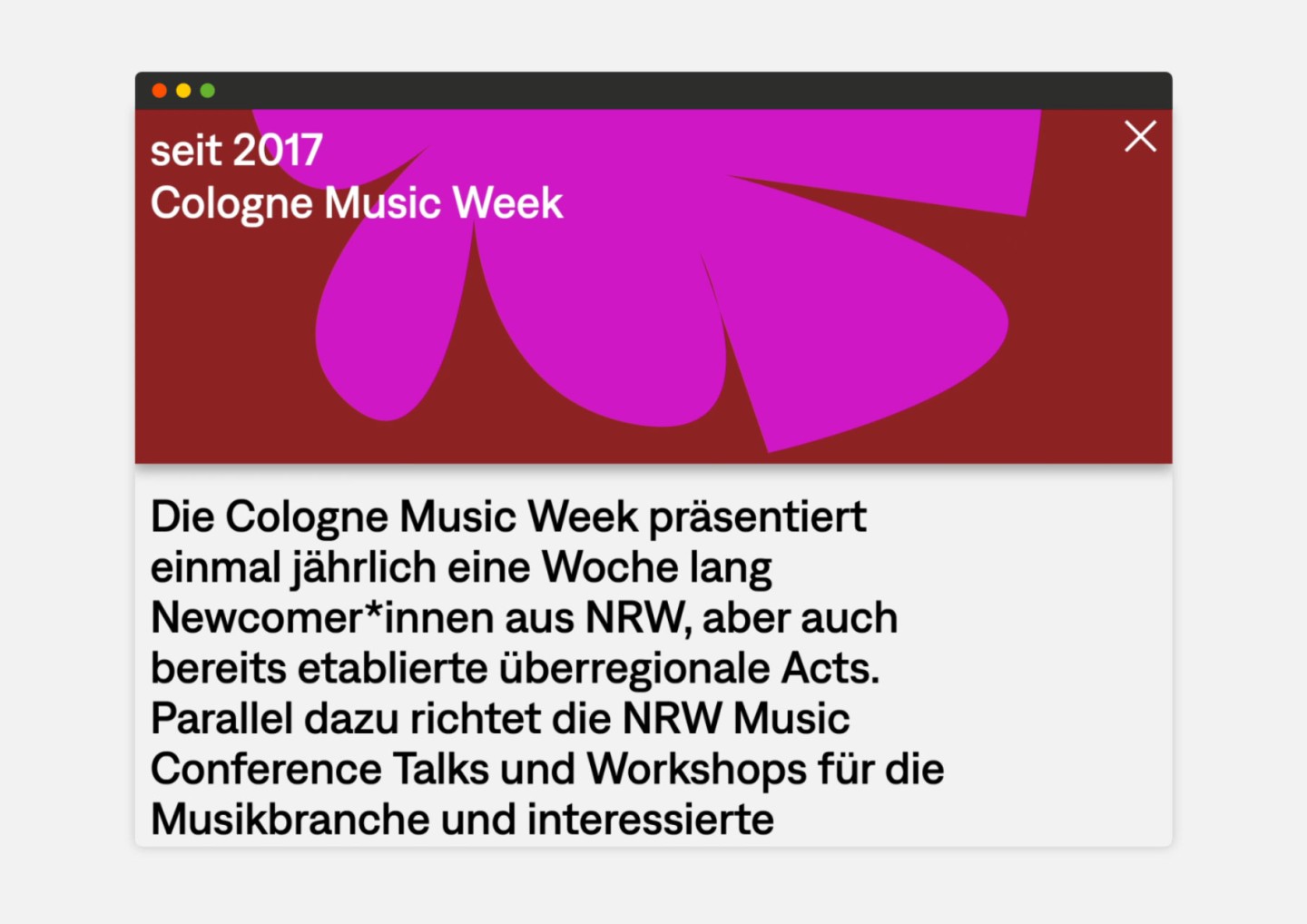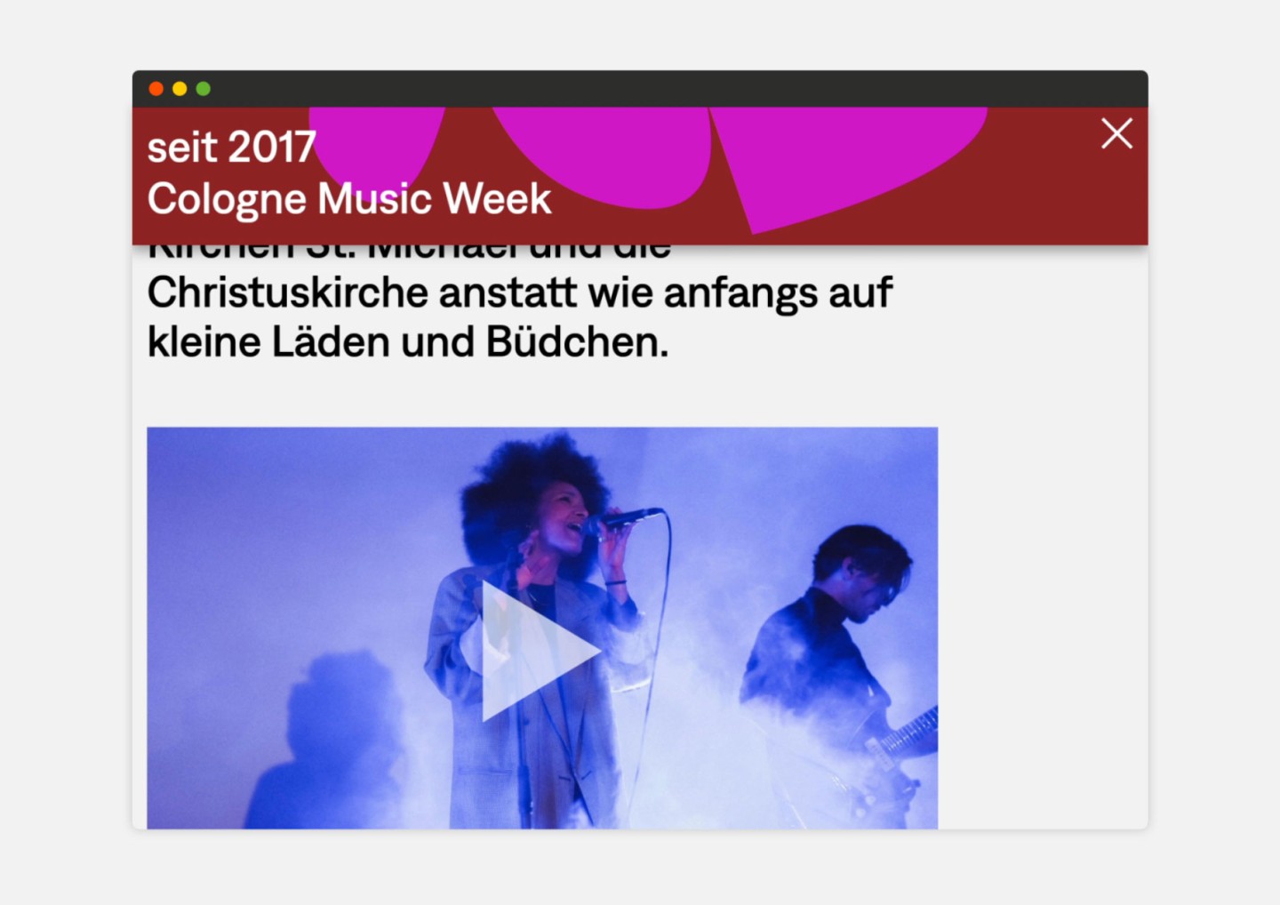 The passion for music is celebrated here in an impressive way: Just like browsing in a record shop, you can flip through the various covers, each representing one of the many activities of Cologne on pop GmbH.