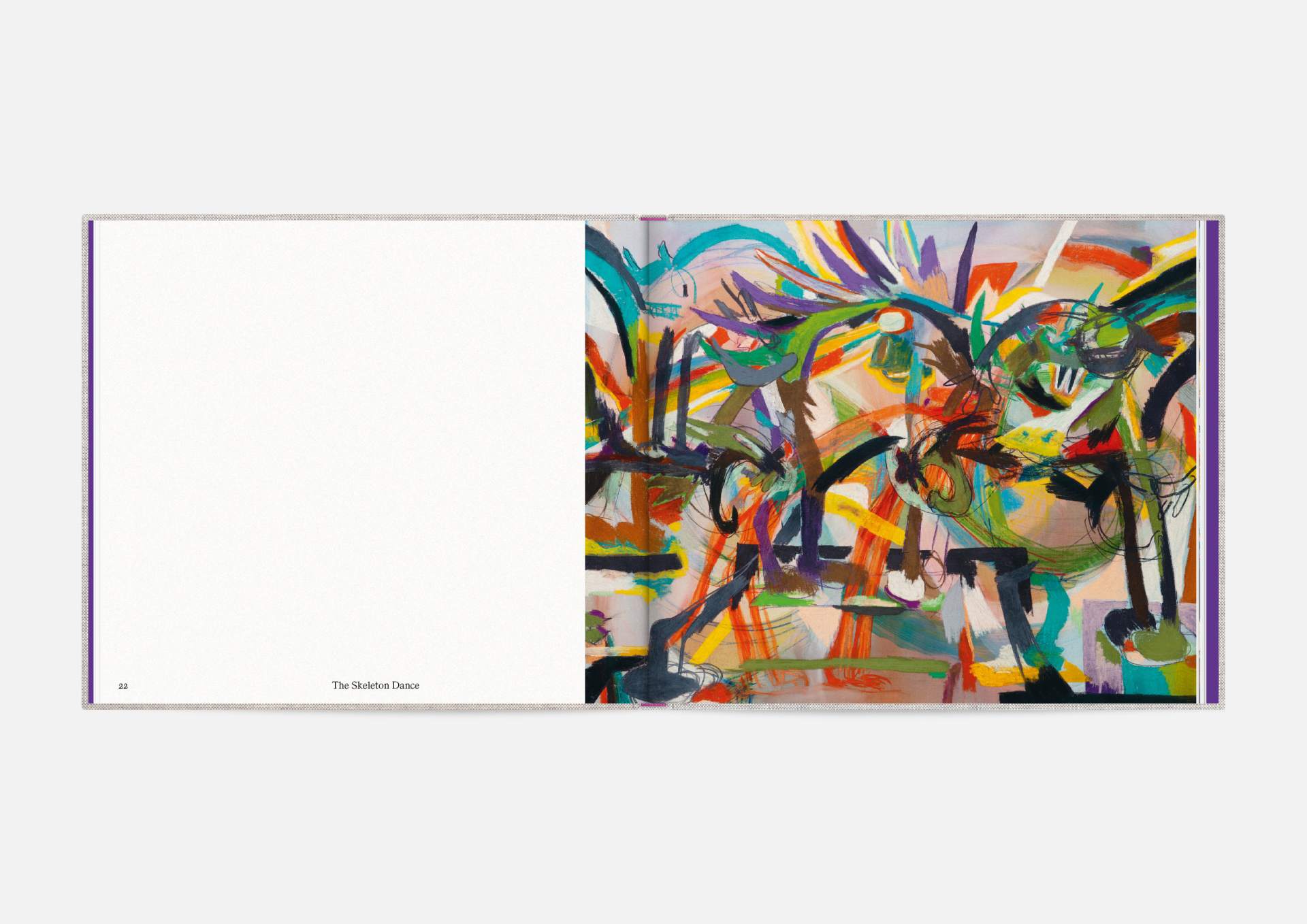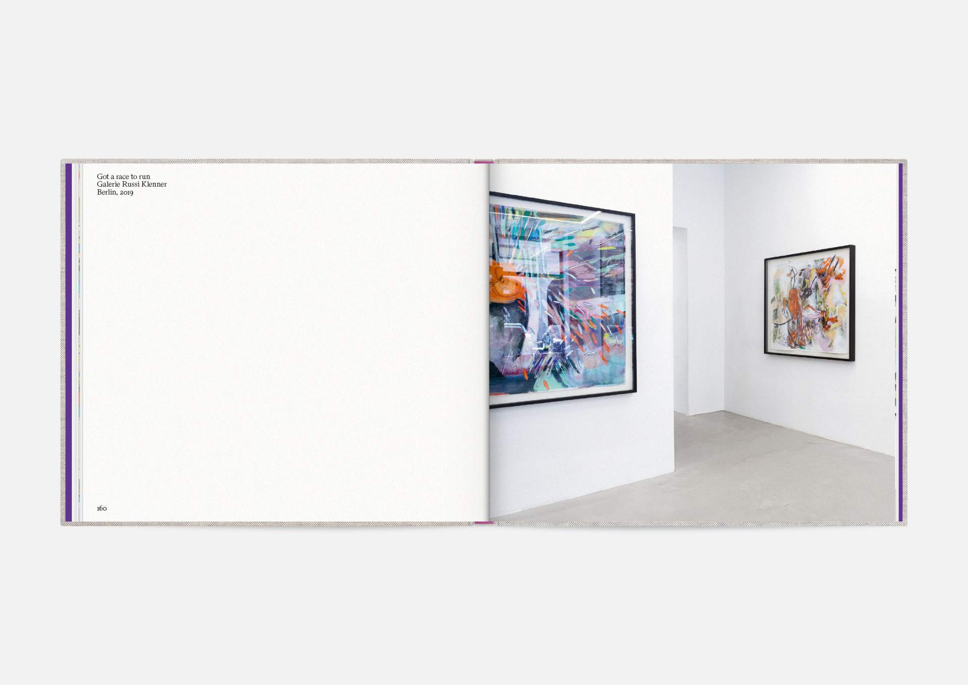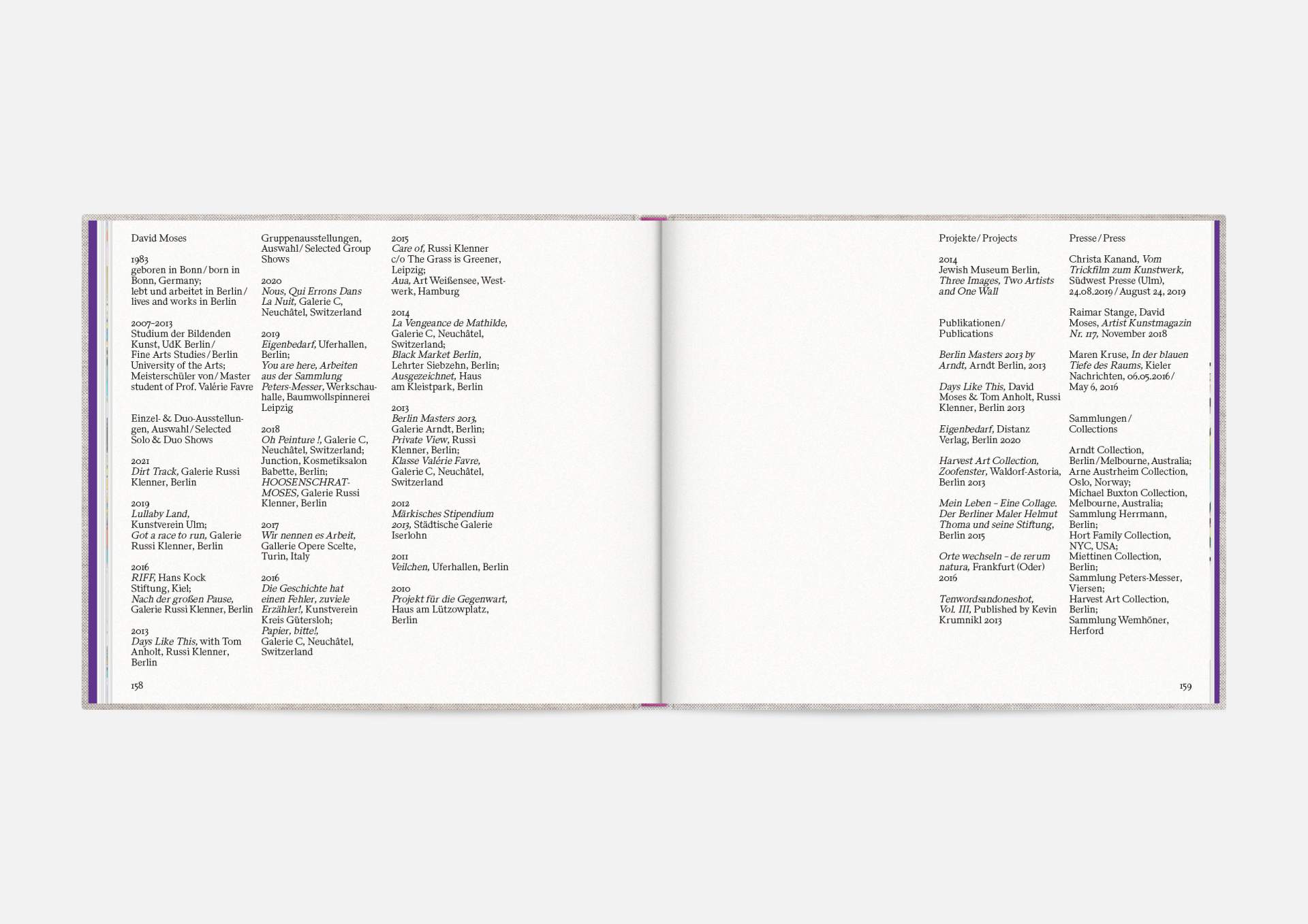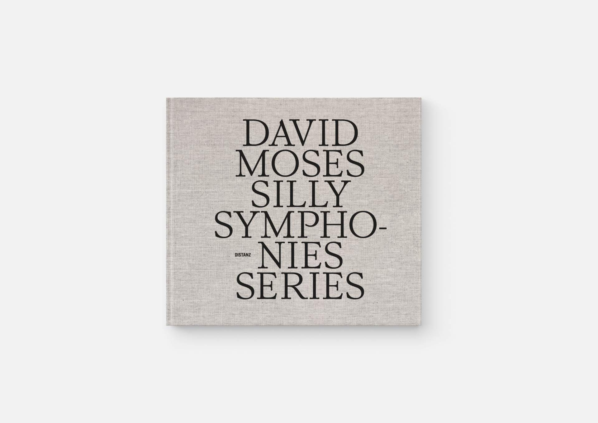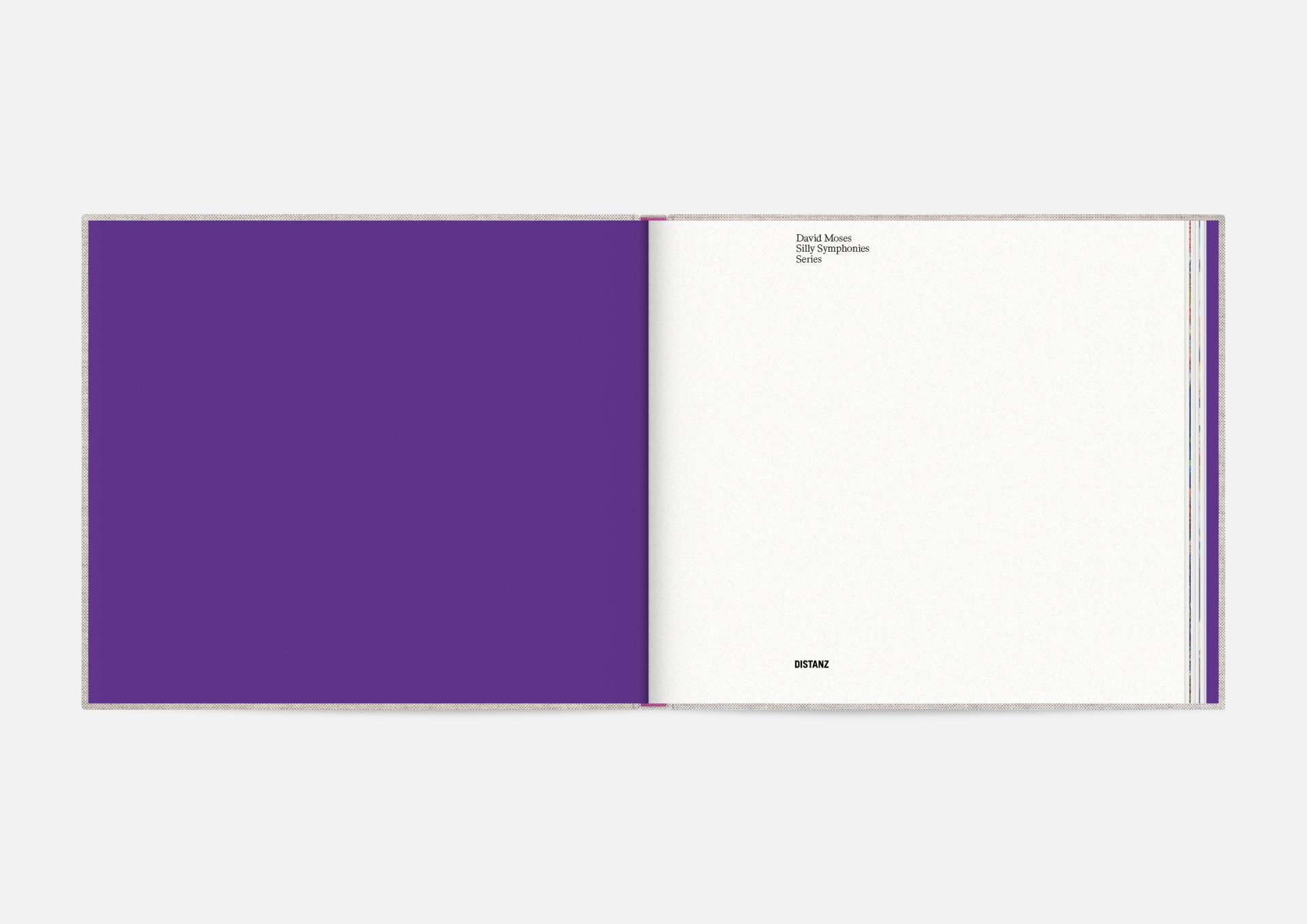 The book is the stage for the dynamic, explosive works. The proportions correspond to the film format of 4:5, and a linen cover references the coarse, unprimed canvas used; the print on matte uncoated paper hints at the chalky structures of David Moses’ works.