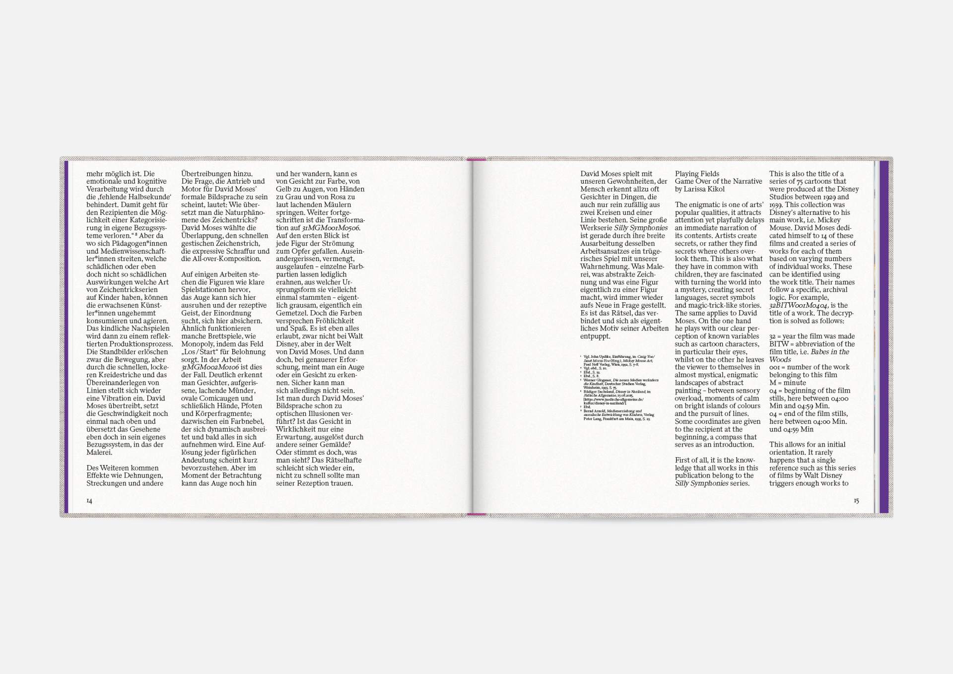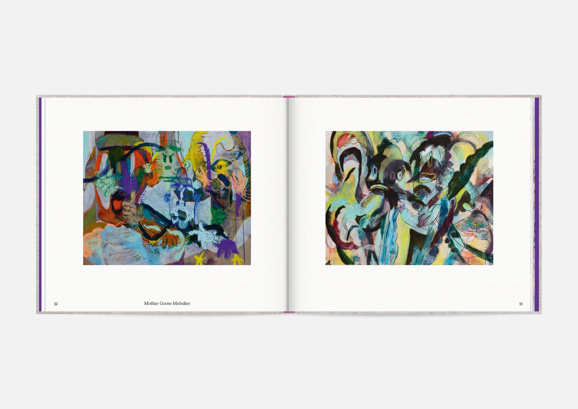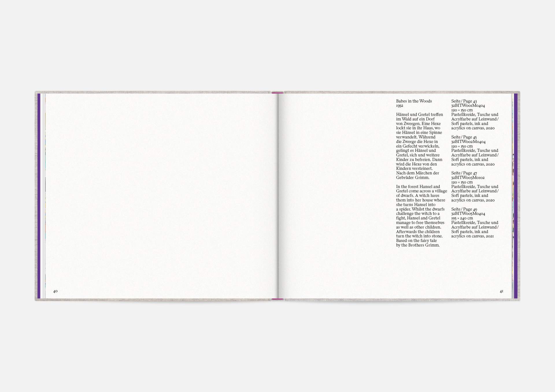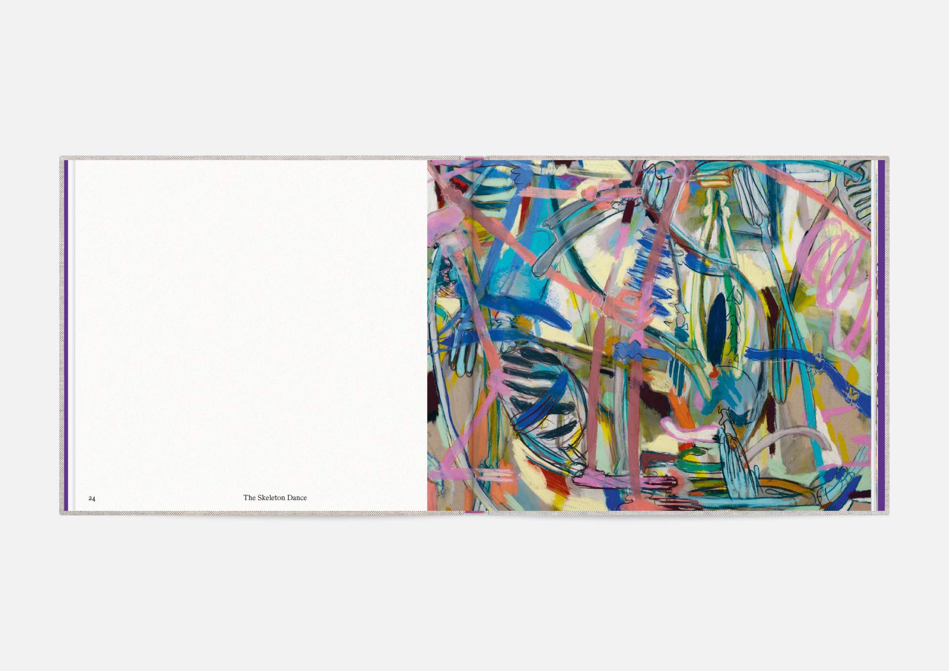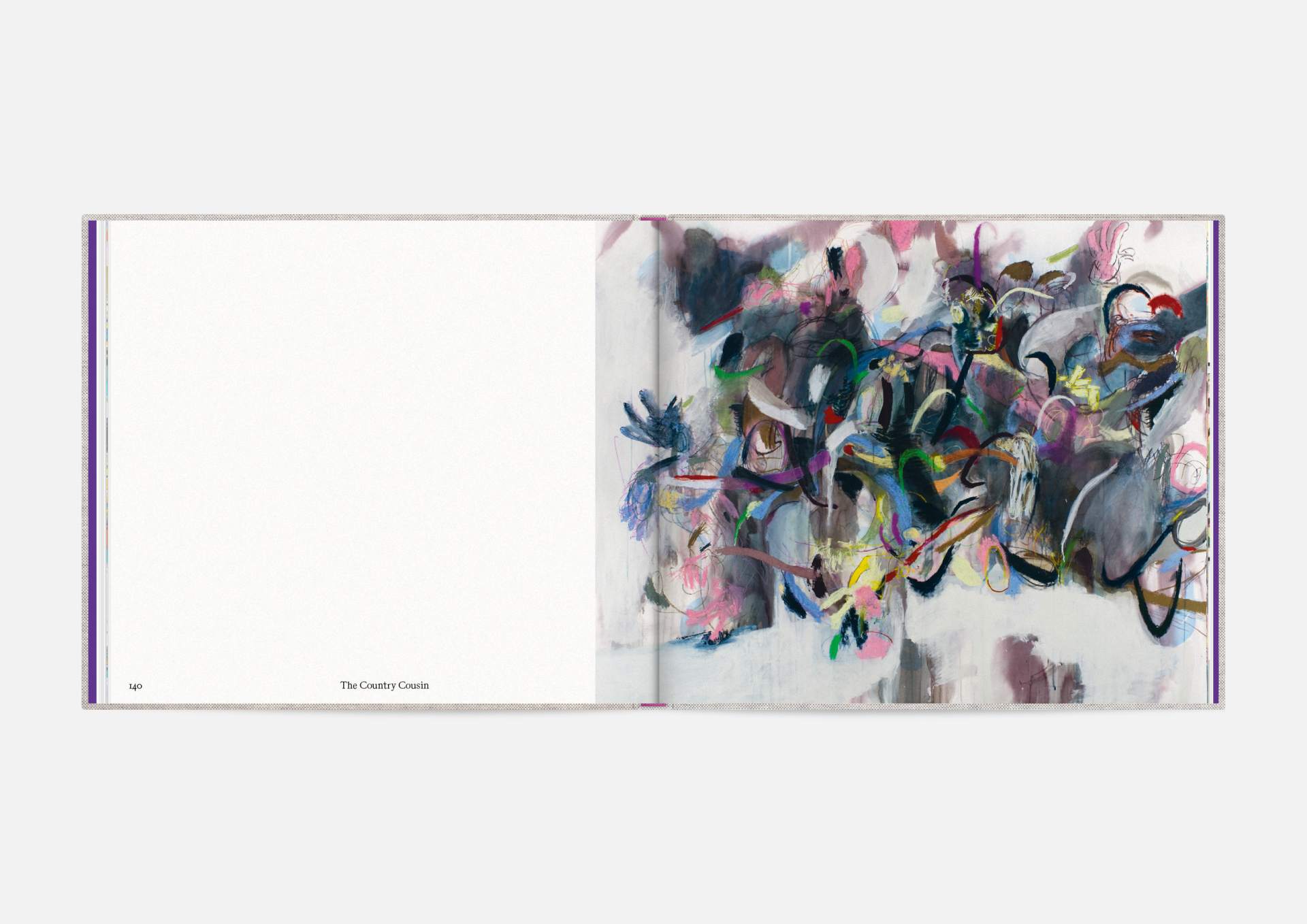 The book is the stage for the dynamic, explosive works. The proportions correspond to the film format of 4:5, and a linen cover references the coarse, unprimed canvas used; the print on matte uncoated paper hints at the chalky structures of David Moses’ works.