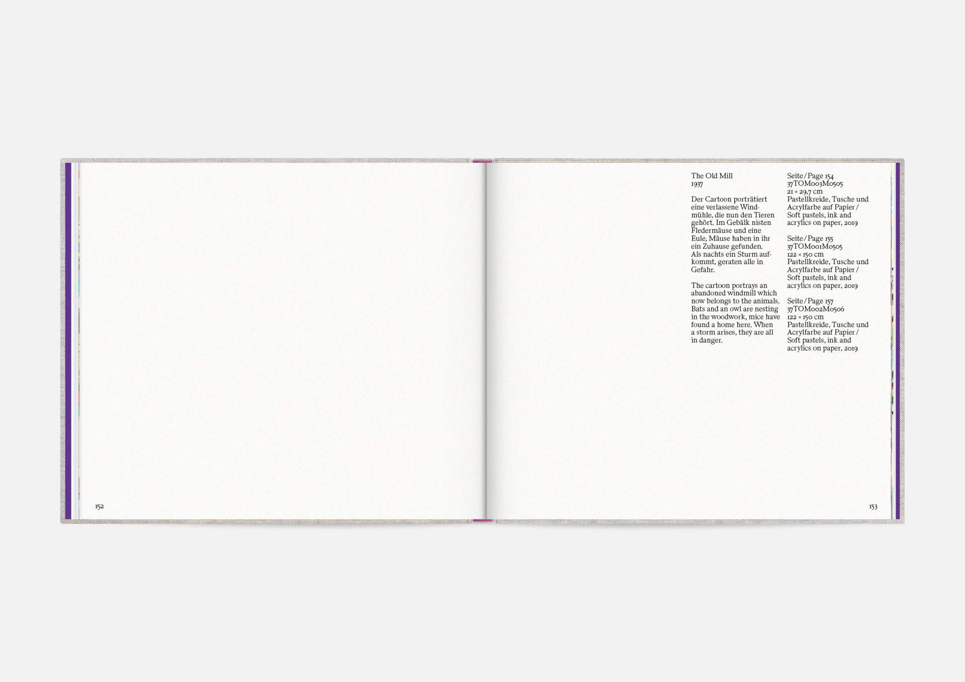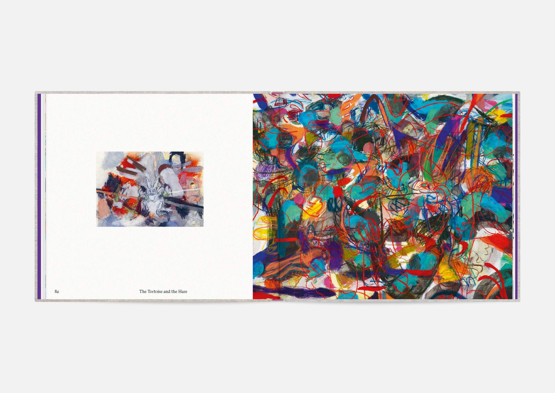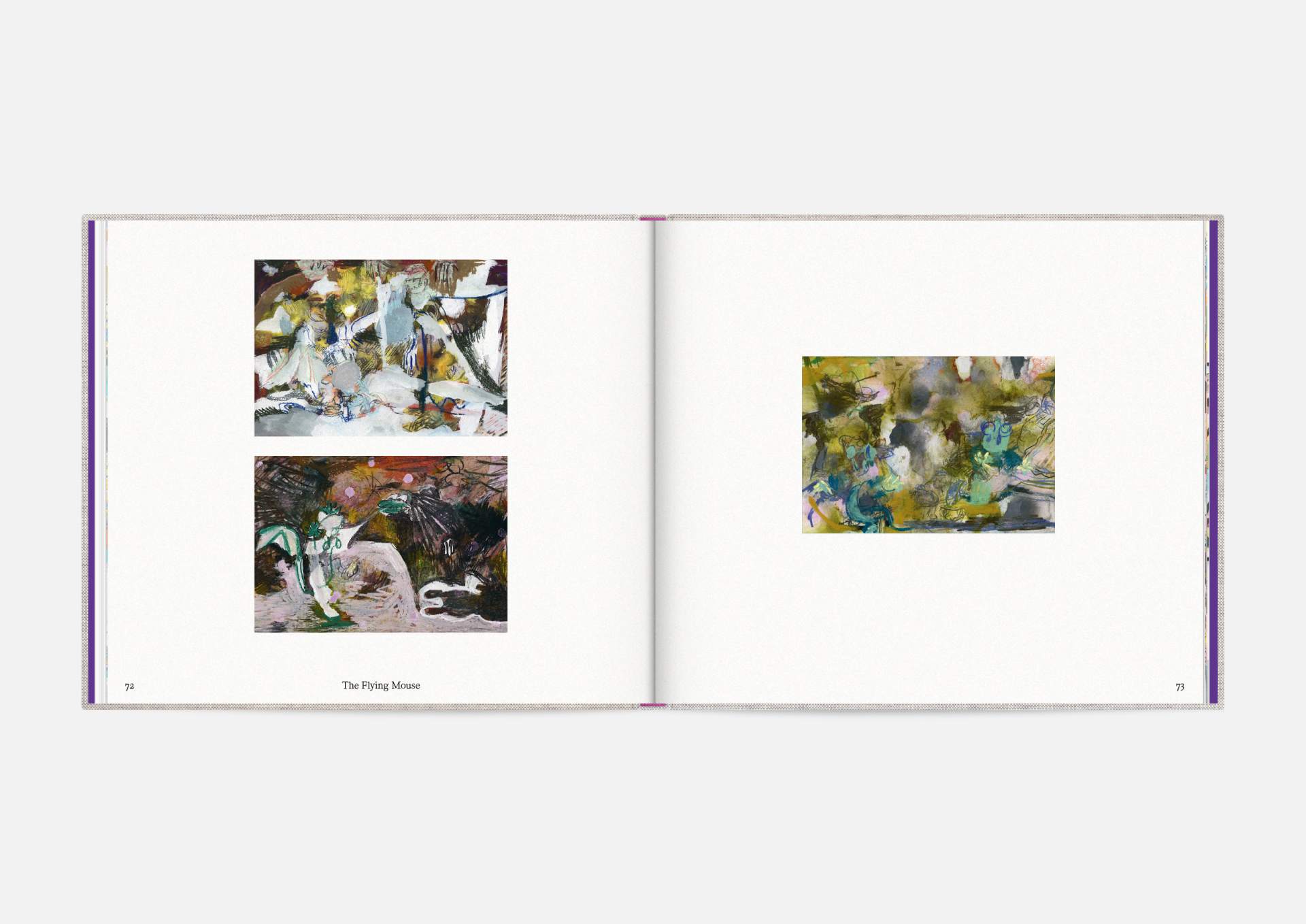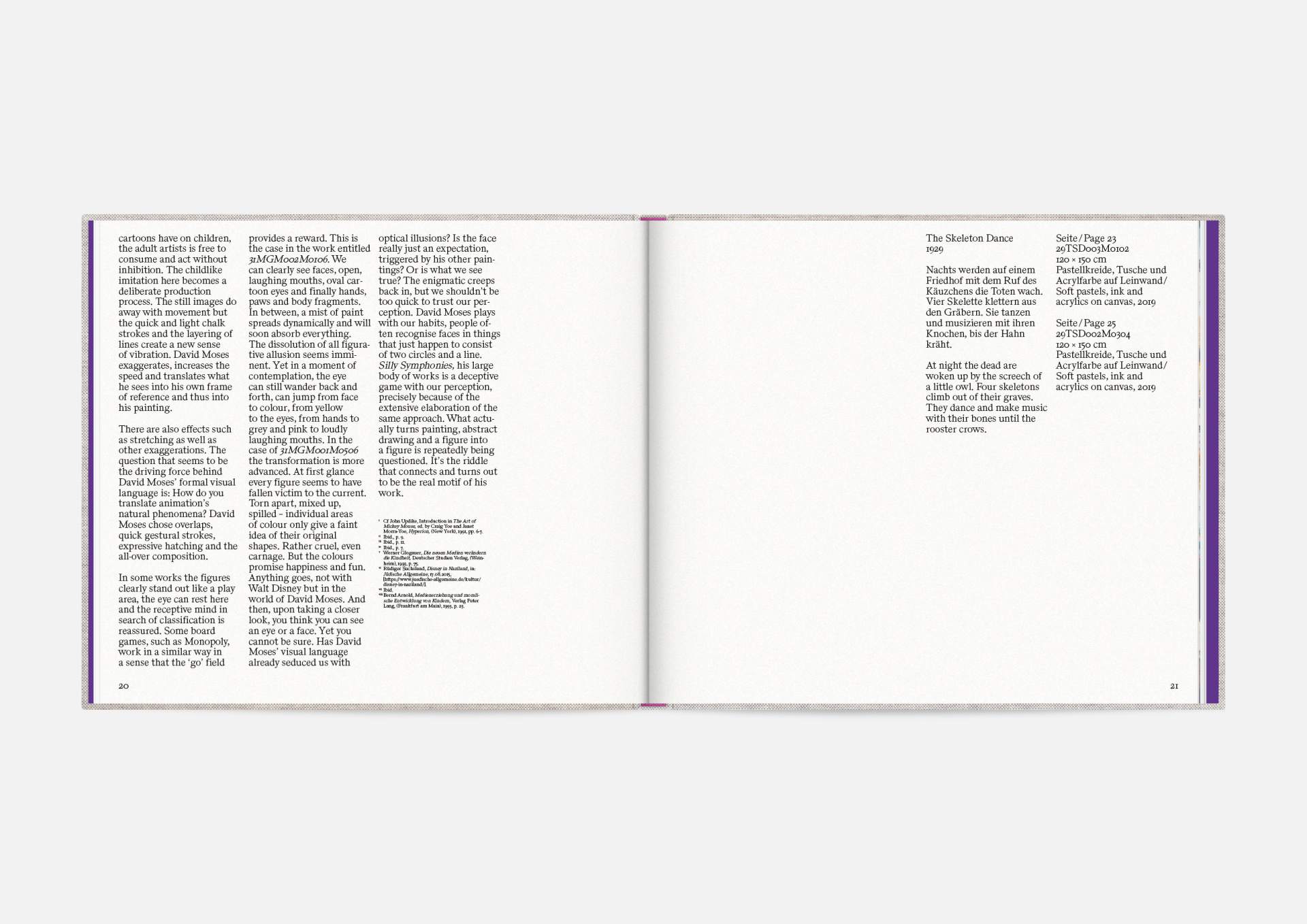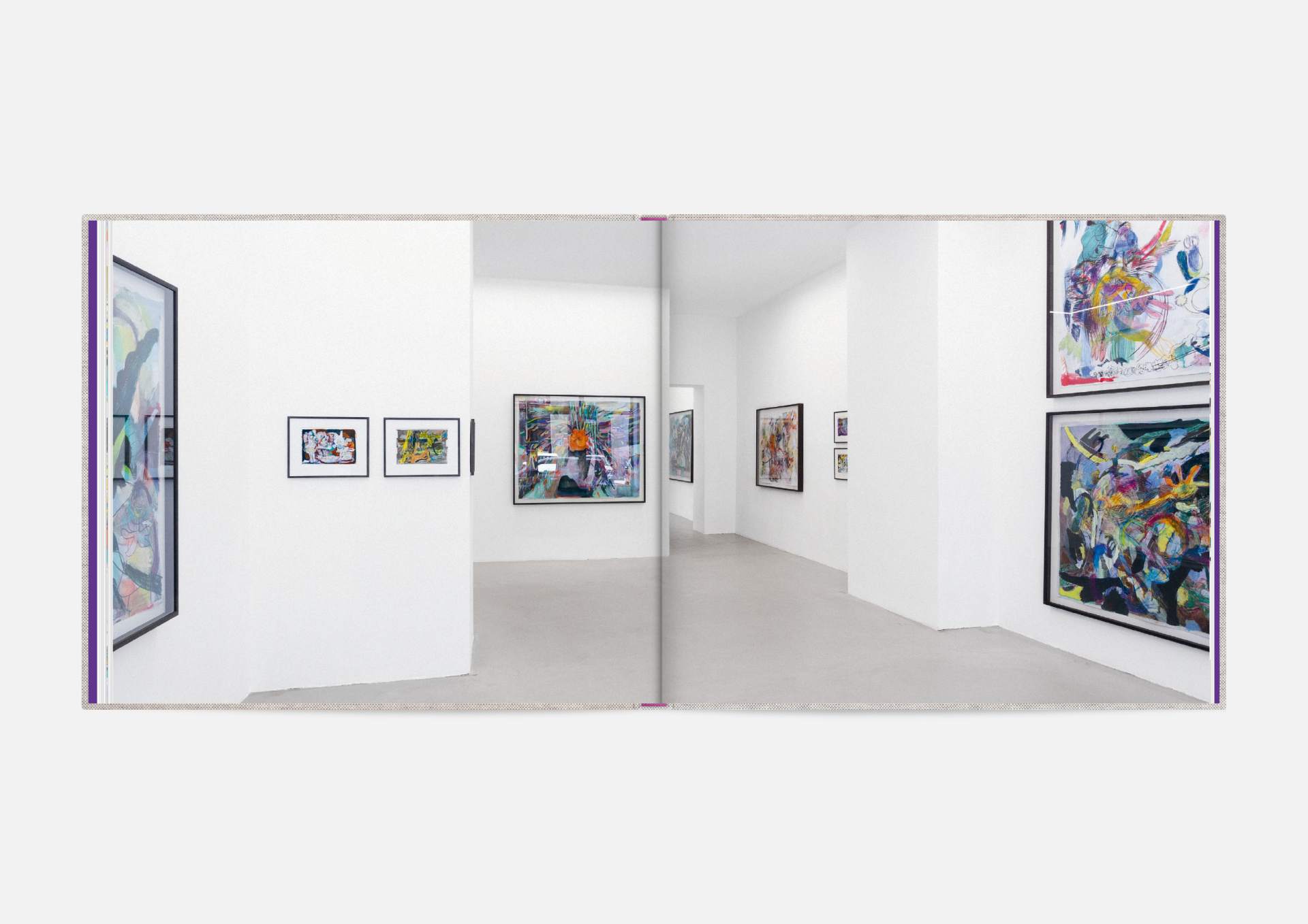 The book is the stage for the dynamic, explosive works. The proportions correspond to the film format of 4:5, and a linen cover references the coarse, unprimed canvas used; the print on matte uncoated paper hints at the chalky structures of David Moses’ works.