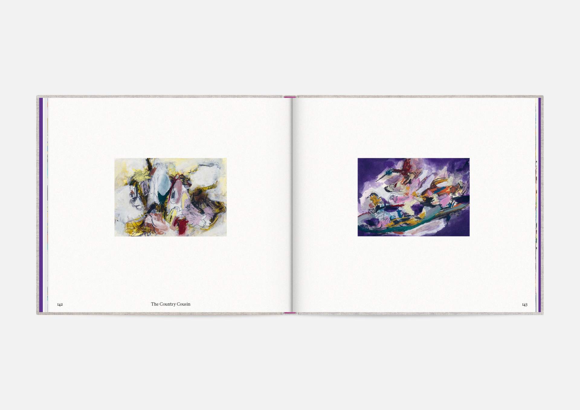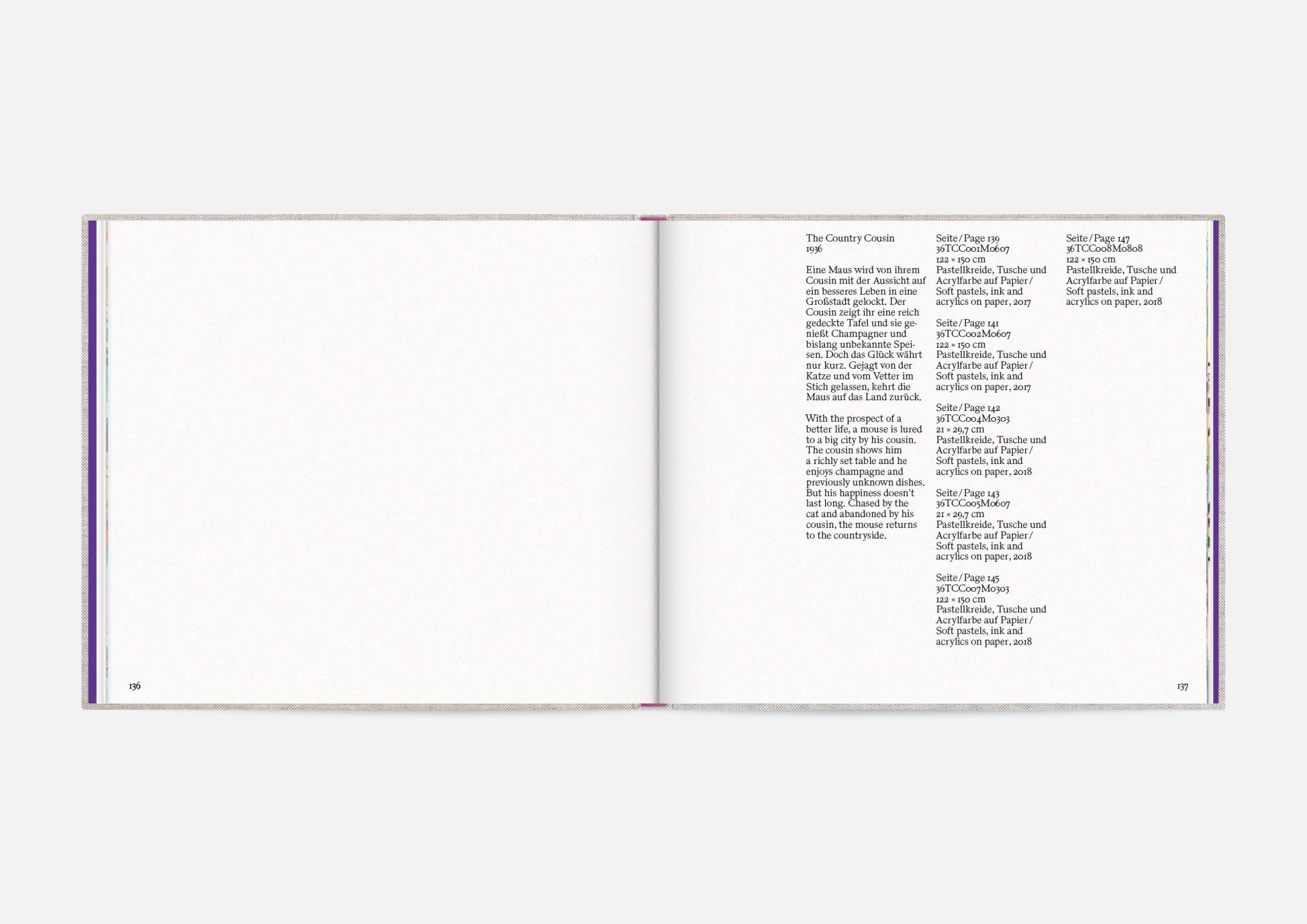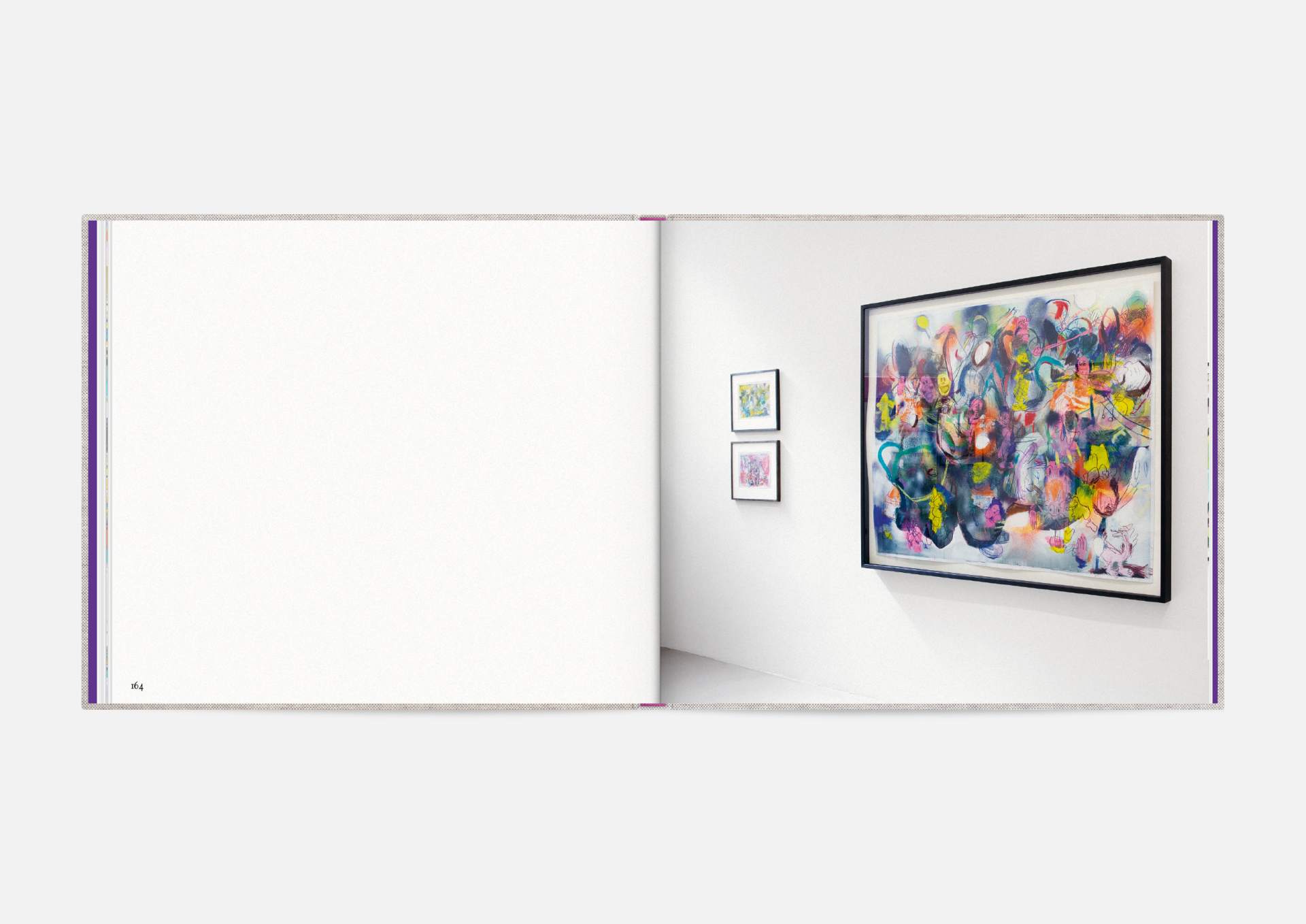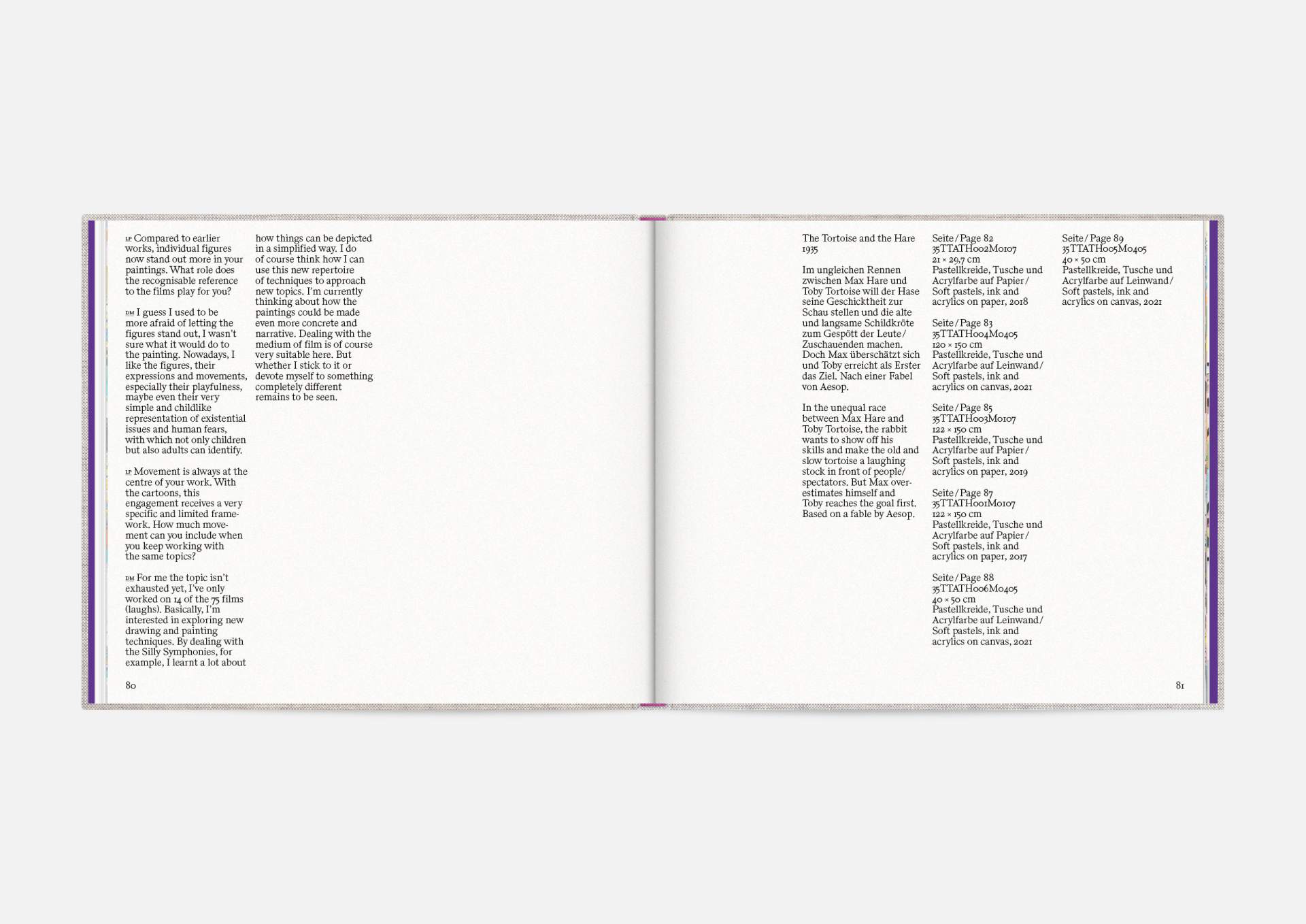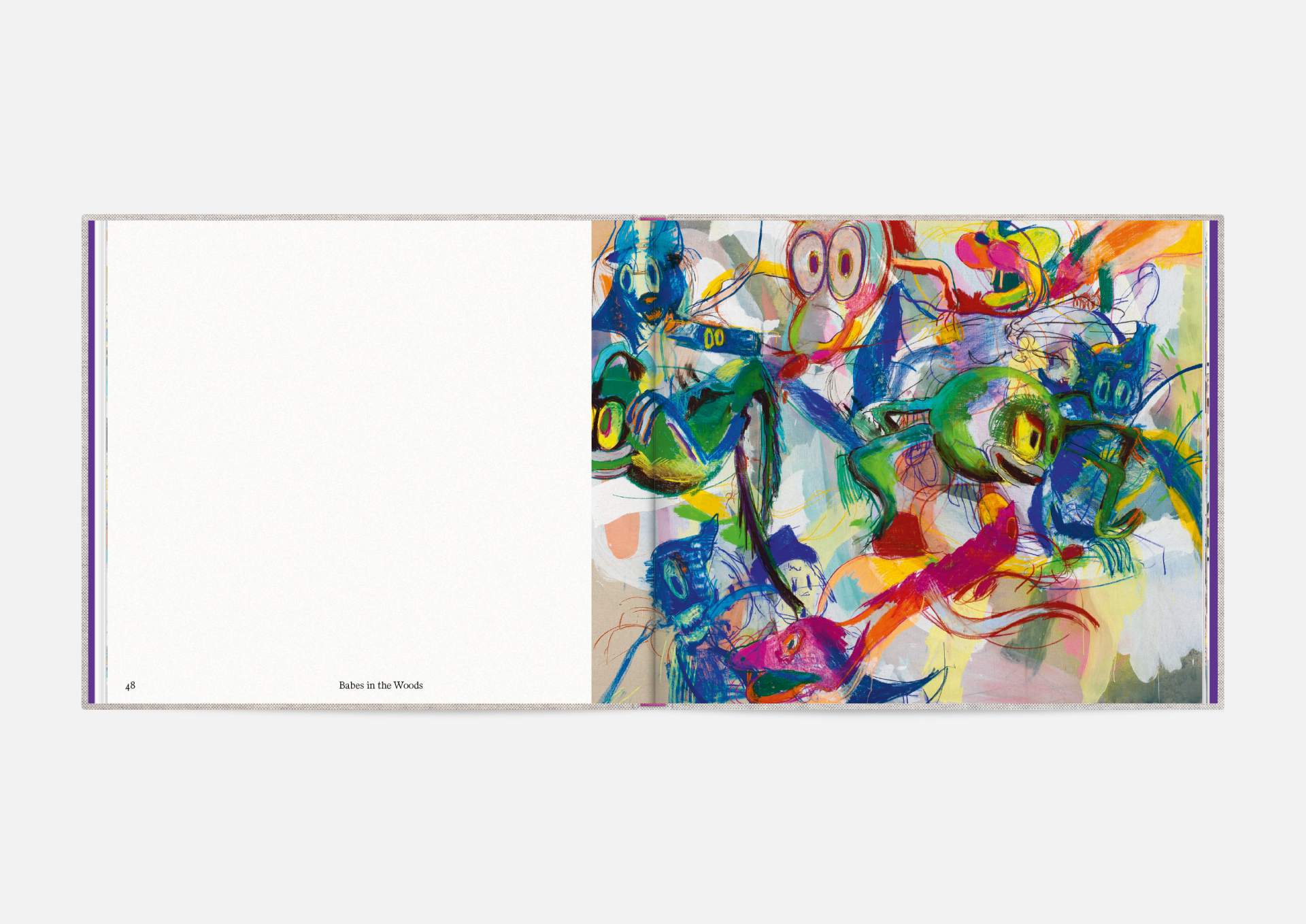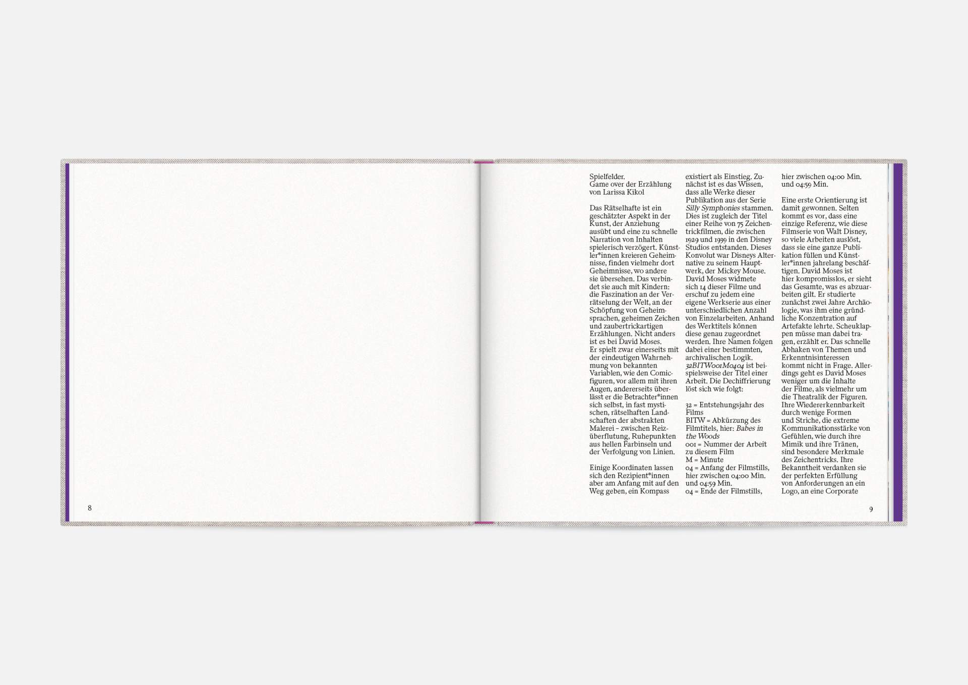 The book is the stage for the dynamic, explosive works. The proportions correspond to the film format of 4:5, and a linen cover references the coarse, unprimed canvas used; the print on matte uncoated paper hints at the chalky structures of David Moses’ works.