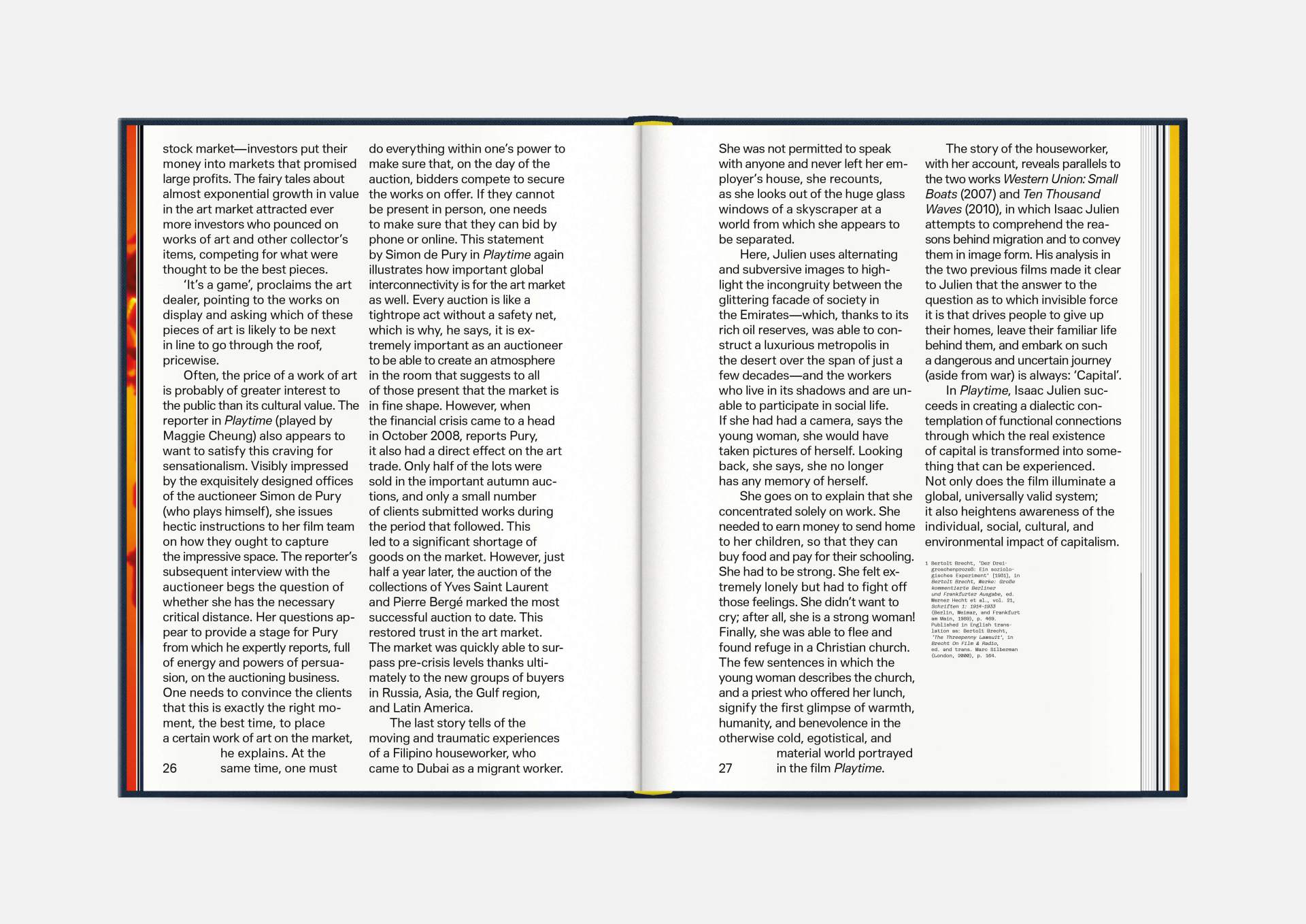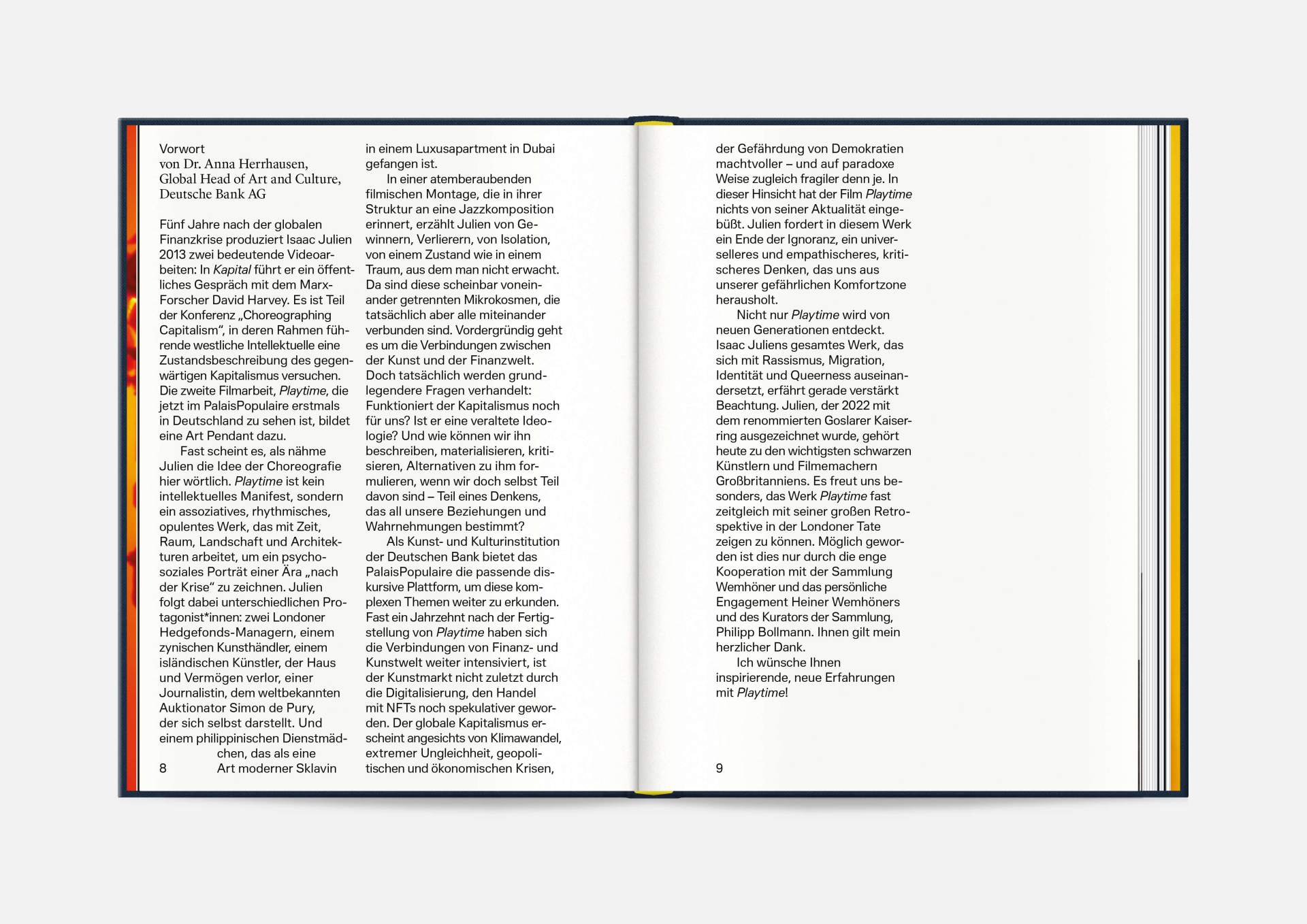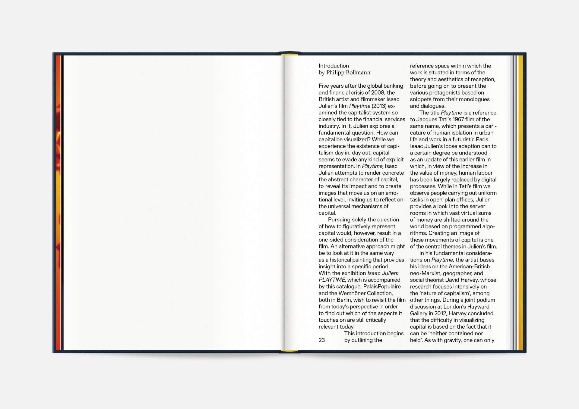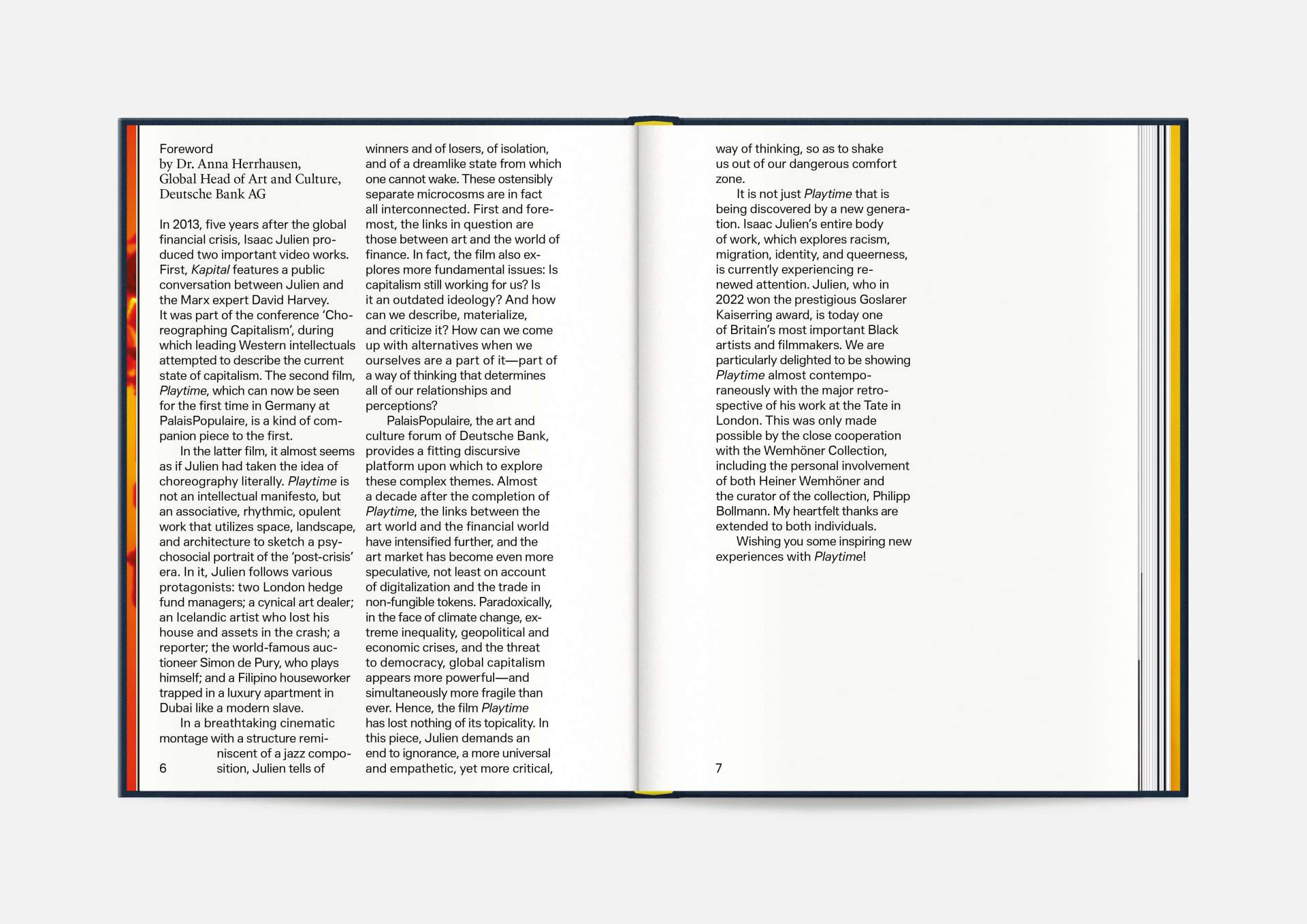 In his exhibition from March 8–July 10, 2023 at the PalaisPopulaire, Berlin, the influential British artist and filmmaker Isaac Julien presented his 2014 film “Playtime” on the world of art and finance and addresses a fundamental question: how can capital be visualized? Curated by Philipp Bollmann, Wemhöner Collection.