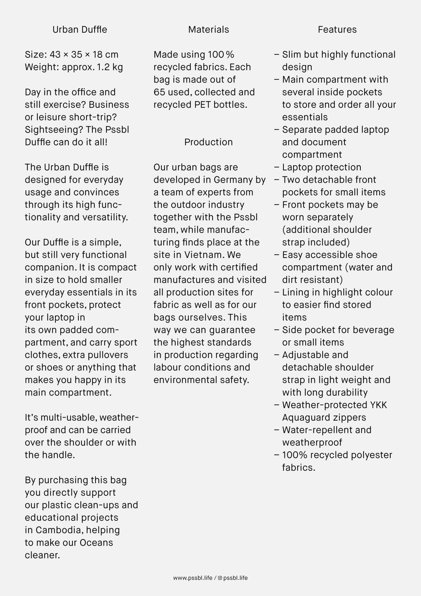 The idea was to design a bag, that matches the needs and culture of contemporary urban active people. And even more than that: to build a brand with the clear mission to protect our oceans and act as social responsible as possible. A brand for authentic people that connects design, functionality and durability with social and environmental responsibility. With the minimalistic design PSSBL does not only represent a contemporary urban language but also keeps up to date for a long time.