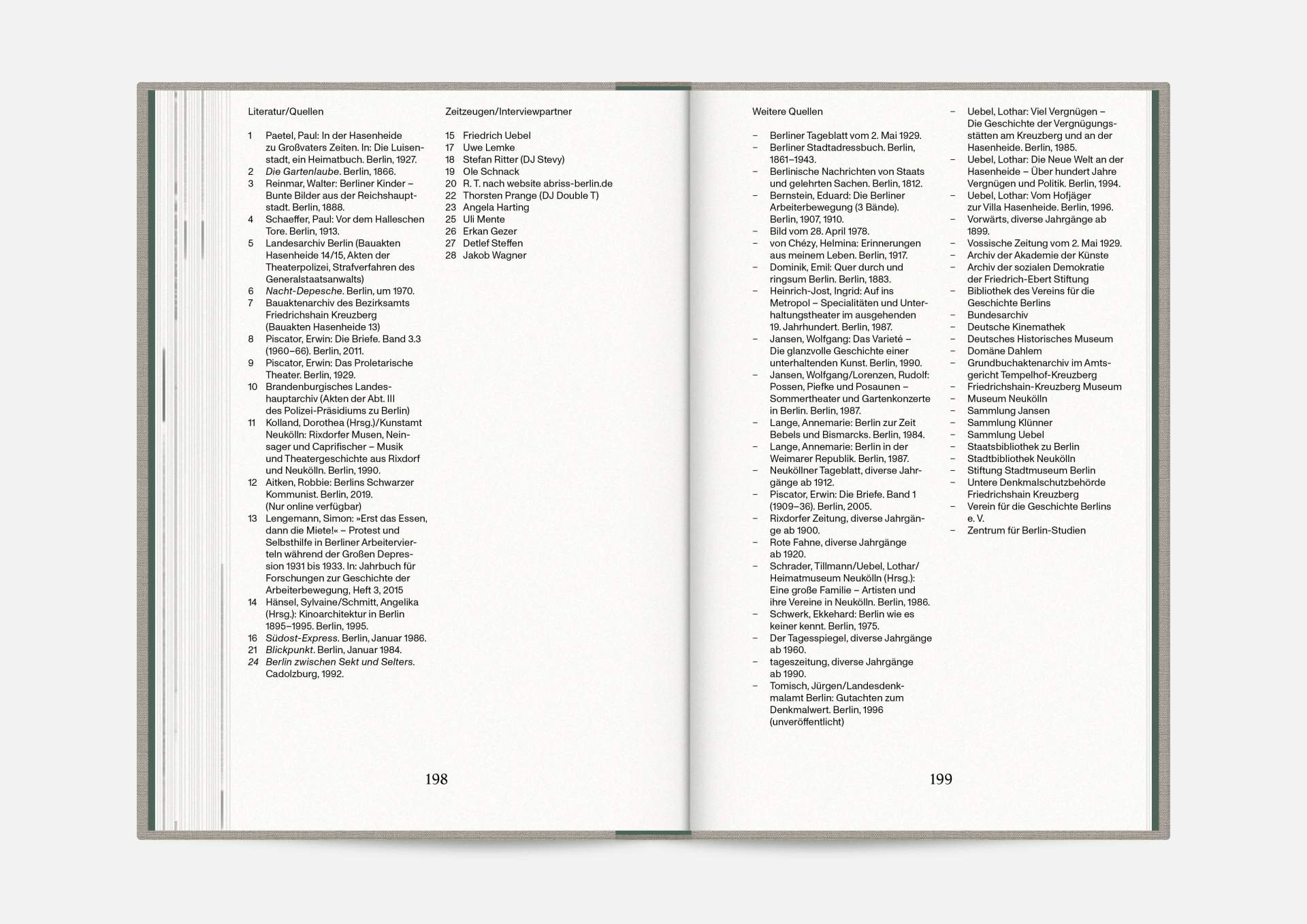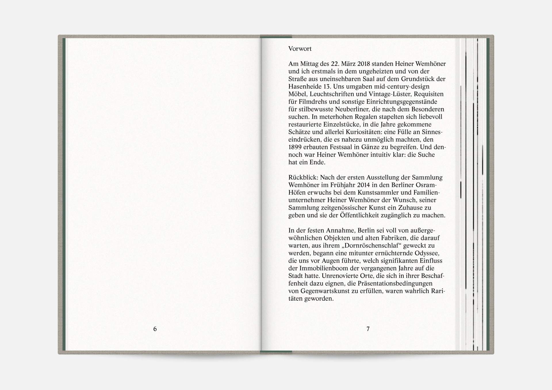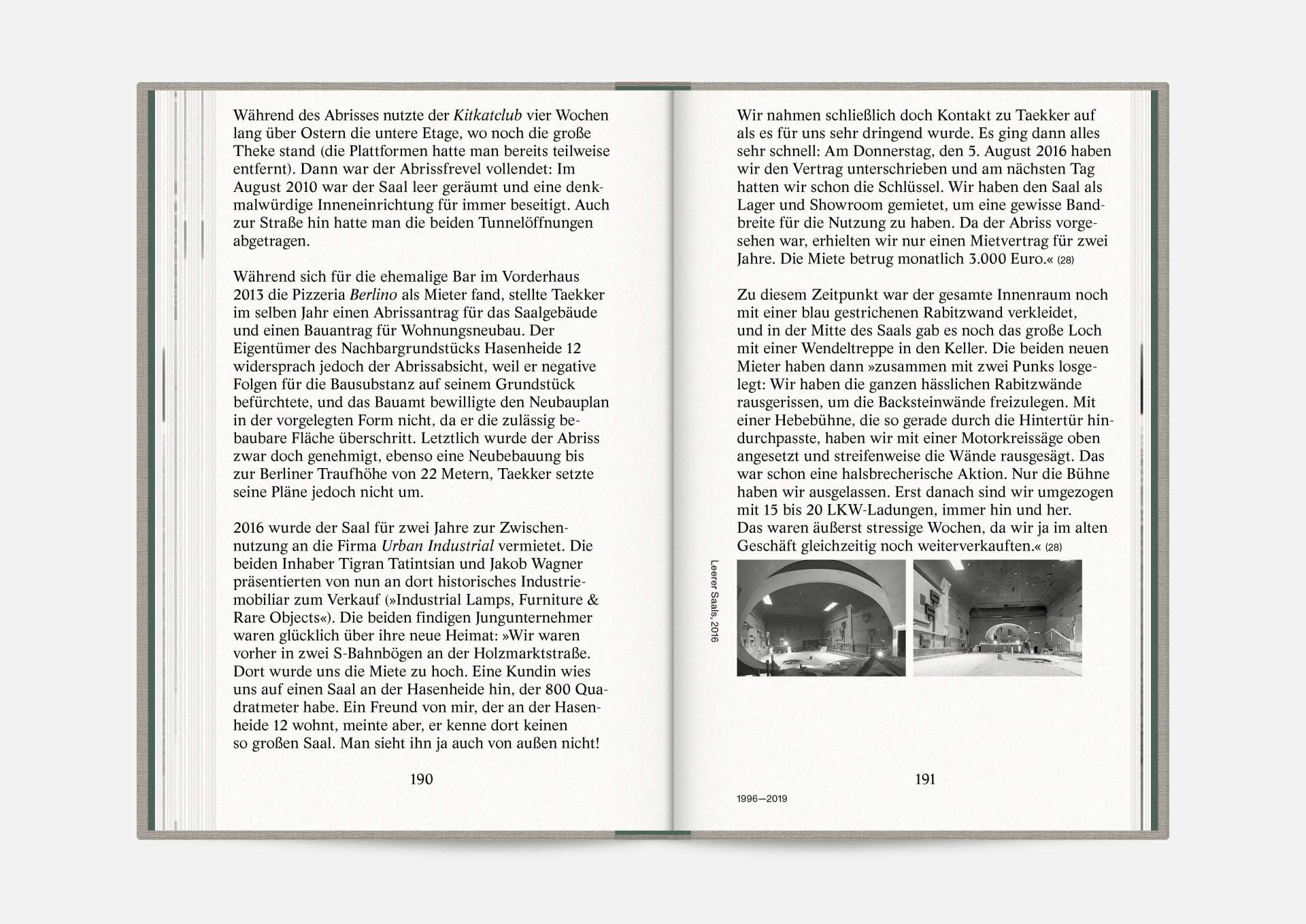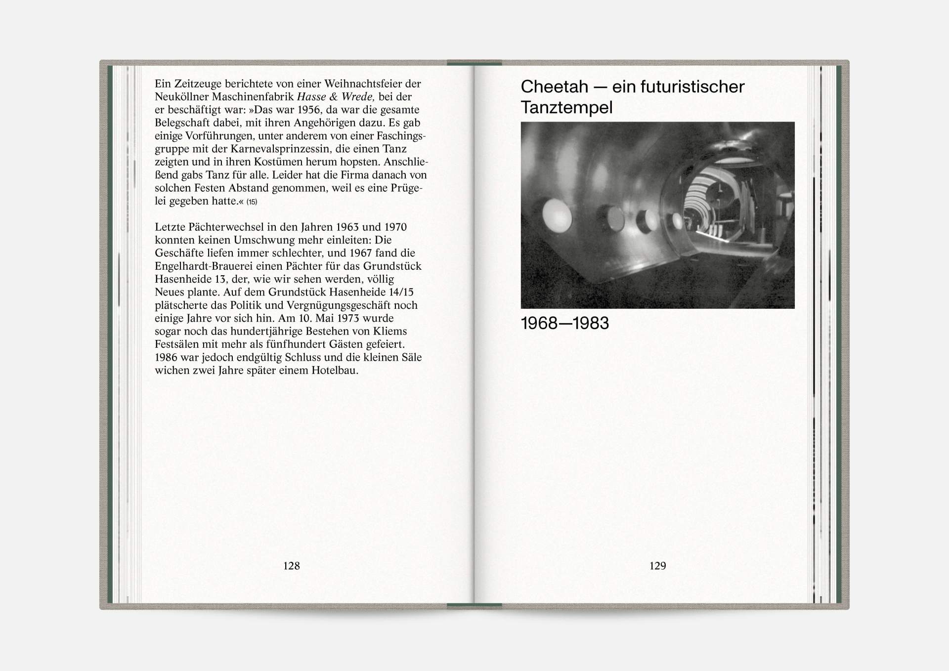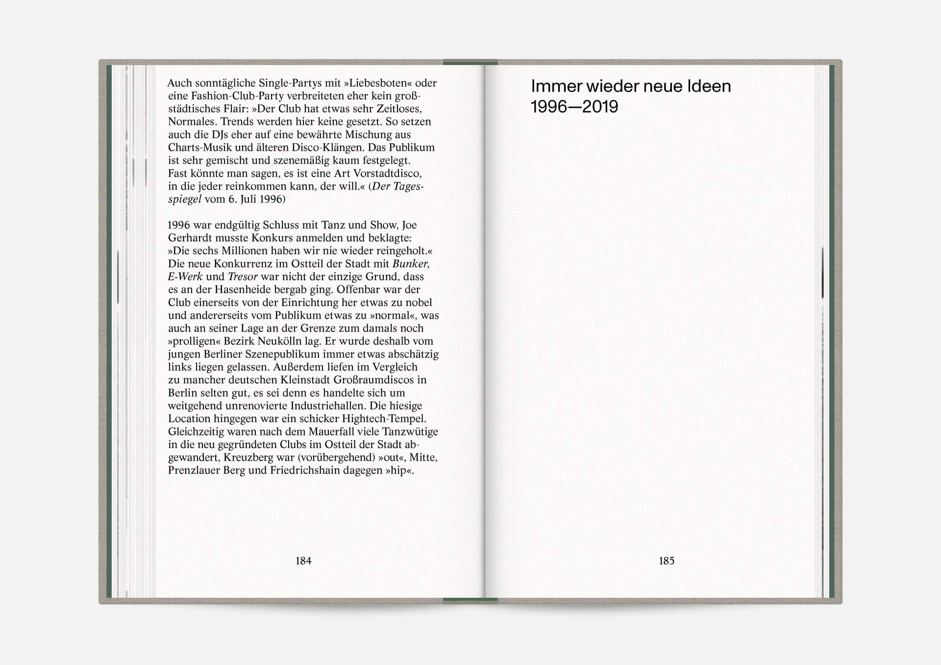 The book “Hasenheide 13” is a little treasure. Indulging in black and white imagery, it takes us on a journey into Berlin’s past. Stories and anecdotes entwine around a ballroom that will serve as an exhibition space for the Wemhöner Collection’s contemporary art after its renovation. Radically modern typesetting, together with a classic bibliophile setting, lovingly bound in embossed linen, create an exciting contrast.