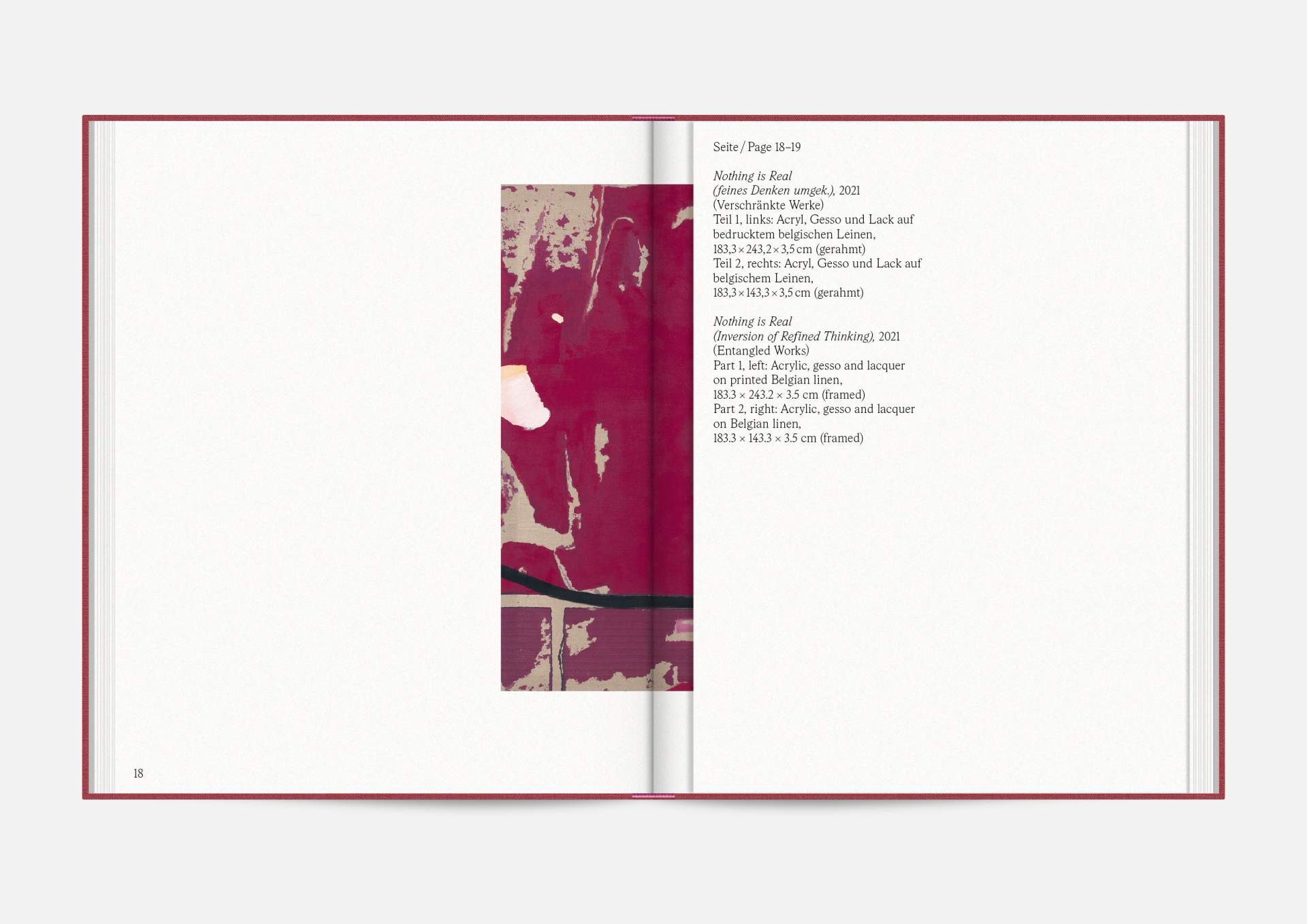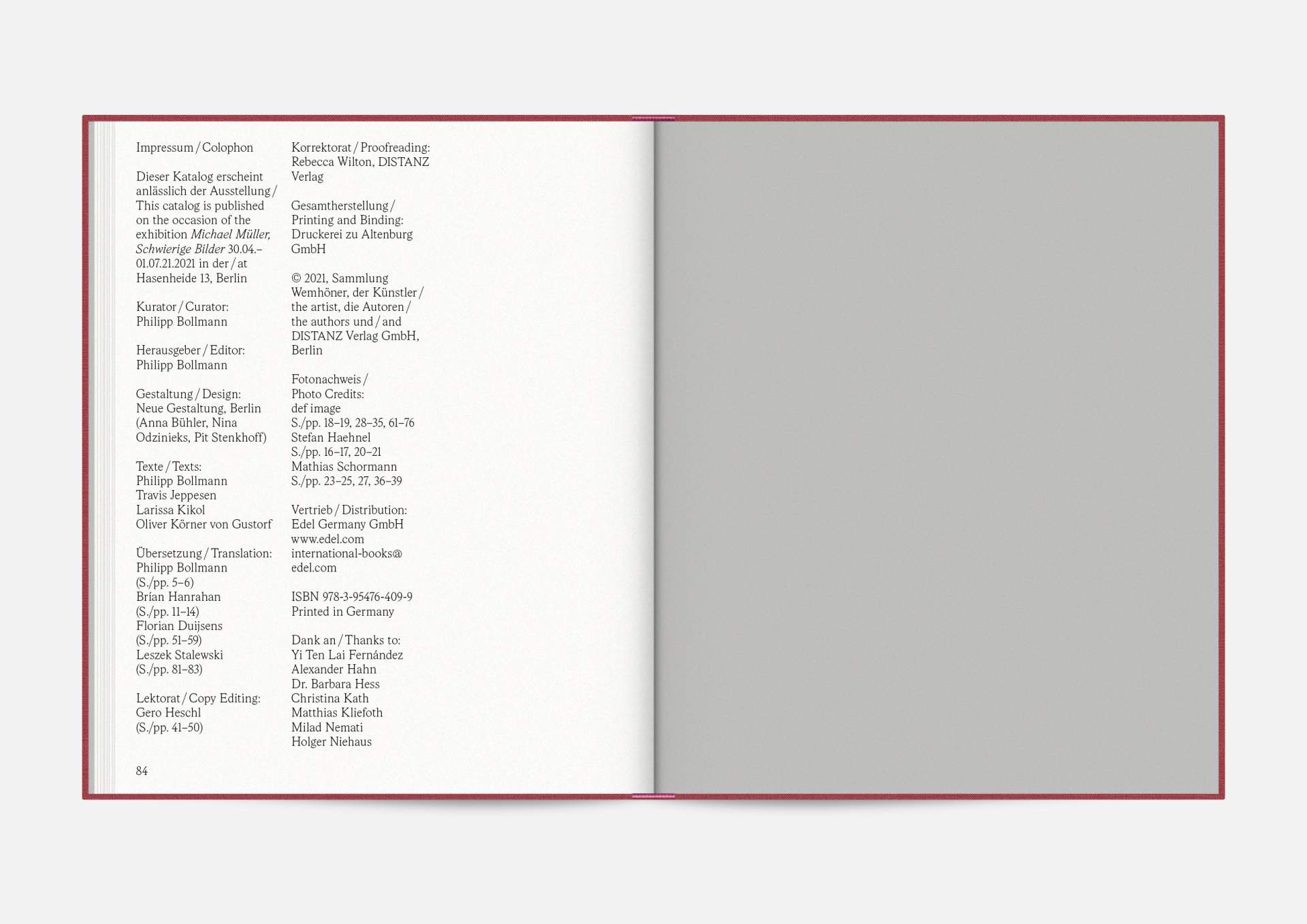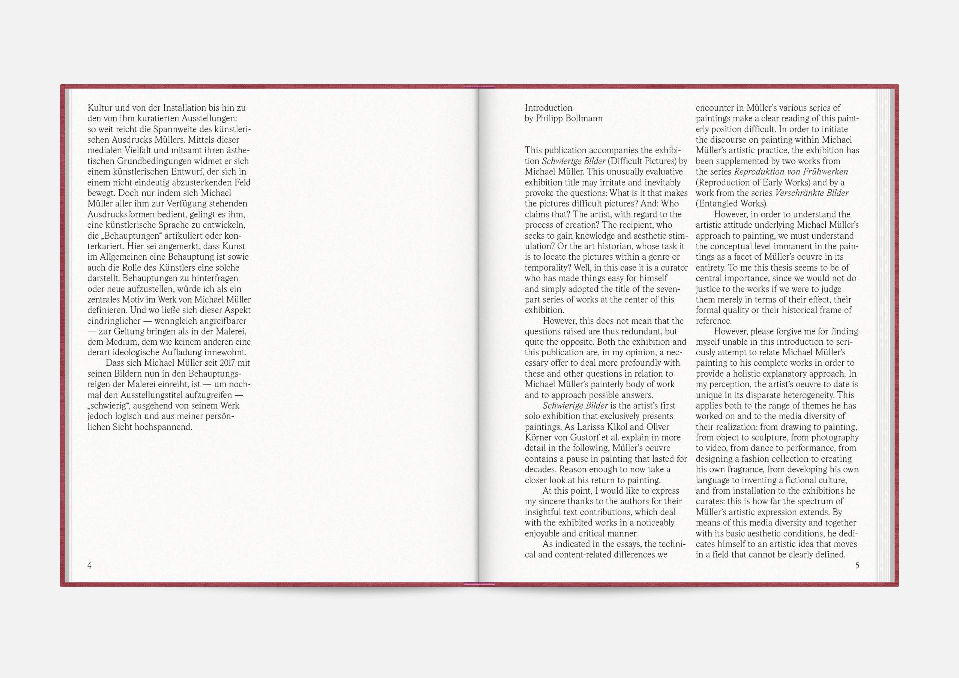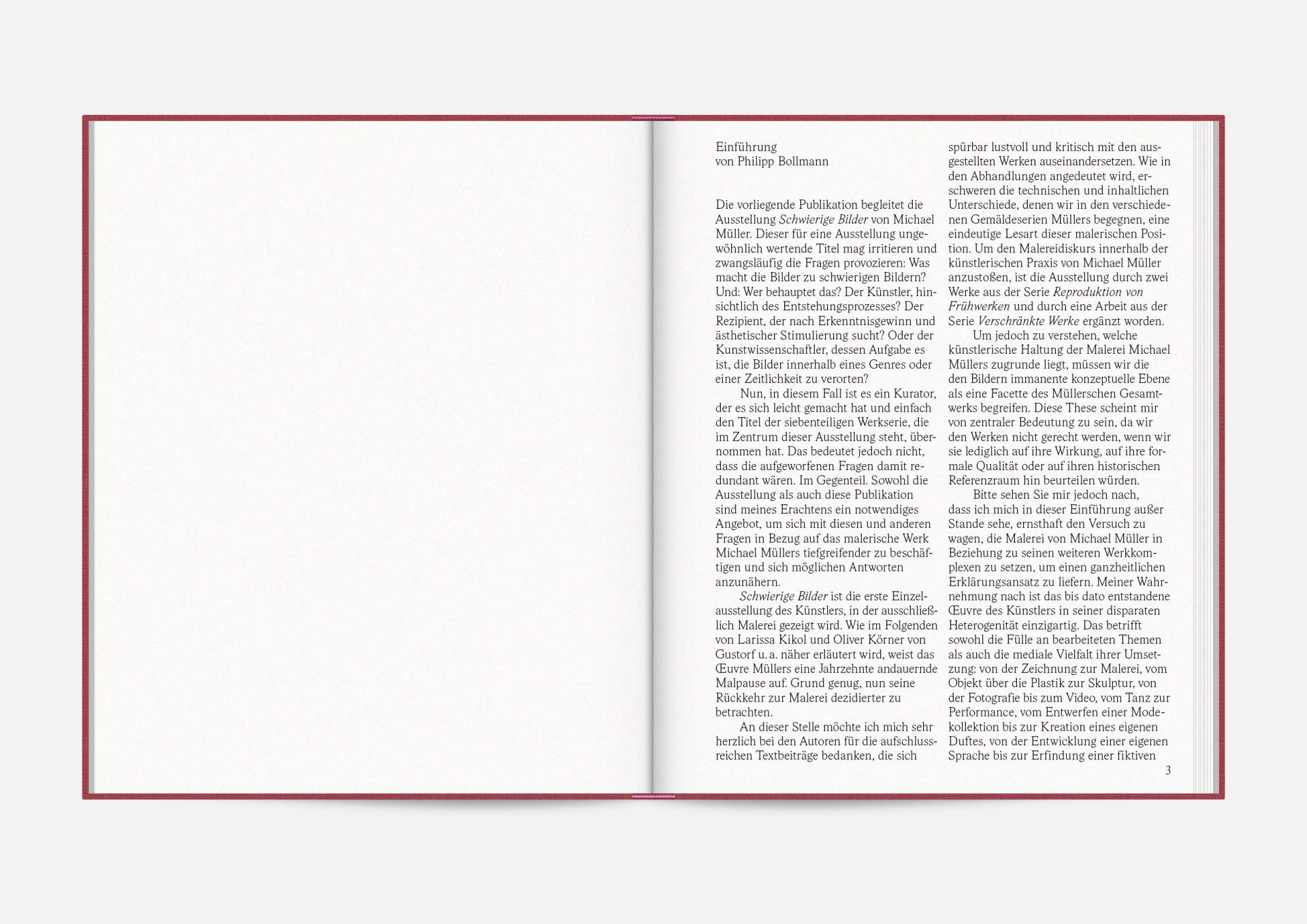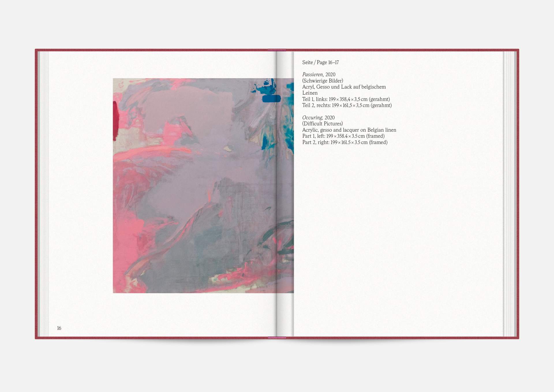The exhibition catalog to give space to Michael Müller’s diptychs. According to the show, parts of longer and narrower canvas facing each other in folding pages in a wide horizontal aligned publication format. Thus, it gives an idea of the overwhelming large formats of abstract expressionist works that seem to have found their natural habitat in the impressive ballrooms of the Wemhöner Collection at Hasenheide 13.