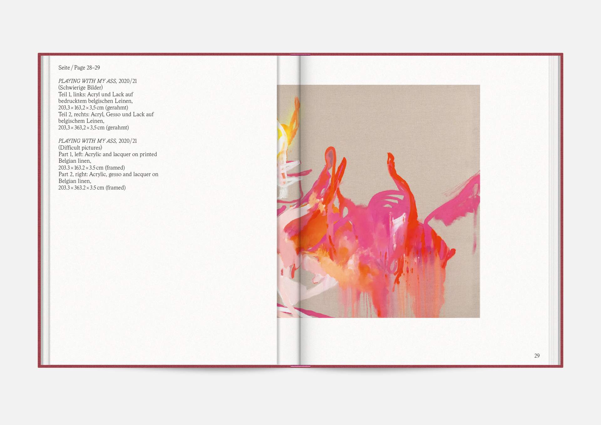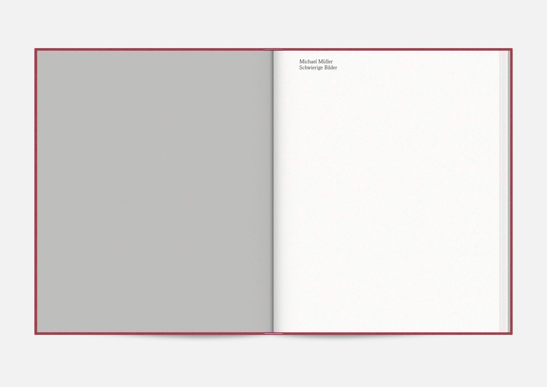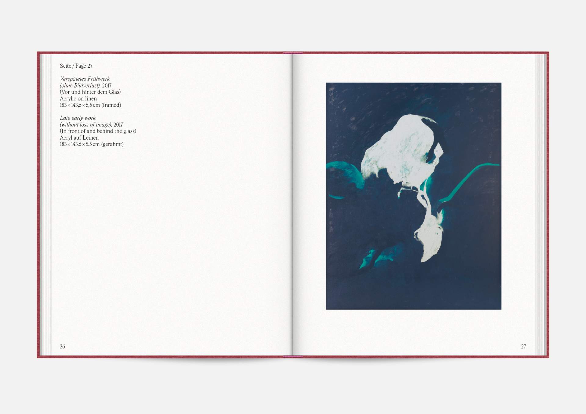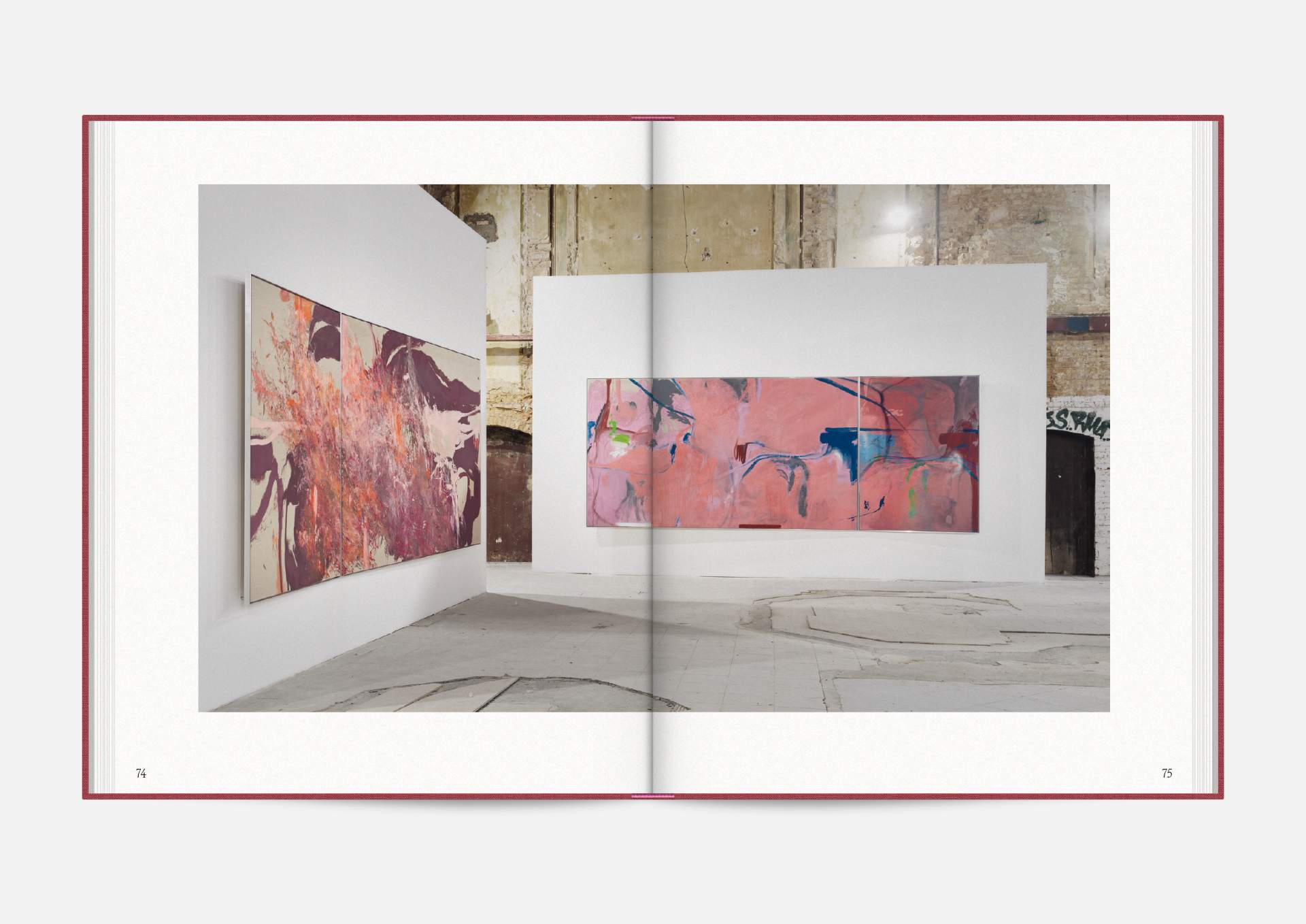 The exhibition catalog to give space to Michael Müller’s diptychs. According to the show, parts of longer and narrower canvas facing each other in folding pages in a wide horizontal aligned publication format. Thus, it gives an idea of the overwhelming large formats of abstract expressionist works that seem to have found their natural habitat in the impressive ballrooms of the Wemhöner Collection at Hasenheide 13.