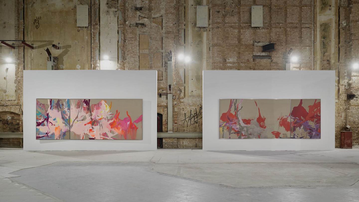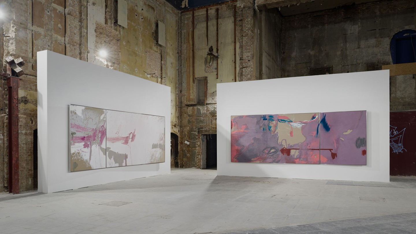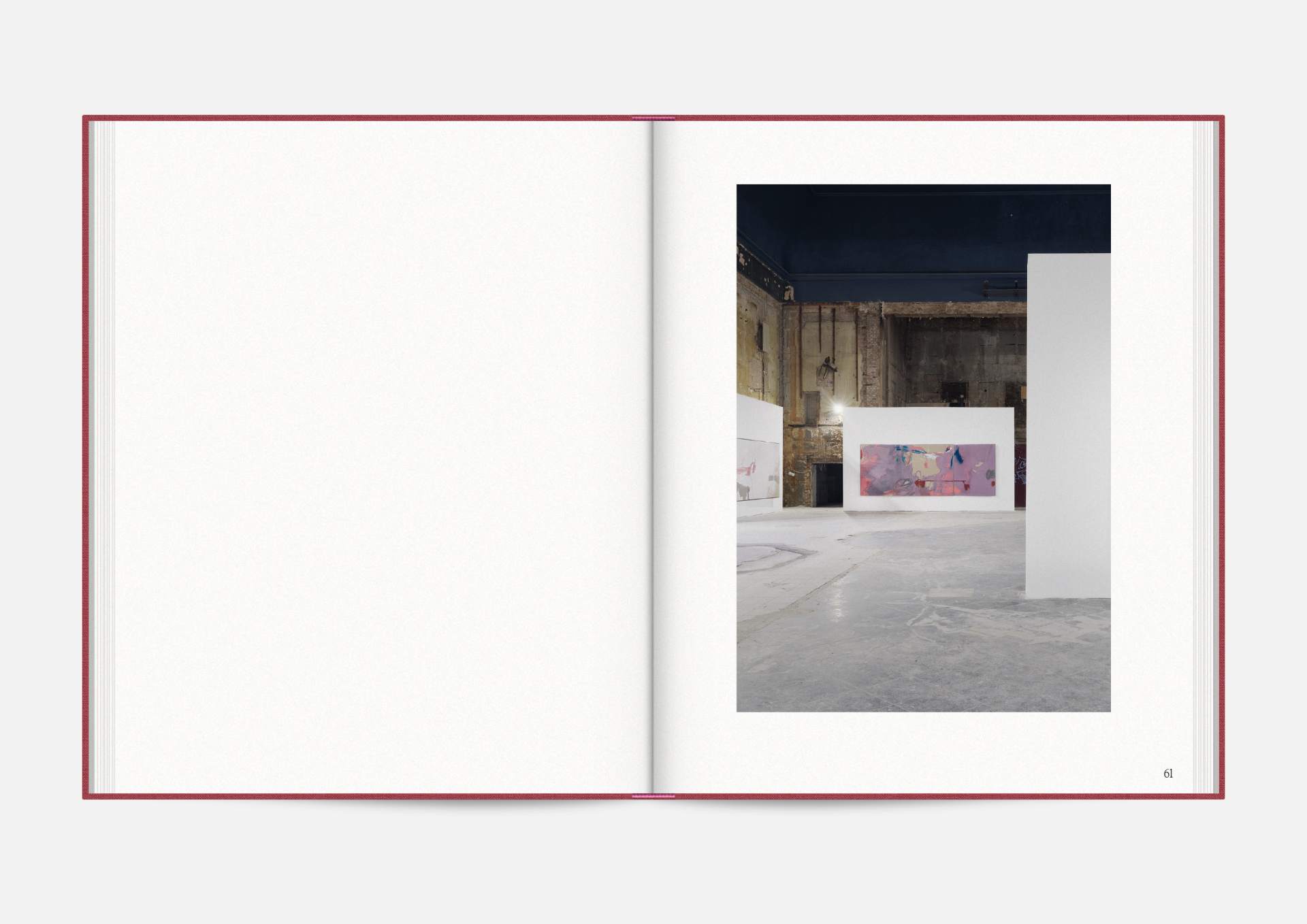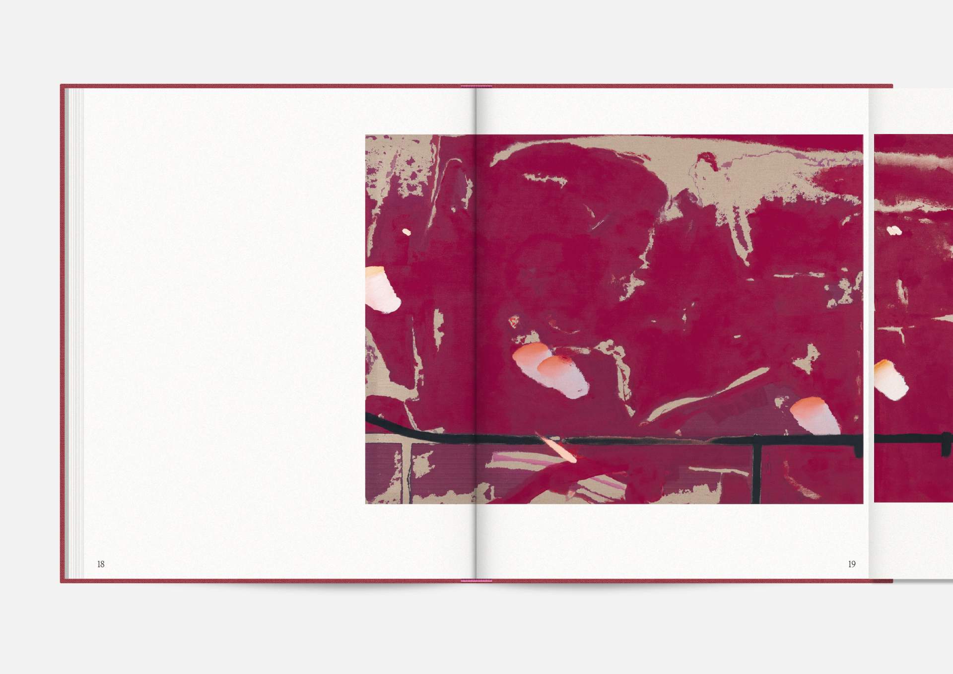 The exhibition catalog to give space to Michael Müller’s diptychs. According to the show, parts of longer and narrower canvas facing each other in folding pages in a wide horizontal aligned publication format. Thus, it gives an idea of the overwhelming large formats of abstract expressionist works that seem to have found their natural habitat in the impressive ballrooms of the Wemhöner Collection at Hasenheide 13.