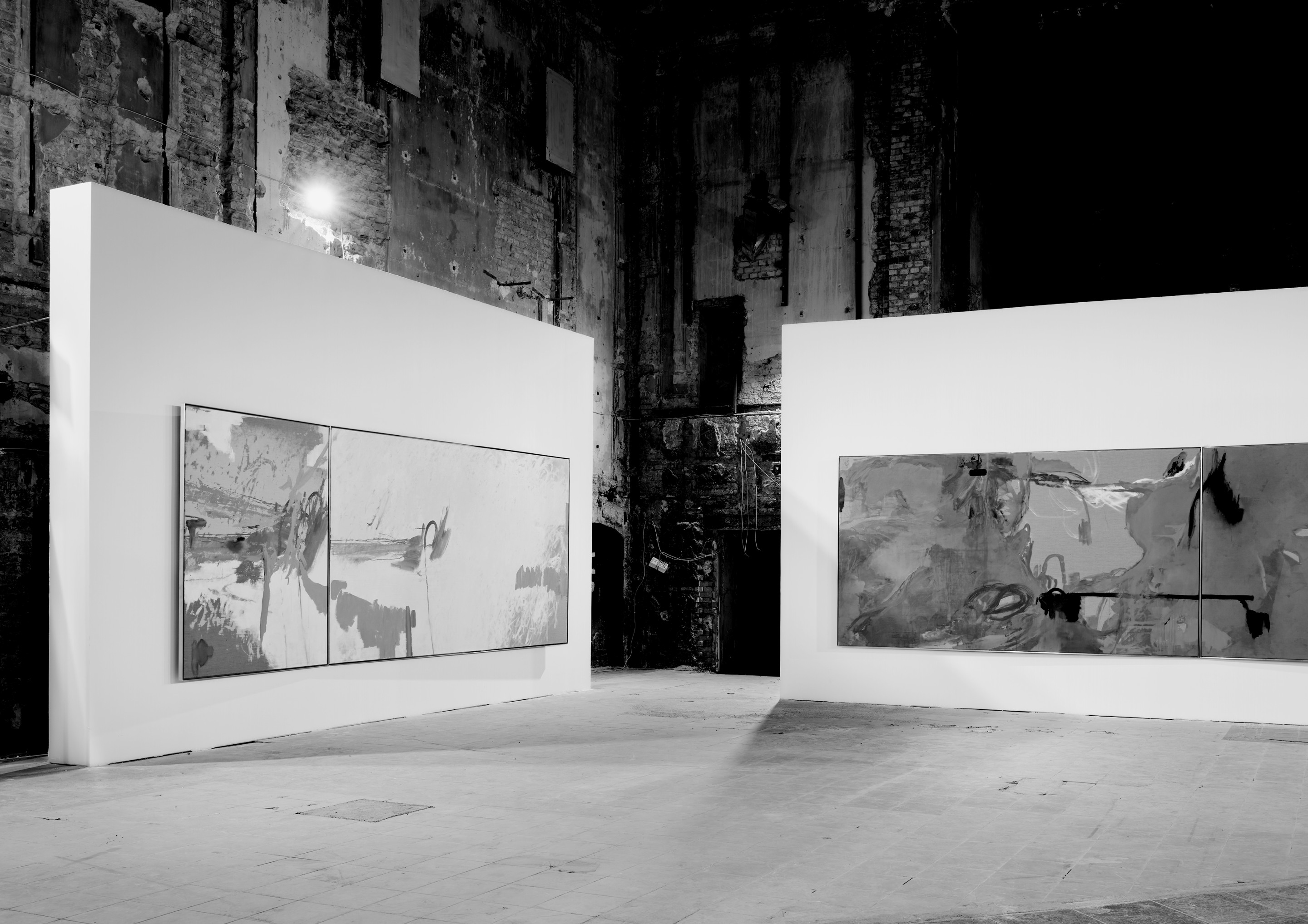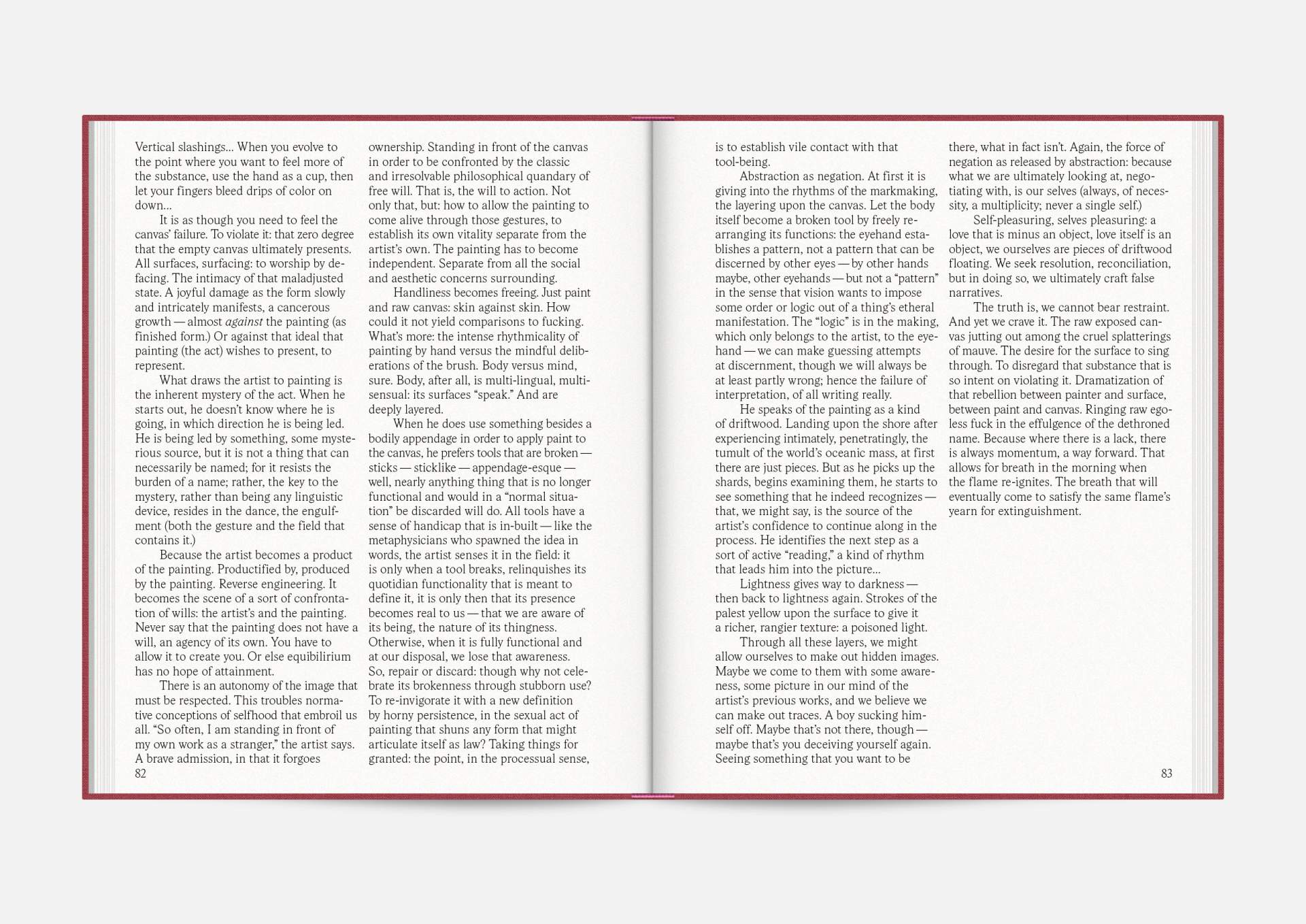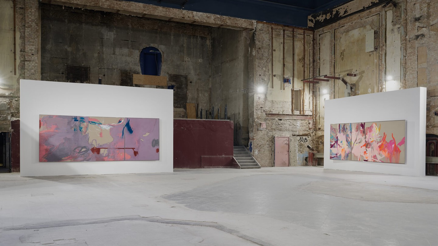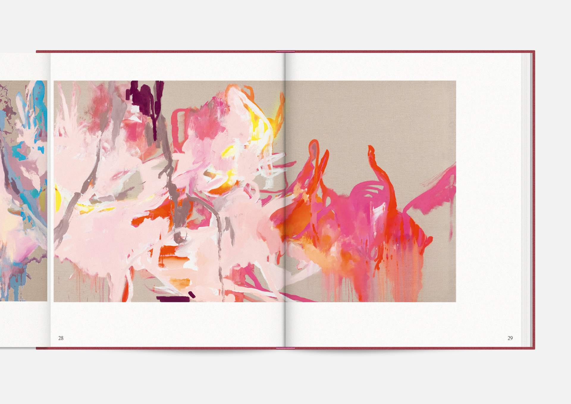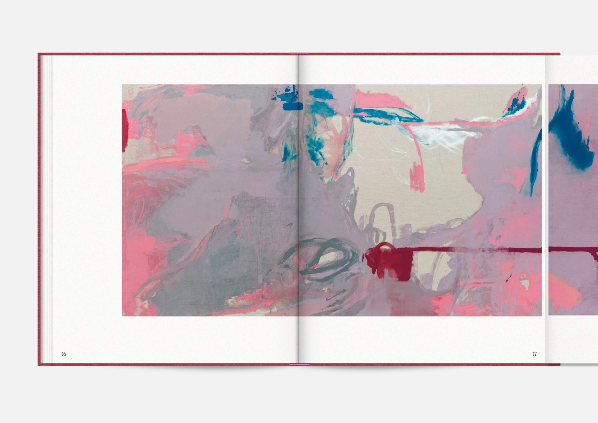 The exhibition catalog to give space to Michael Müller’s diptychs. According to the show, parts of longer and narrower canvas facing each other in folding pages in a wide horizontal aligned publication format. Thus, it gives an idea of the overwhelming large formats of abstract expressionist works that seem to have found their natural habitat in the impressive ballrooms of the Wemhöner Collection at Hasenheide 13.