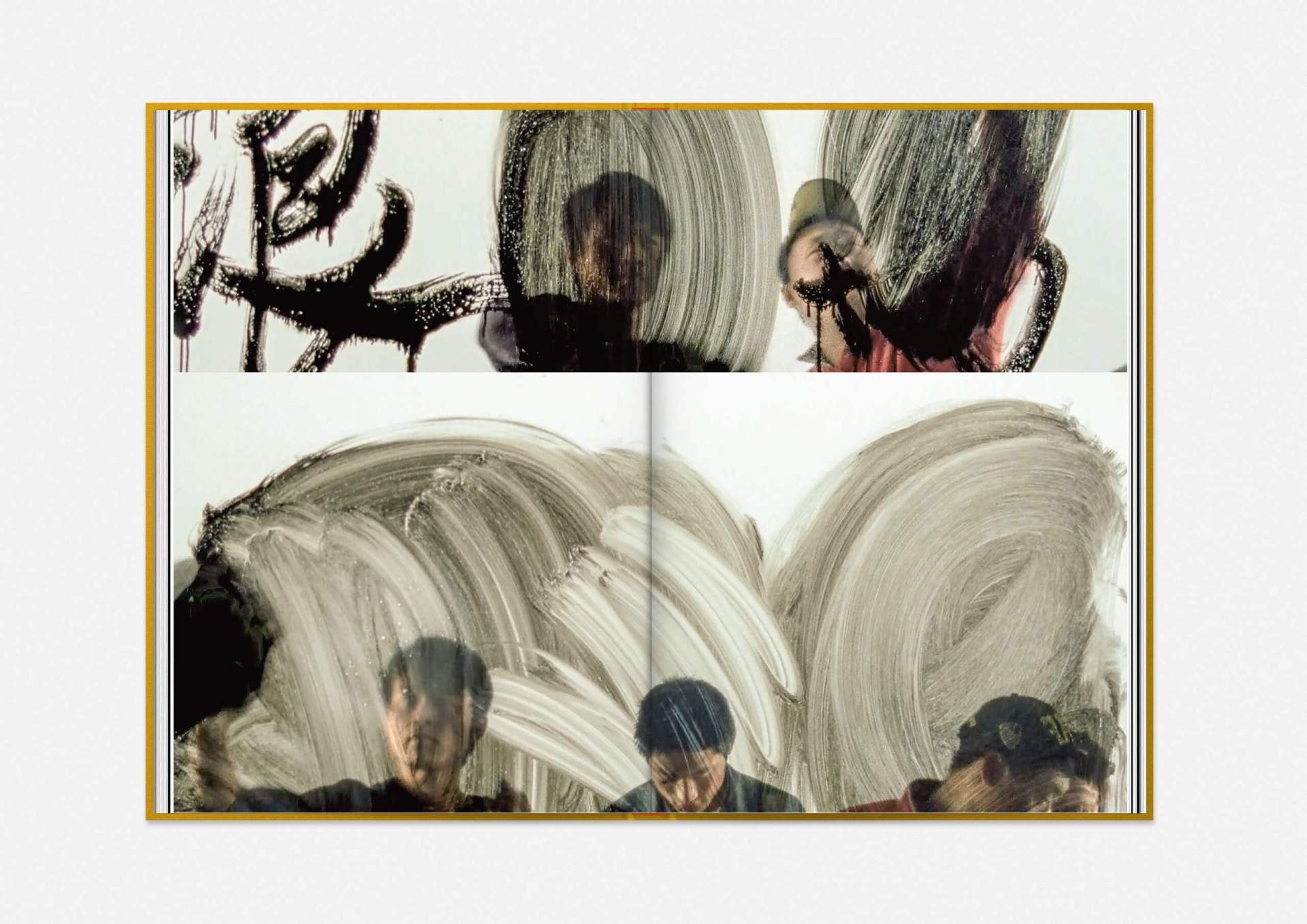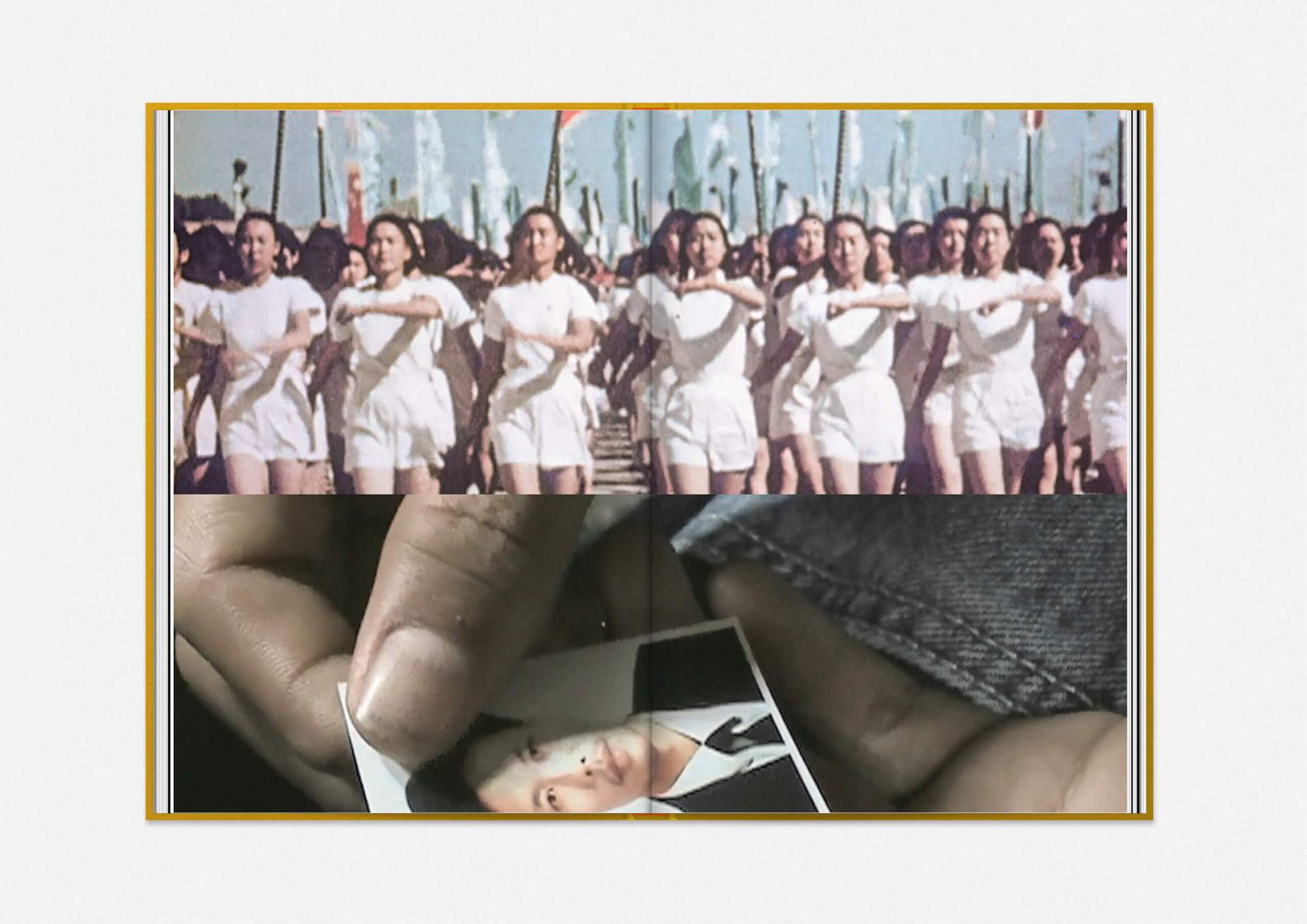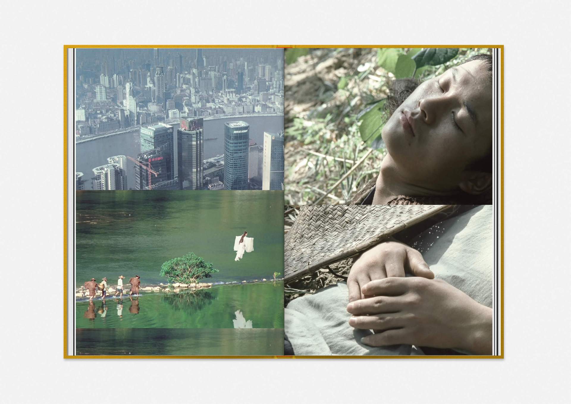 Above all, however, ‘trigger’ images permeate the publication, film stills with Play arrows that can be set in motion using a specially designed app. This reveals the inhospitable, rocky terrain of Julian Charrière’s work; it allows us to chase through the forest in Erik Schmidt’s Hunting Grounds, free fall from the sky with Michael Najjar or float like sleepwalkers through the black-and-white worlds of Yang Fudong’s New Women.