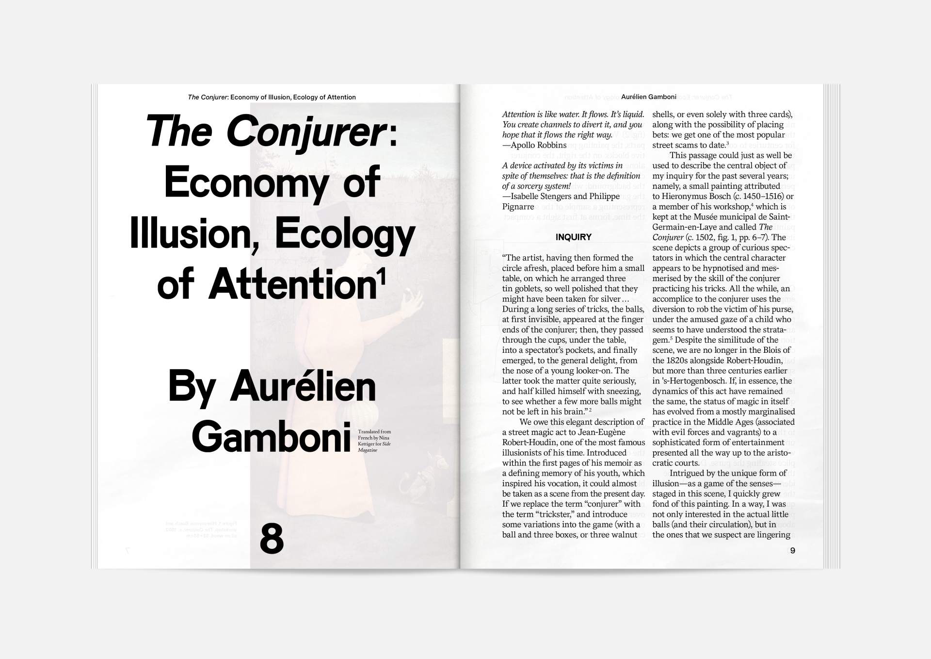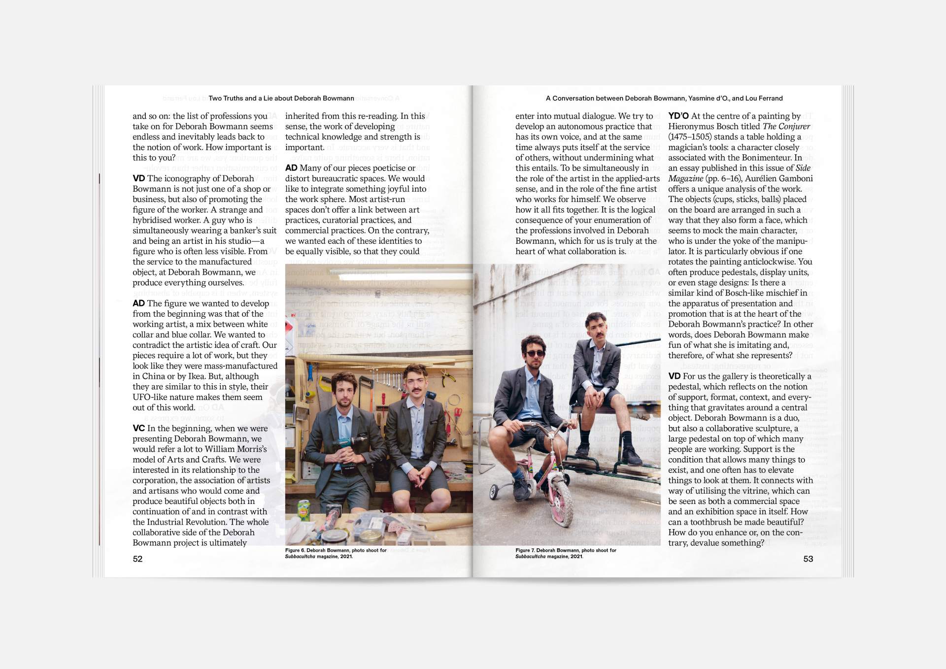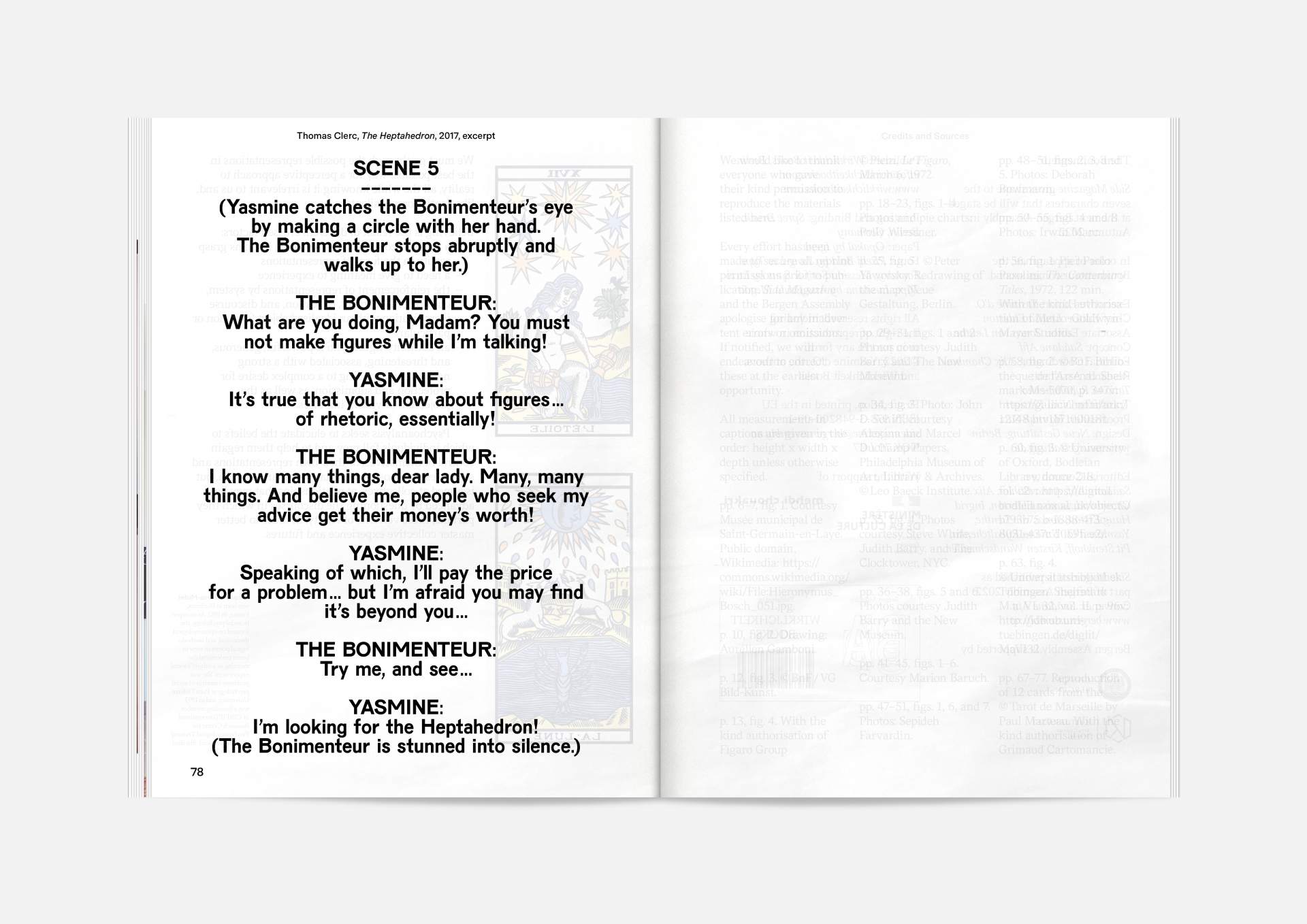 Side Magazine gathers the seven characters in The Heptahedron, a play written by the French poet, essayist, and scholar Thomas Clerc in 2016. These characters are the Professor, the Moped Rider, the Bonimenteur, the Fortune Teller, an Acrobat, the Coalman, and the Tourist.