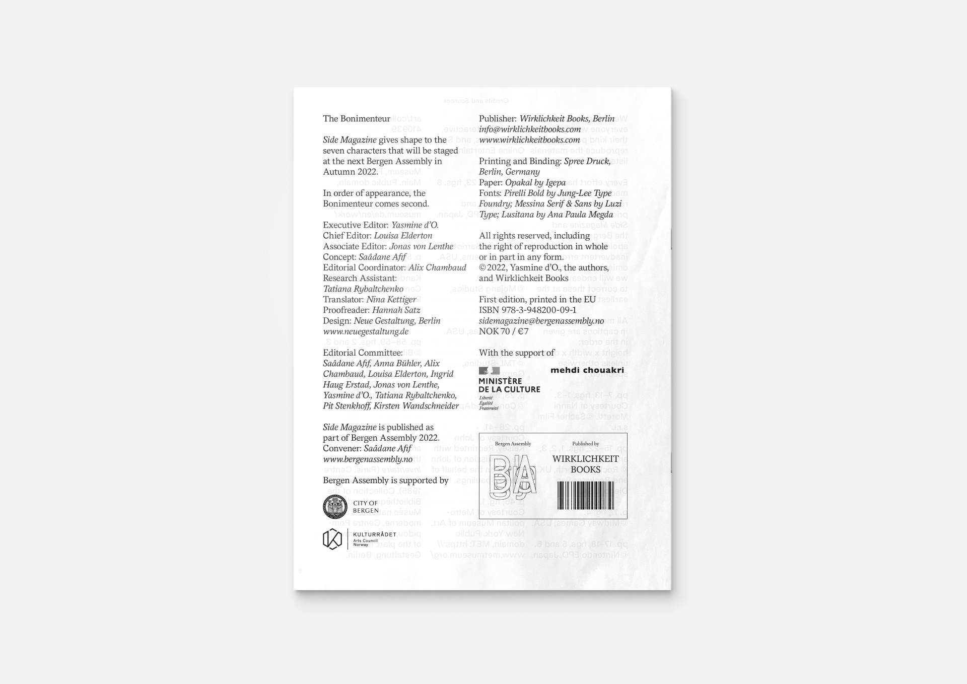 Side Magazine accompanies the fourth Bergen Assembly ↗, the contemporary art triennial in Bergen, Norway, in 2022, as a site of research convened by artist Saâdane Afif. Afif has invited Berlin-based Yasmine d’O. as curator of the edition and executive editor of Side Magazine.