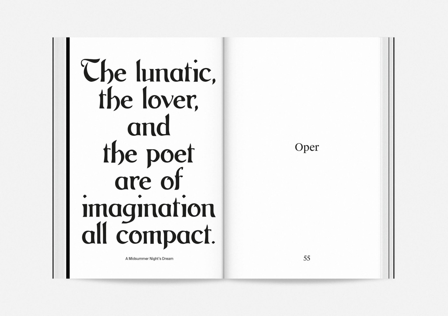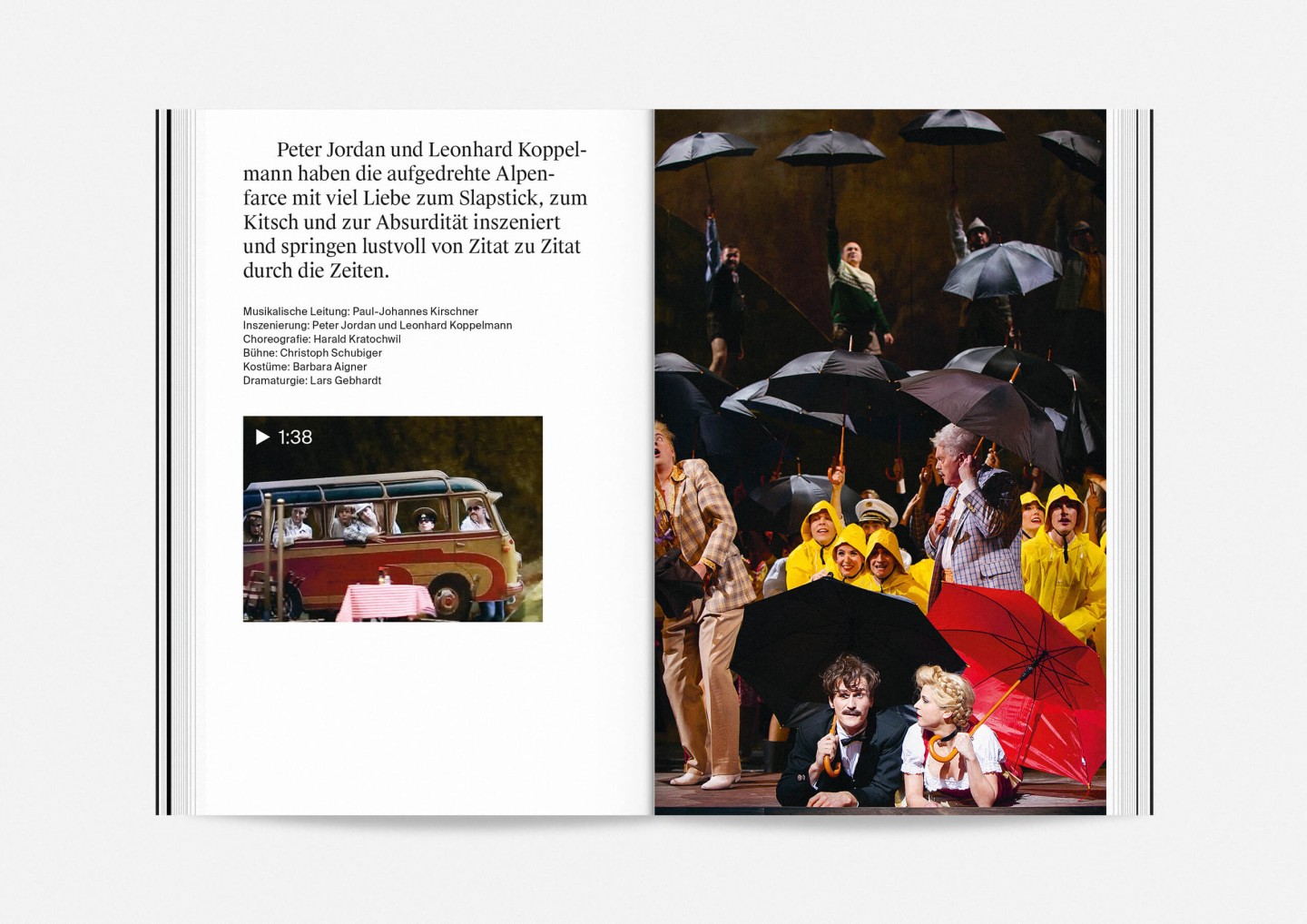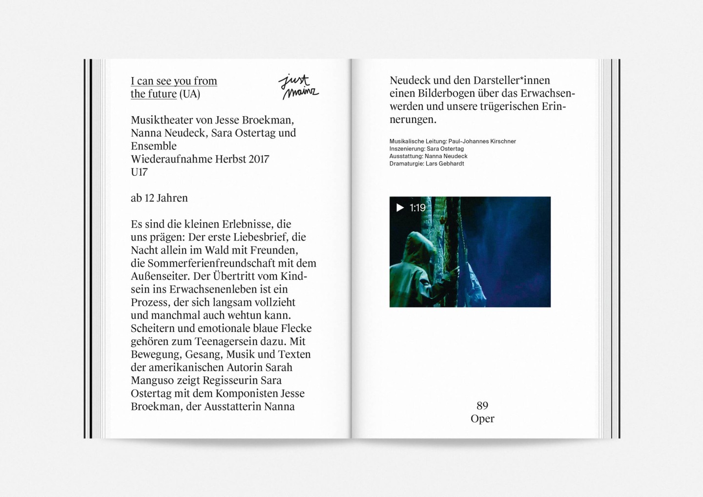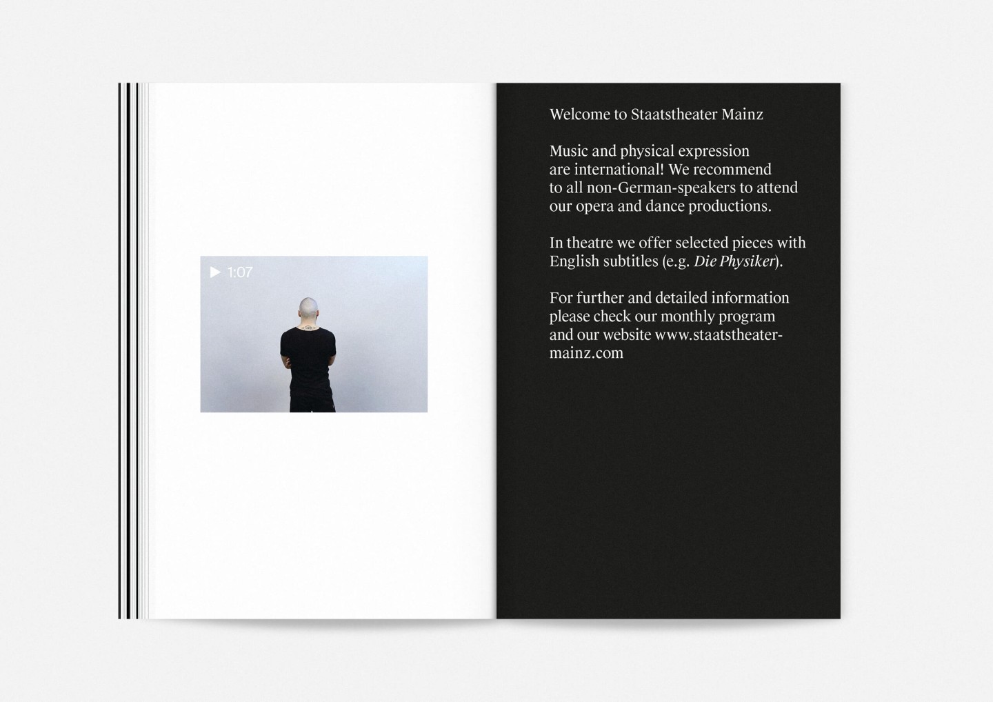 Constituting one half of the booklet — and creating its distinct half-black, half-white edge — this portrait gallery deliberately precedes the information section with details on the upcoming opera, drama, dance, and concert premieres and repertoire pieces presented in a clearly structured overview characterized by large lettering, clear graphics, and the theatre’s highly recognizable star logo. The result is a seasonal program that aims to inform and inspire, offering an immediate and deeply personal introduction to the ideas and workings of Staatstheater Mainz.