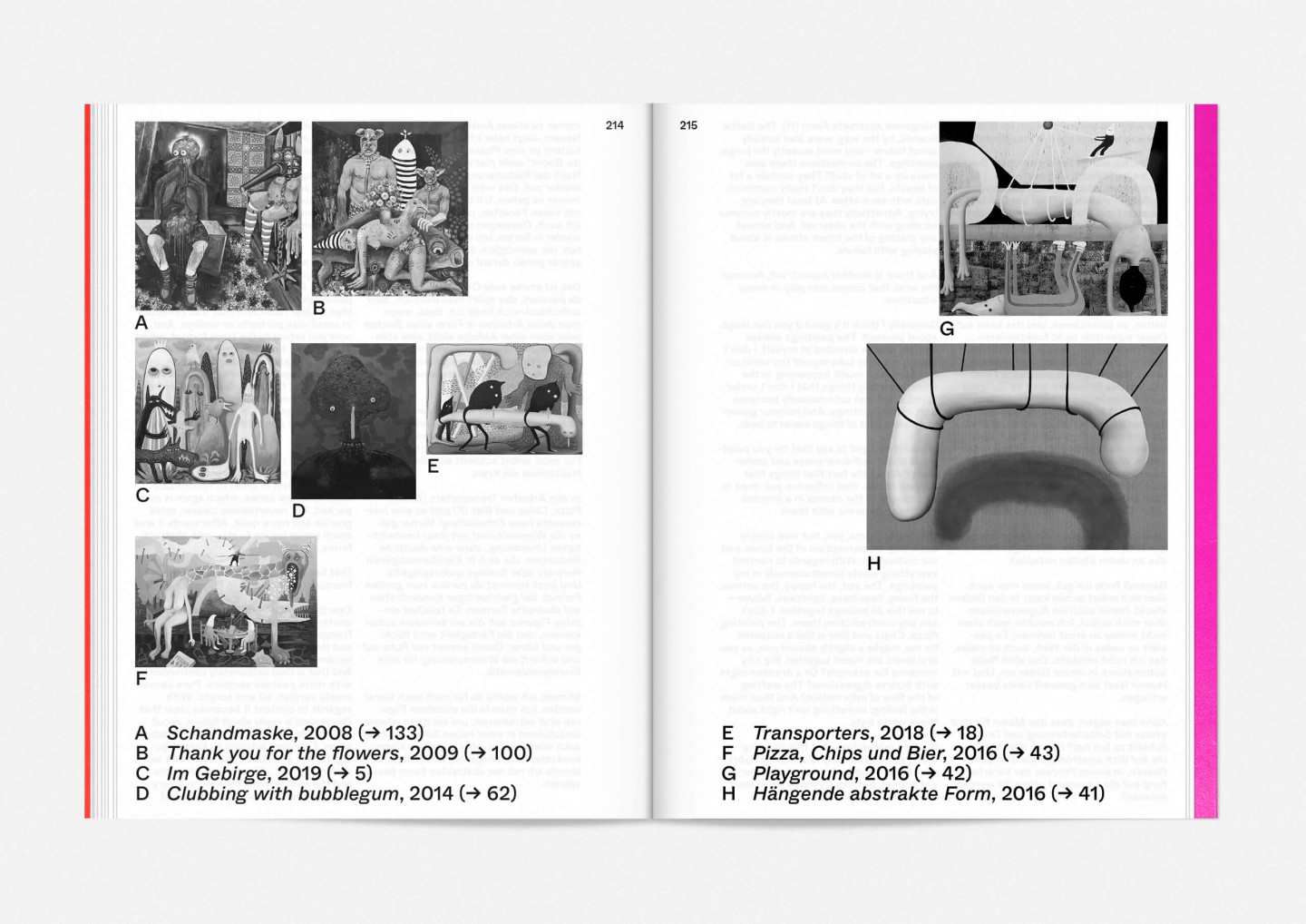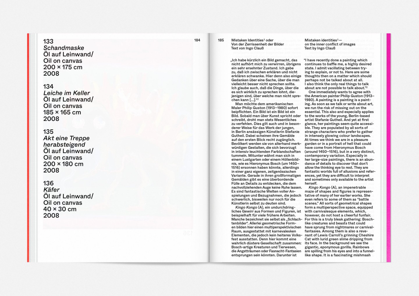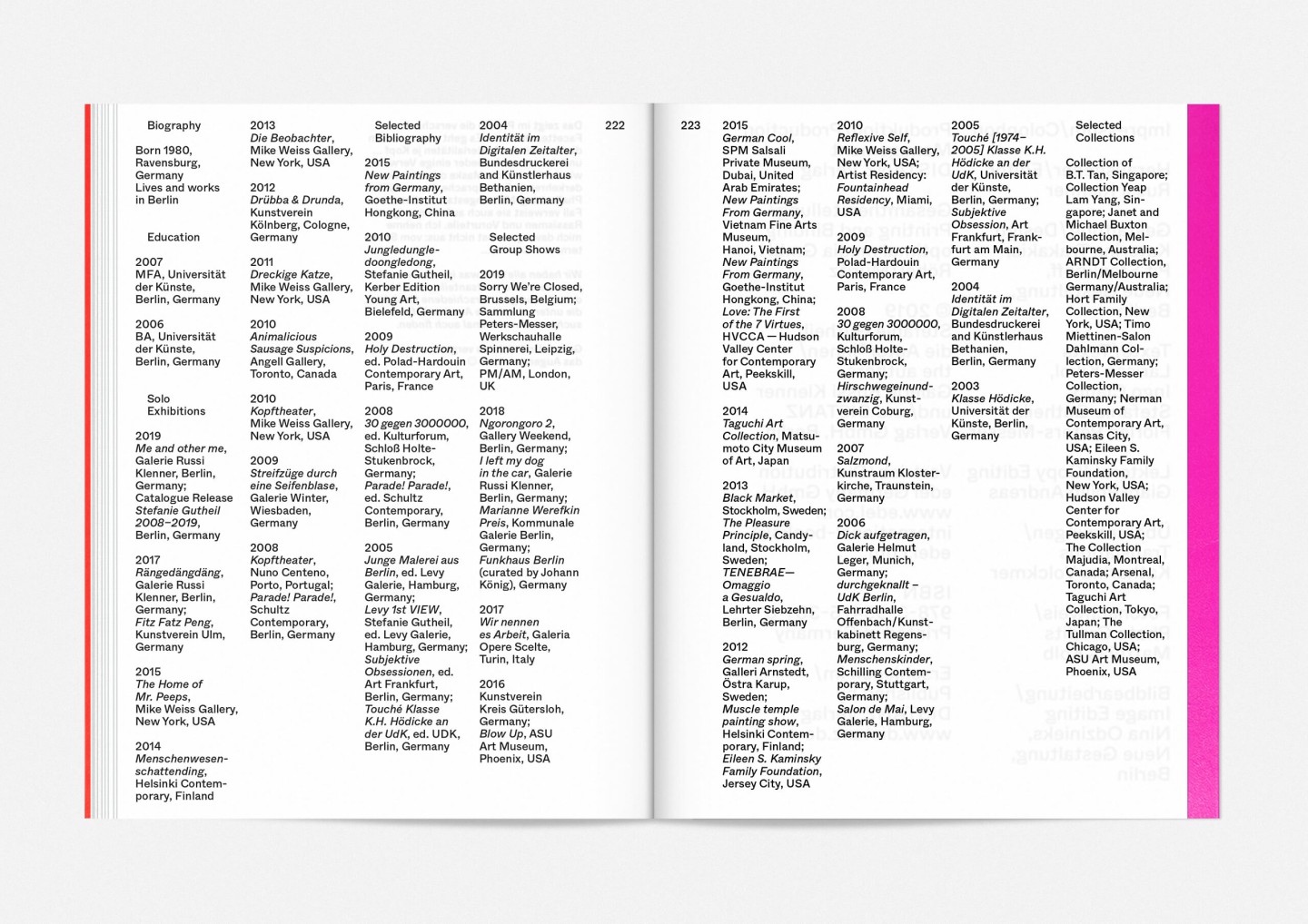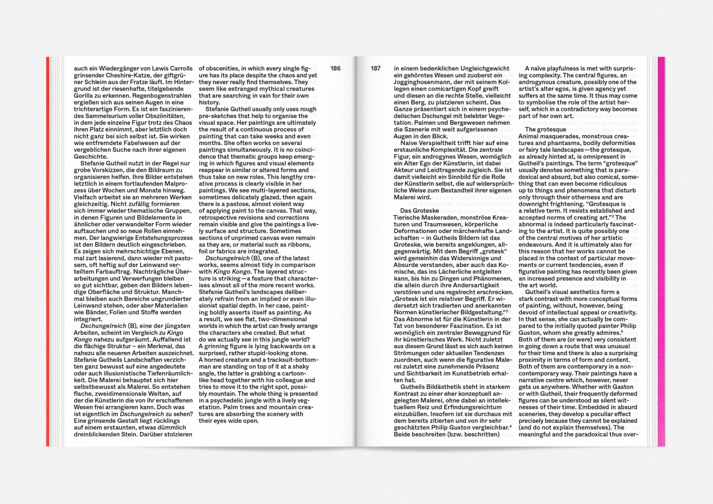 The extensive monograph of Stefanie Gutheil’s work from 2008 through 2019 documents her creative approach and humorous engagement with the demons of our time. The design works with basic elements to refer to the characteristics of the artwork and the artist’s personality. Though the book has its own independent aesthetics and an austere look, it provides enough space for the art to speak for itself.