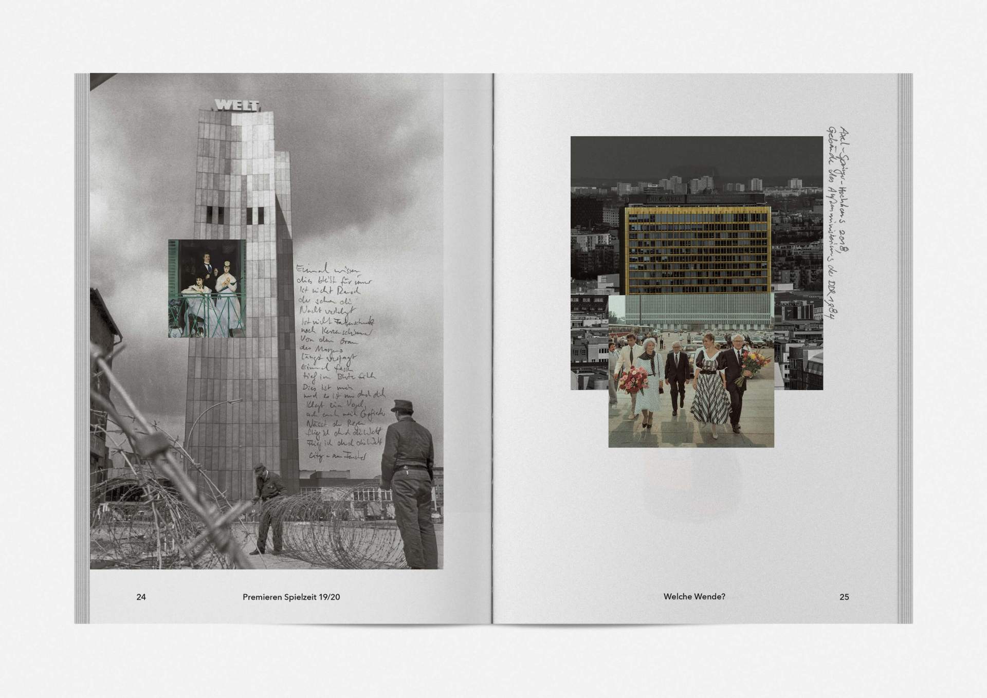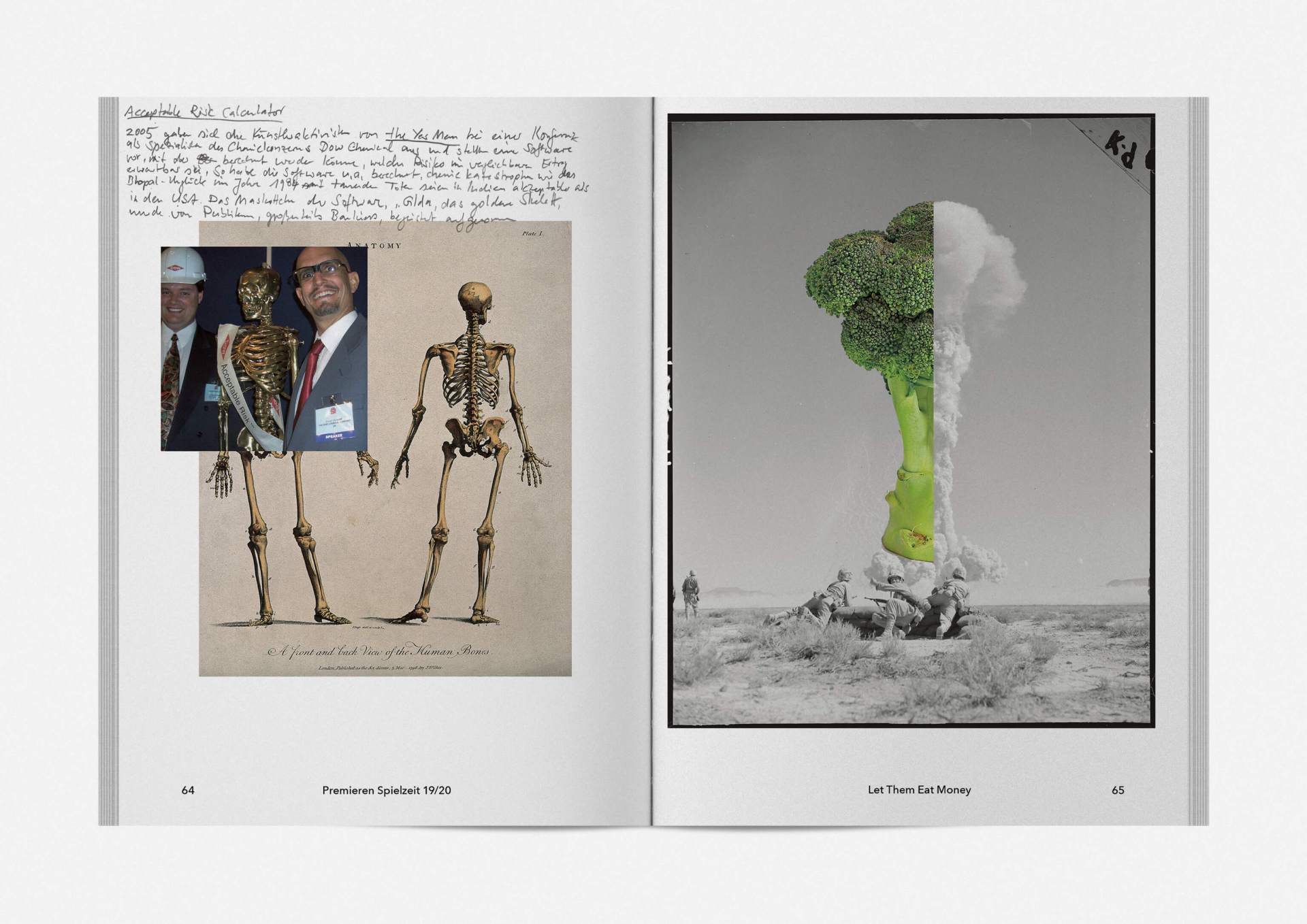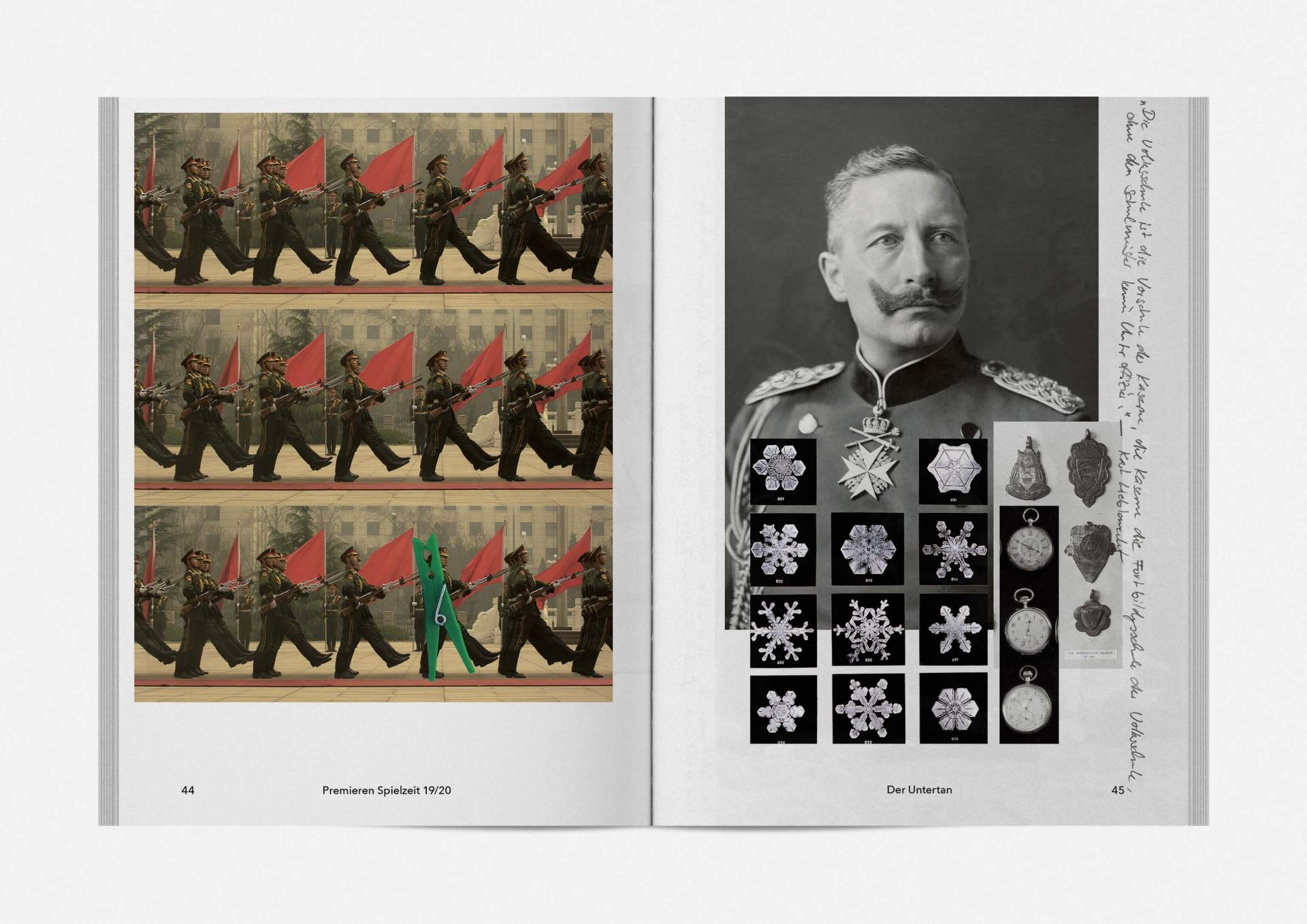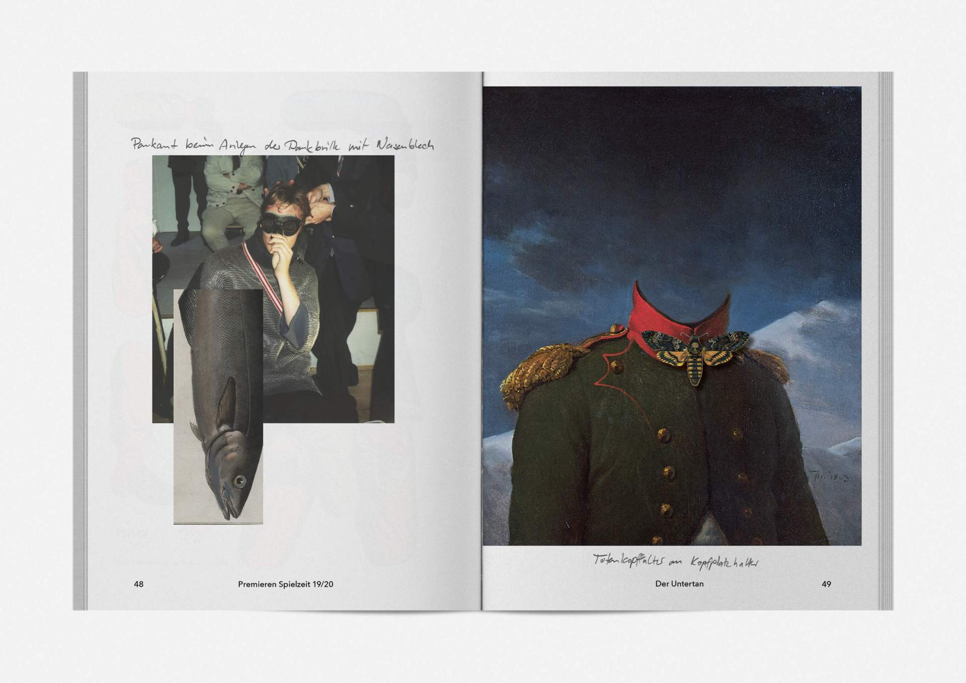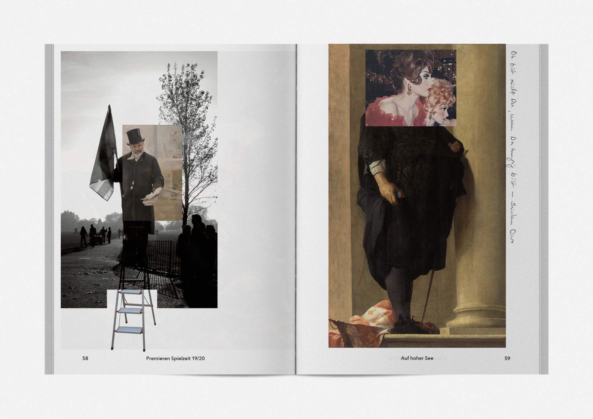 „An error has occurred“ — This is the motto under which the theater’s program and season booklet is created for 2019/20. It expresses the „not possible“ and „unimaginable“ in collages from the inexhaustible collection of images on the Internet. Freely available, copyright-free illustration material interweaves the familiar and the unfamiliar. In addition to the theatre texts in typographical New Objectivity, a non-verbal narrative level opens up in surrealist compositions.