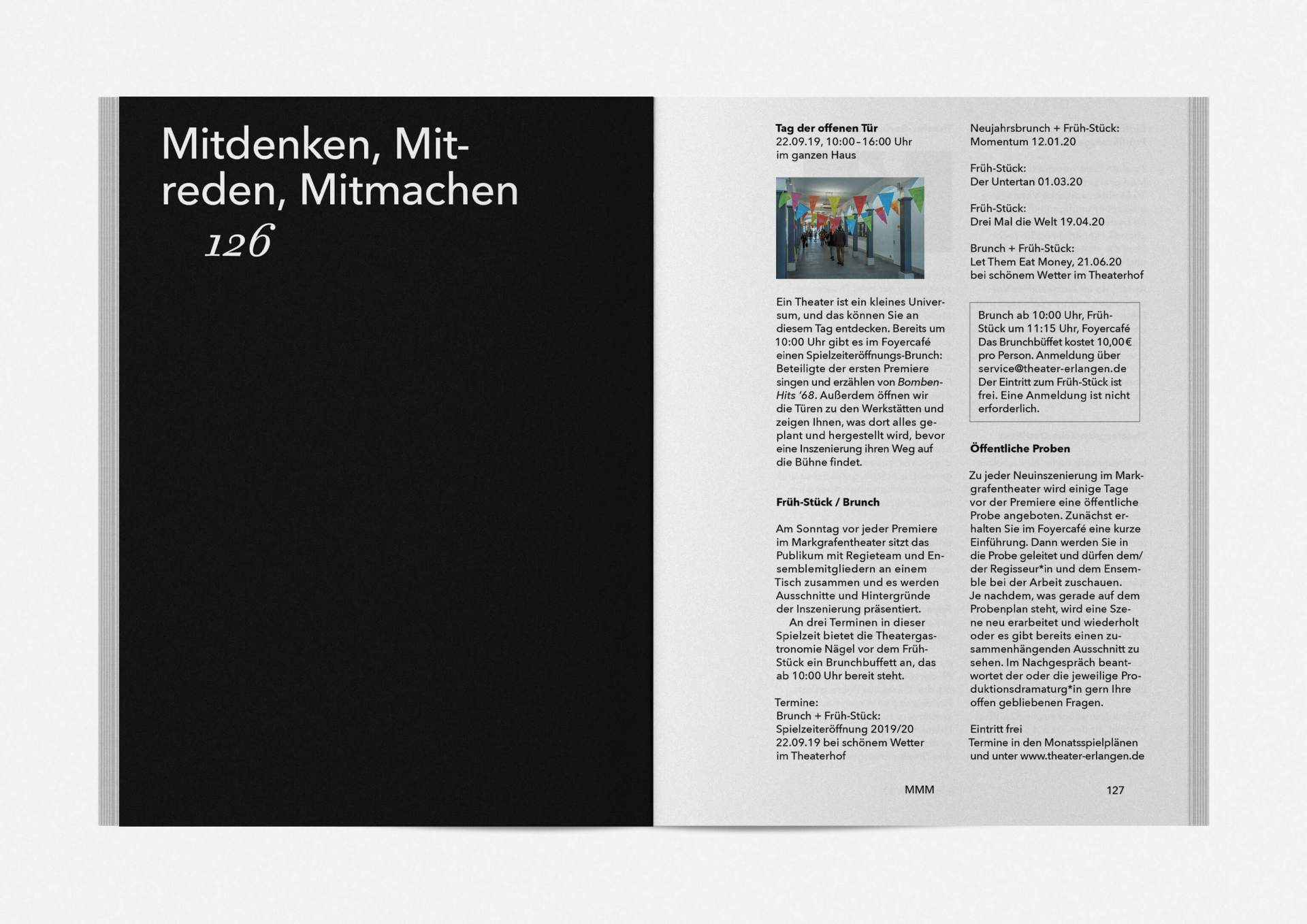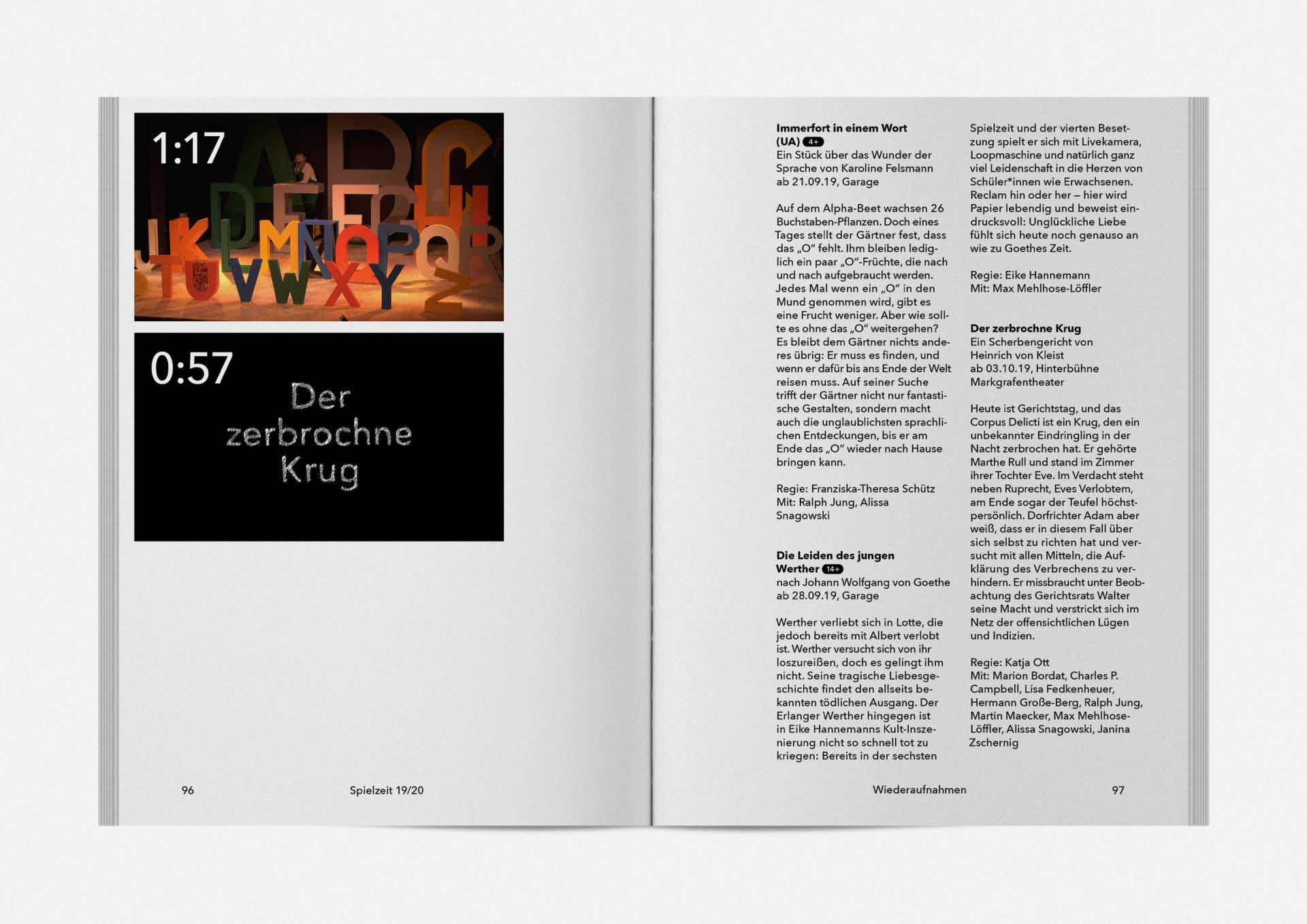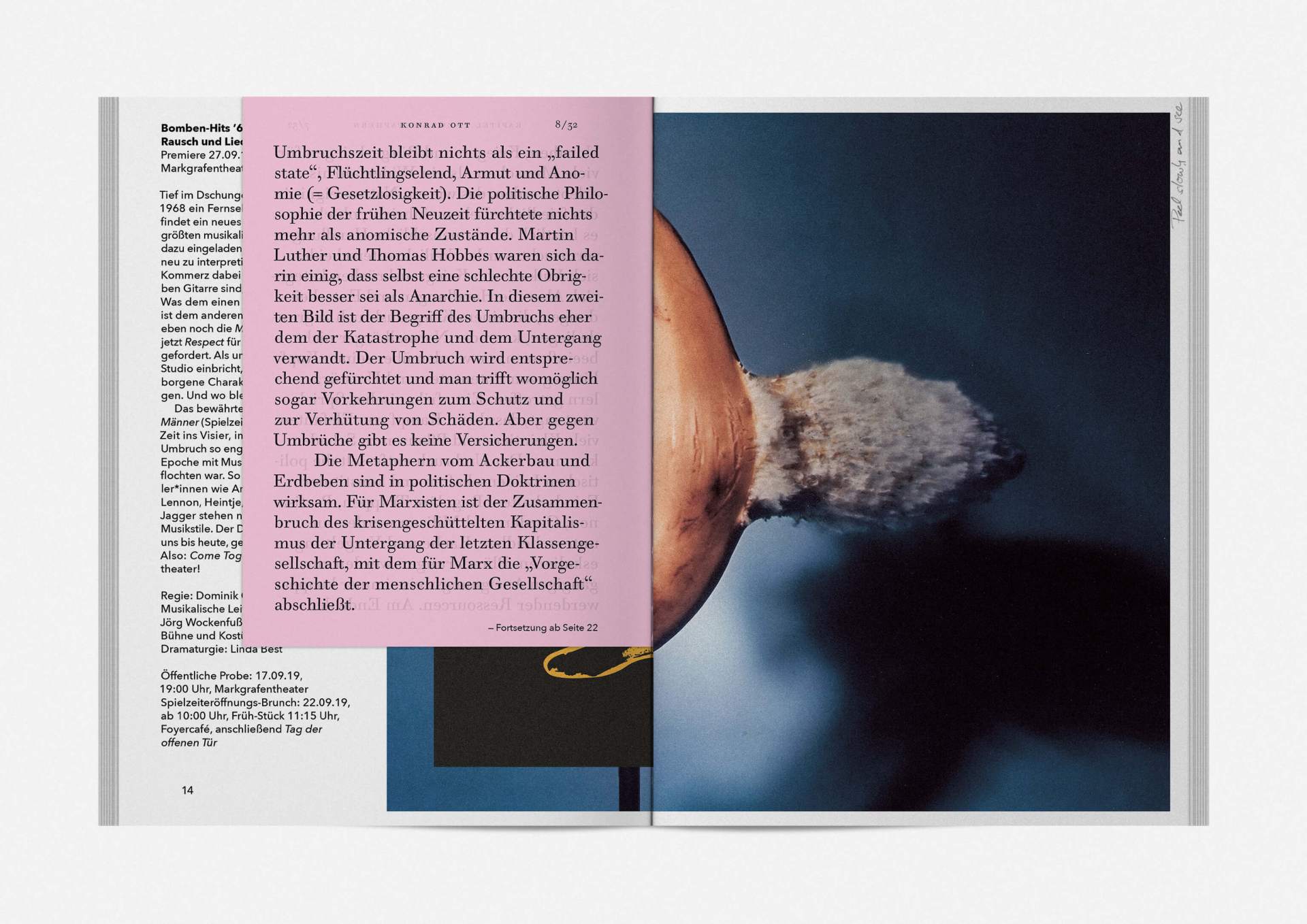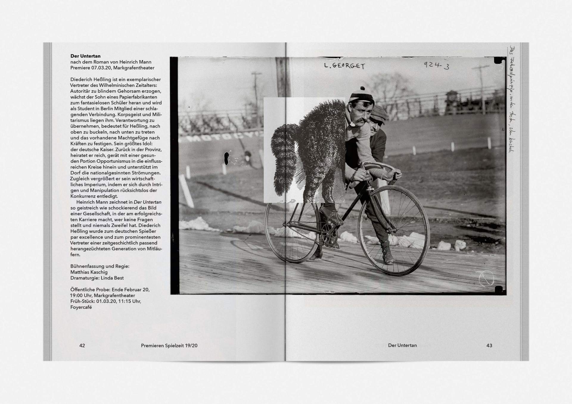 „An error has occurred“ — This is the motto under which the theater’s program and season booklet is created for 2019/20. It expresses the „not possible“ and „unimaginable“ in collages from the inexhaustible collection of images on the Internet. Freely available, copyright-free illustration material interweaves the familiar and the unfamiliar. In addition to the theatre texts in typographical New Objectivity, a non-verbal narrative level opens up in surrealist compositions.