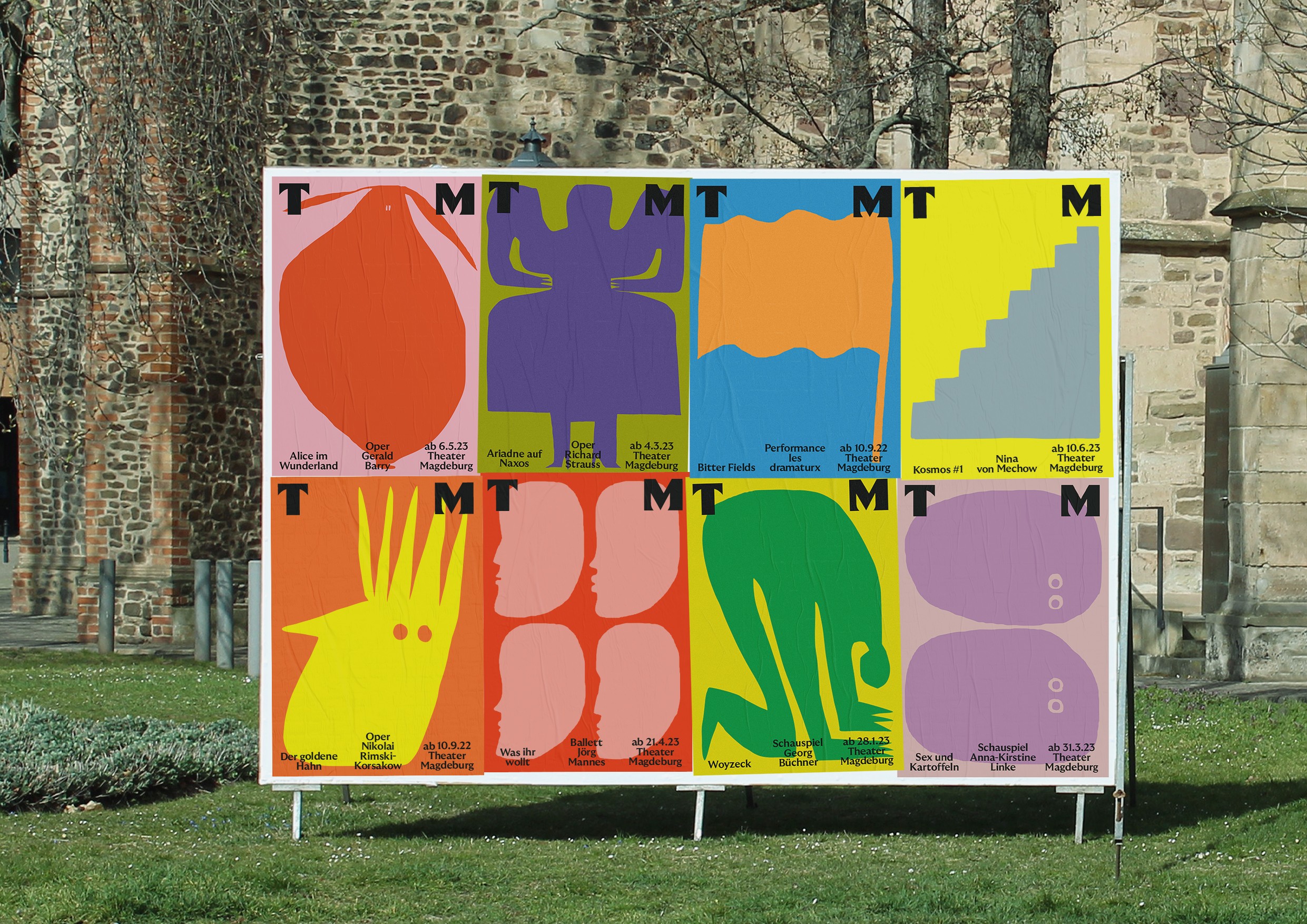 Theater Magdeburg’s posters support this path of constantly reinventing itself. At the same time, we wanted to create a format that was diverse, visually impactful, and at the same time, gave enough space to the respective productions. Accordingly, we looked for a simple, easy-to-use formula and found it in bold illustrative elements that are modular, scalable, and transferable.